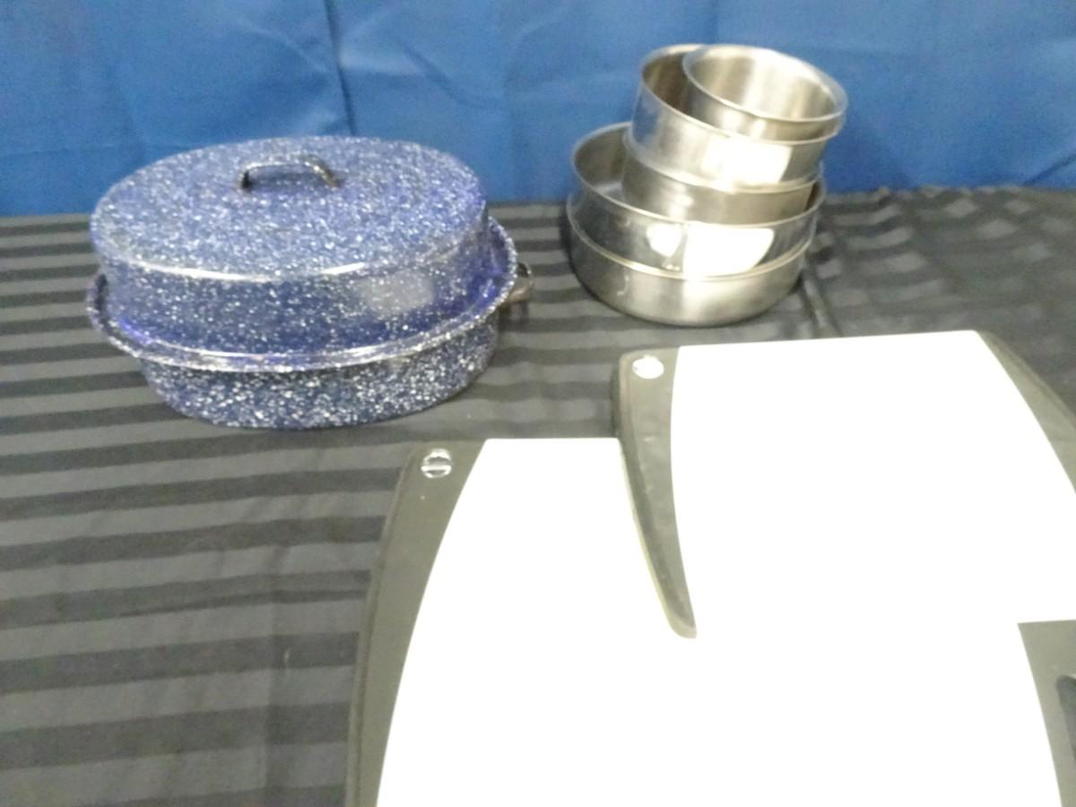ROASTER PAN, MIXING BOWLS TWO CUTTING BOARDS