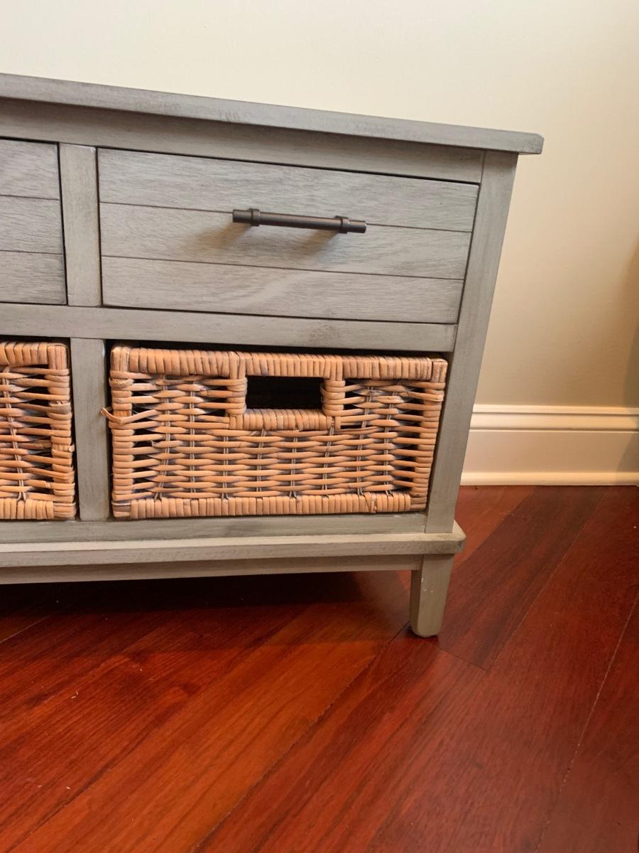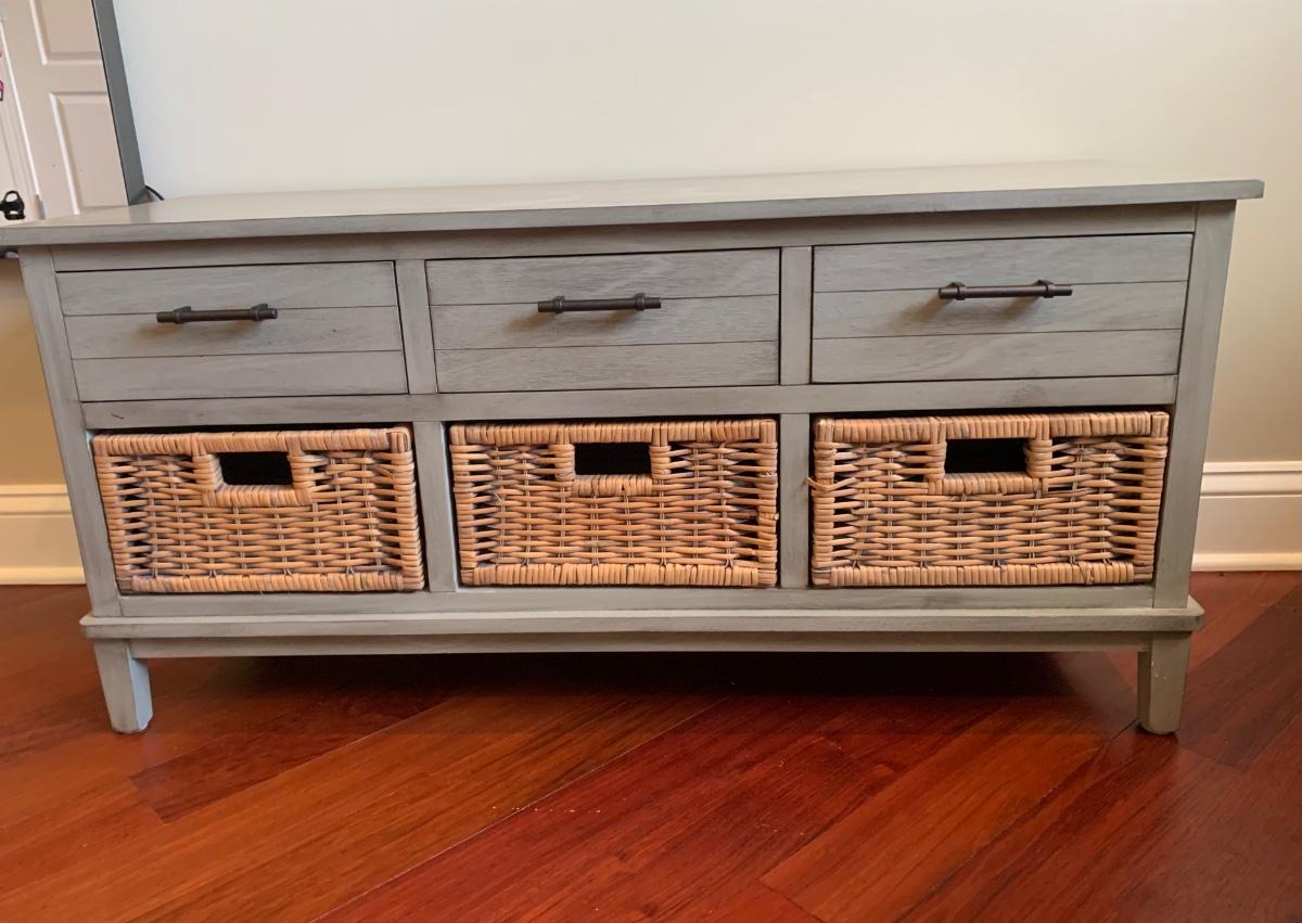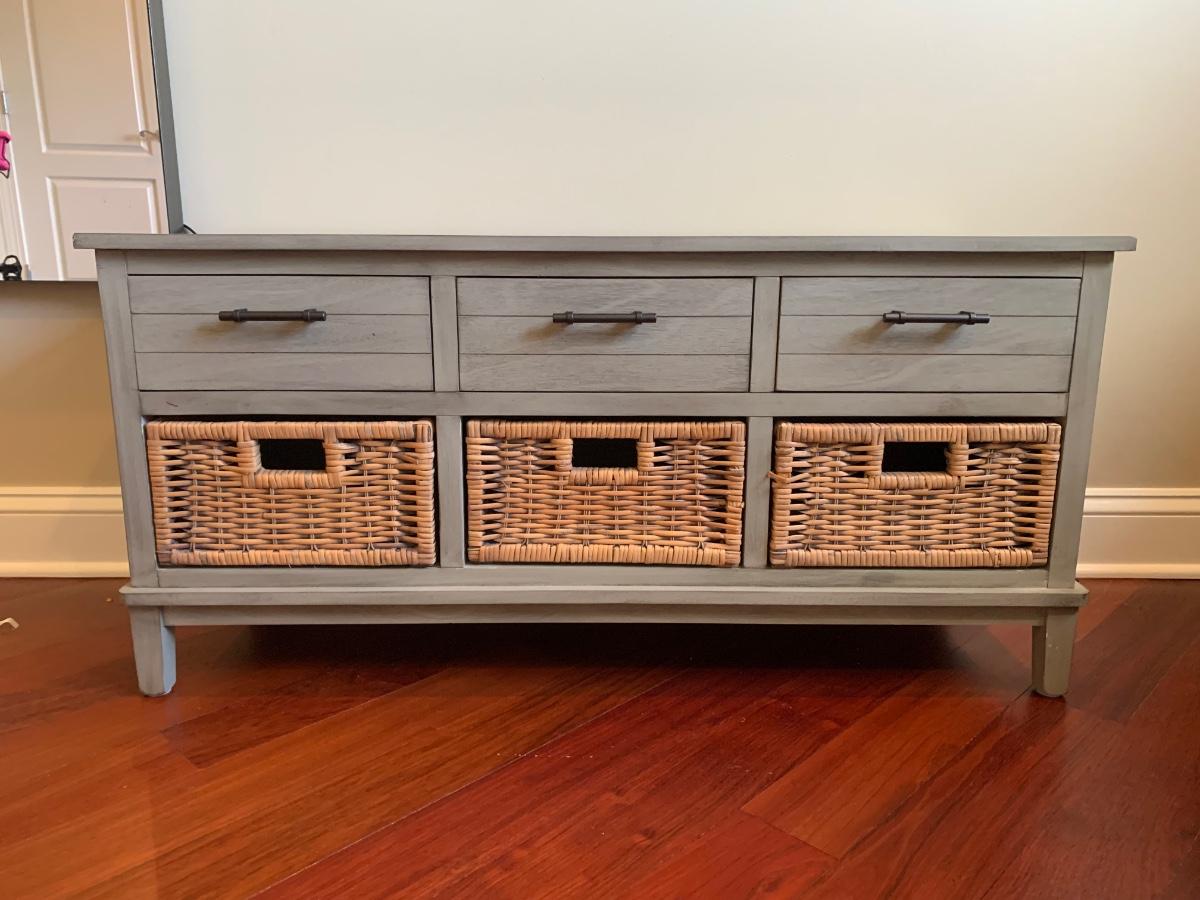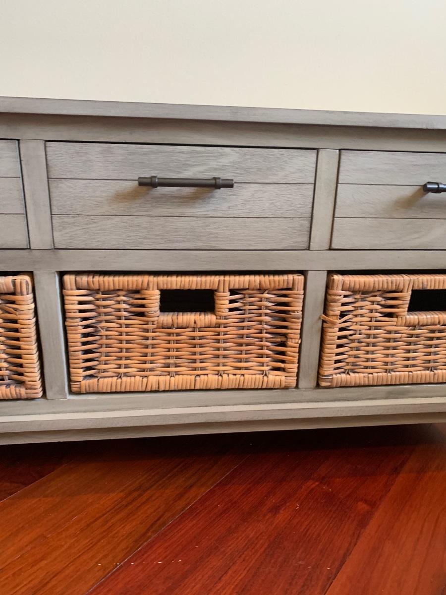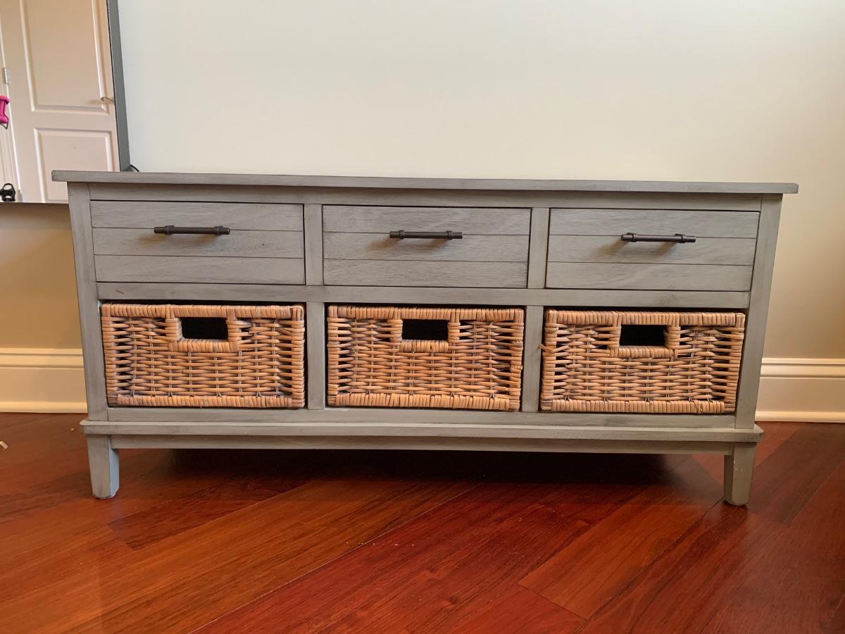 Gray storage bench in nice condition however baskets have wear (pictured) Measures 42x15x20