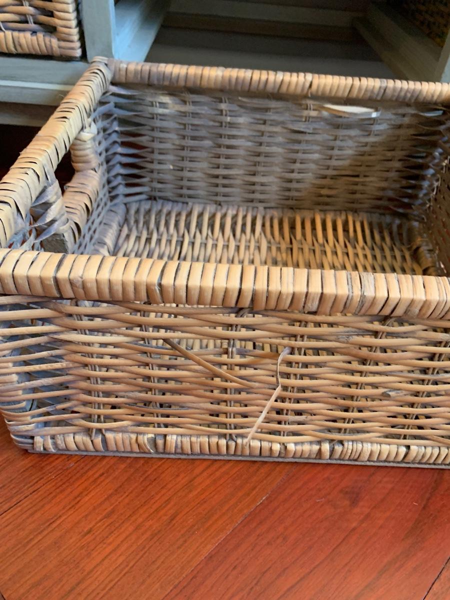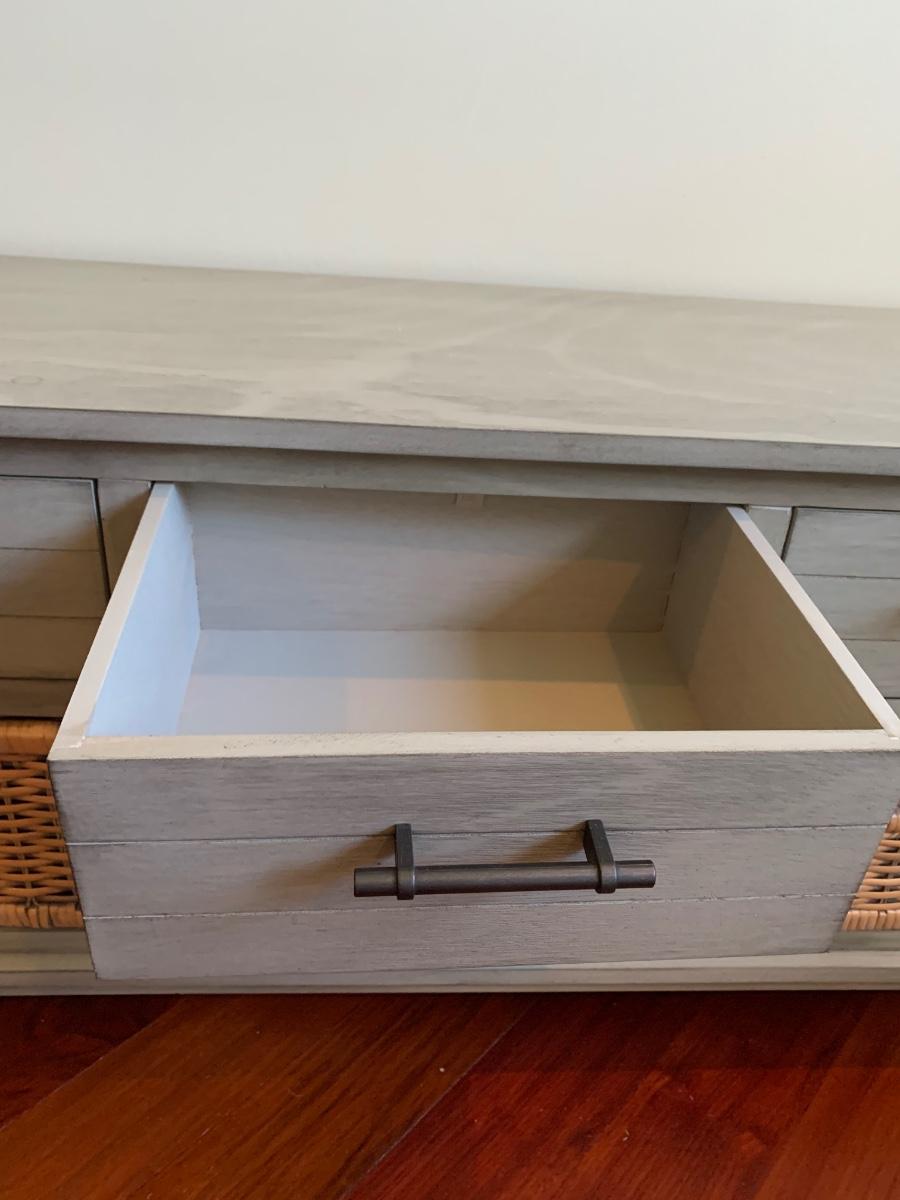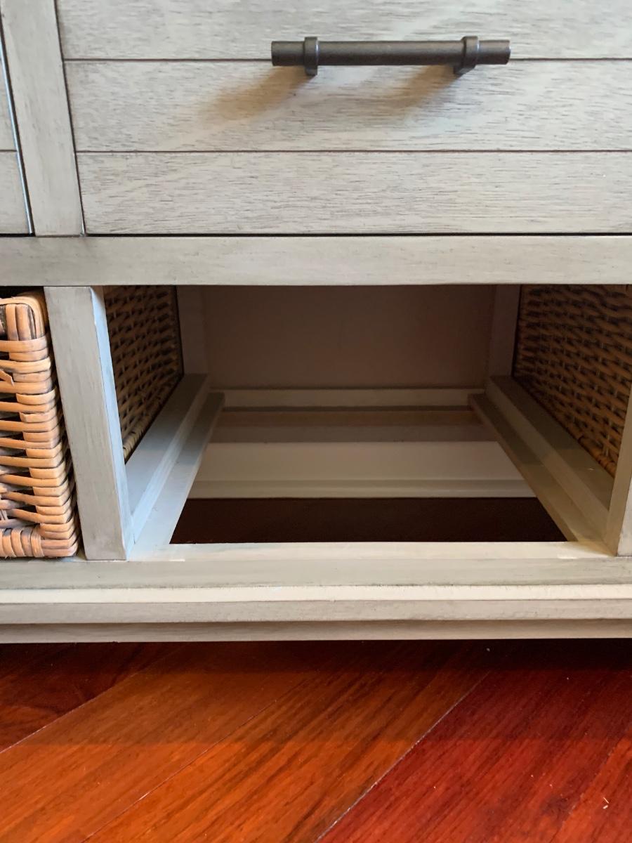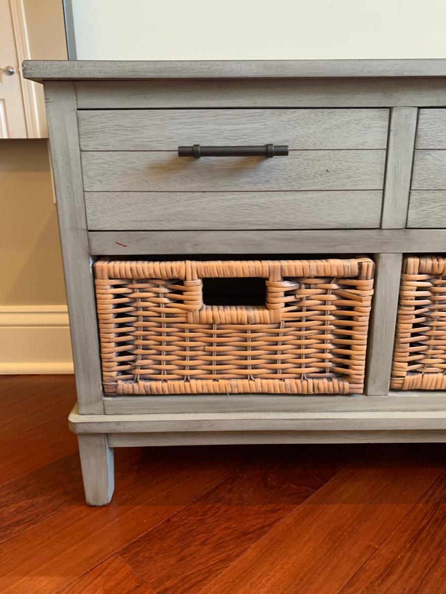 Gray storage bench in nice condition however baskets have wear (pictured) Measures 42x15x20