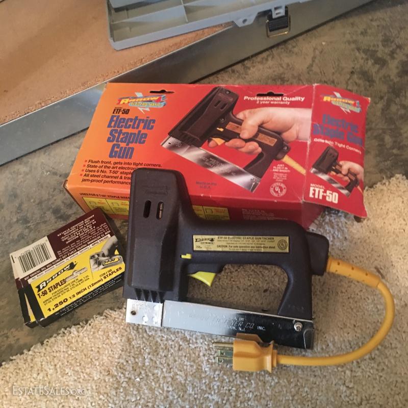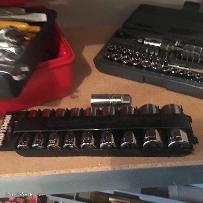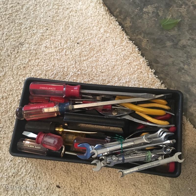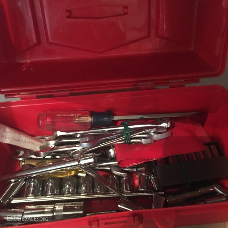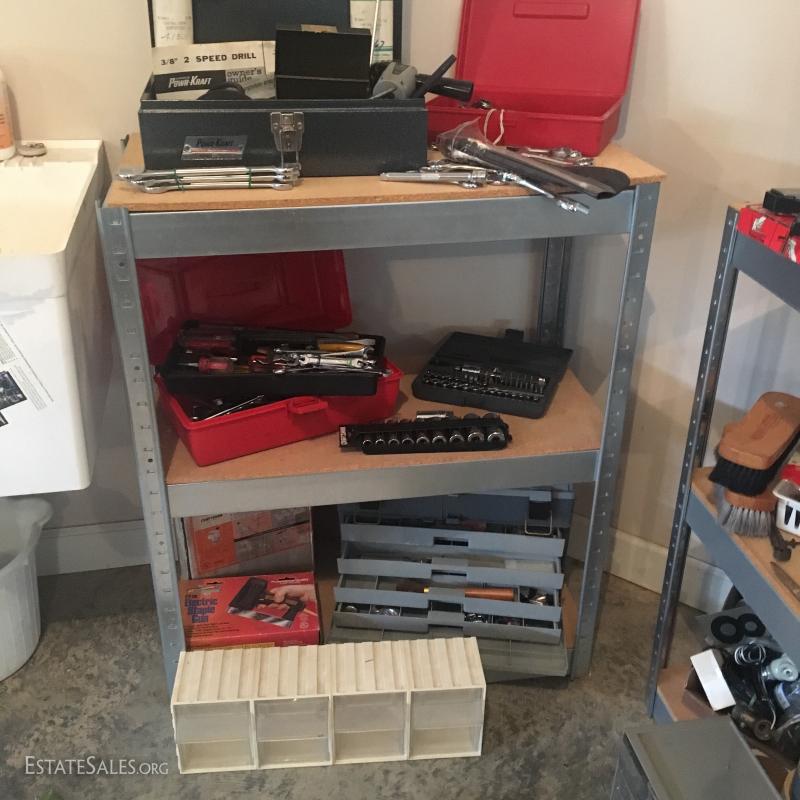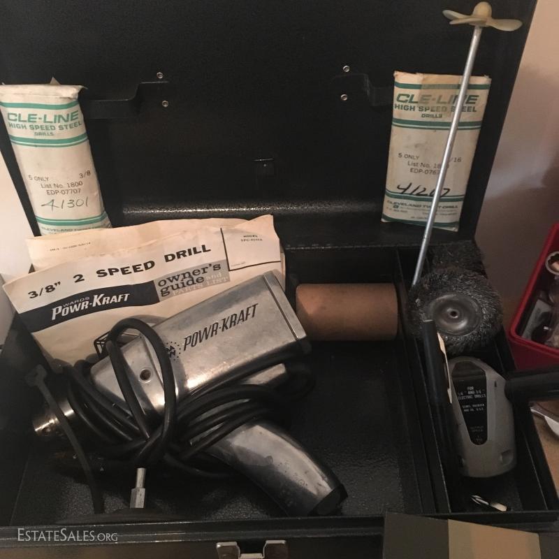 Wards Power-Kraft 3/8", 2 speed drill, Craftmans sockets and other assorted tools, electric staple gun, Bench top and more.