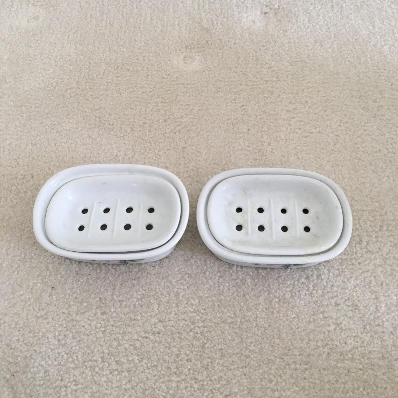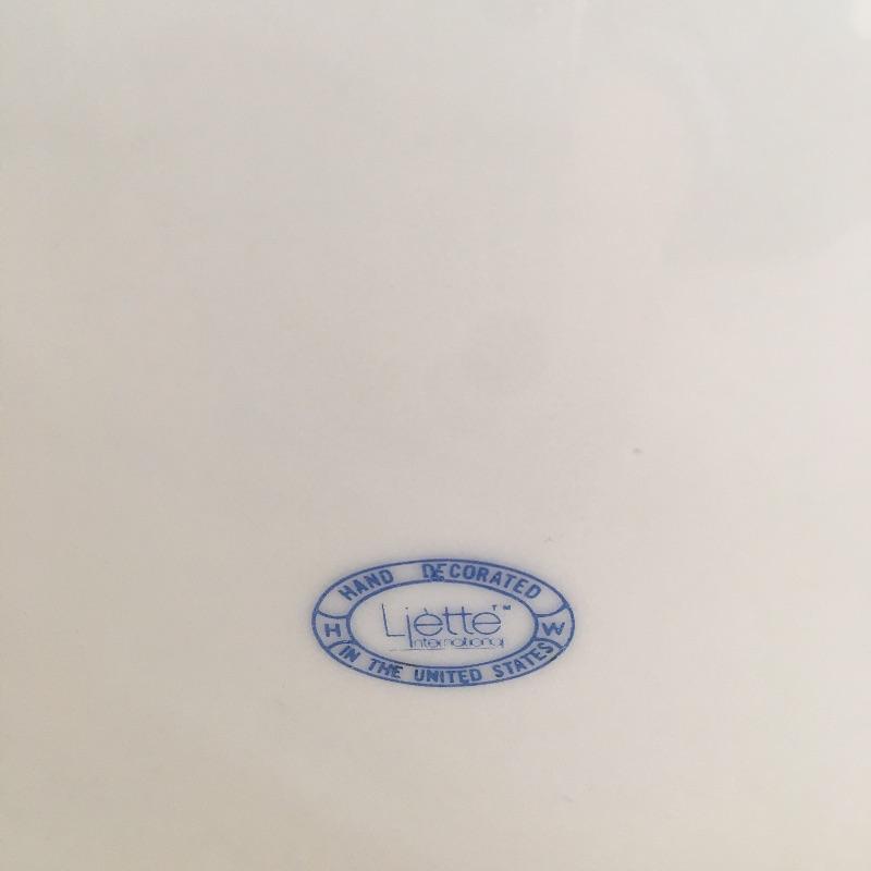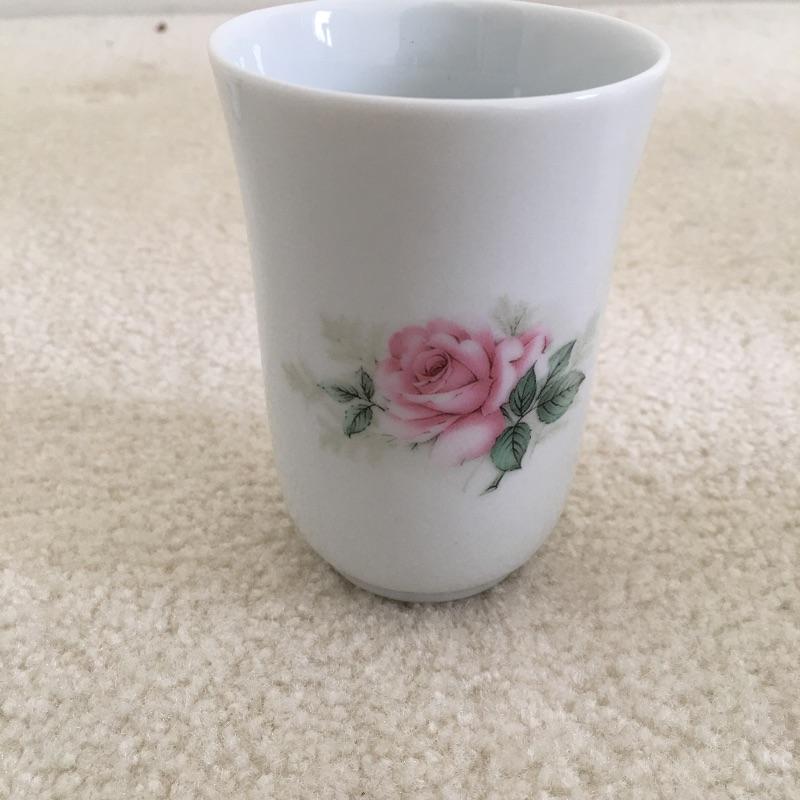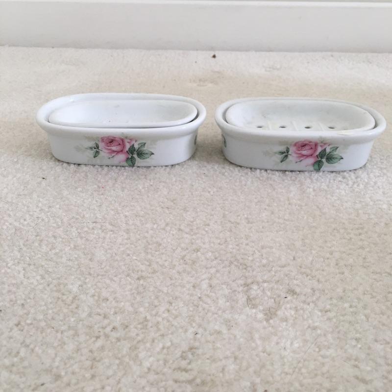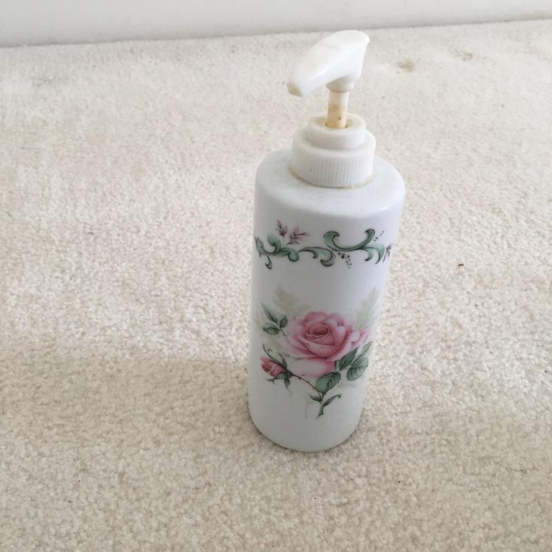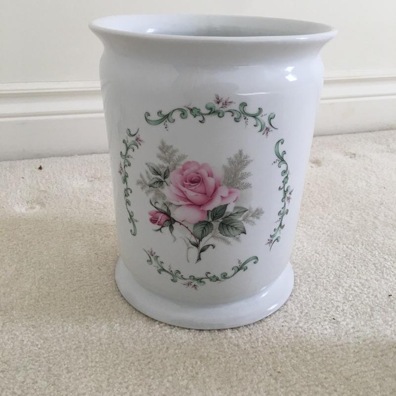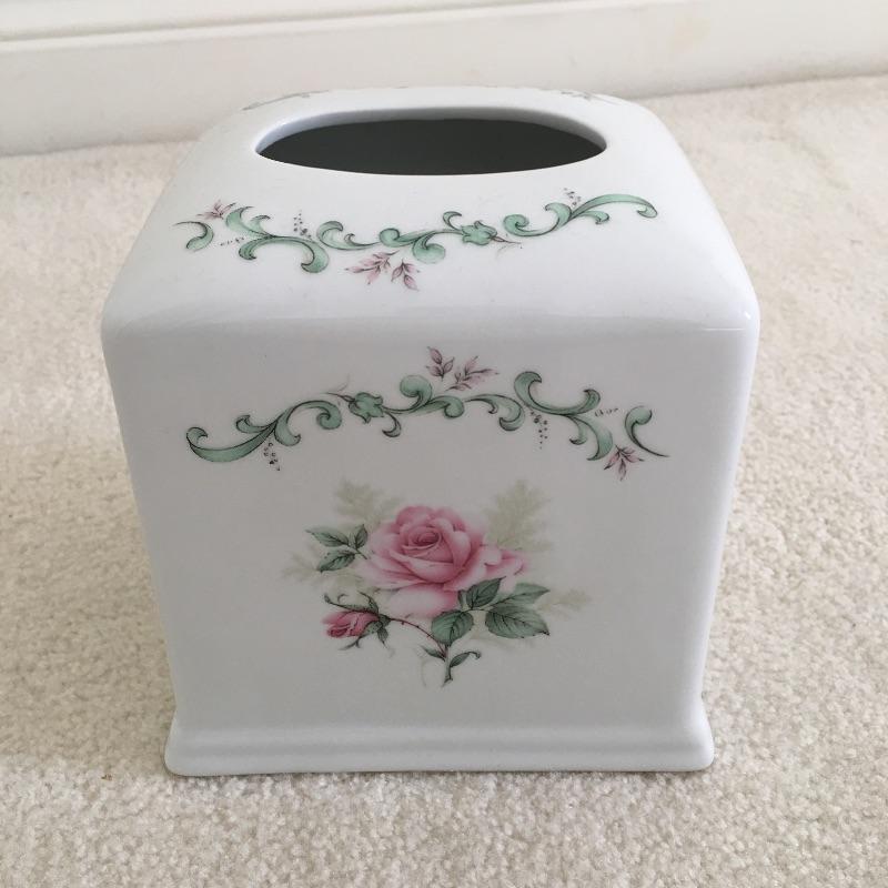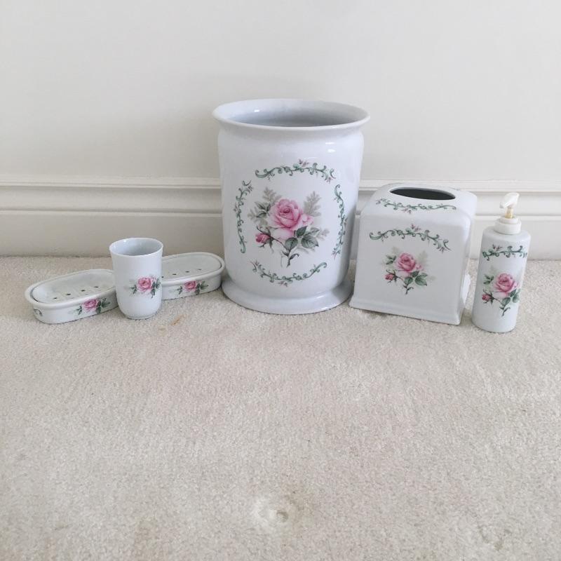 Bathroom essentials includes ceramic wastebasket, tissue cover, two soap dishes, cup and lotion dispenser all the in a pink rose design hand decorated by Liétte. Wastebasket measures 8.25”D x 10” tall.