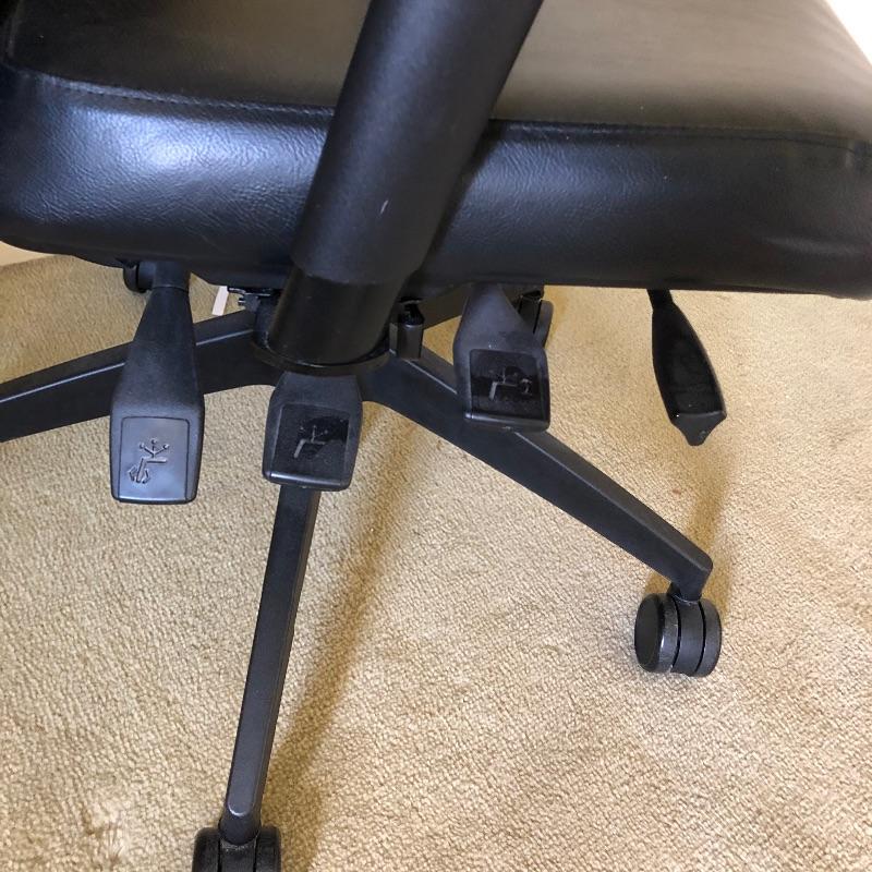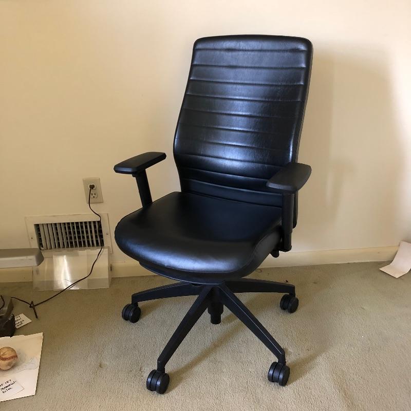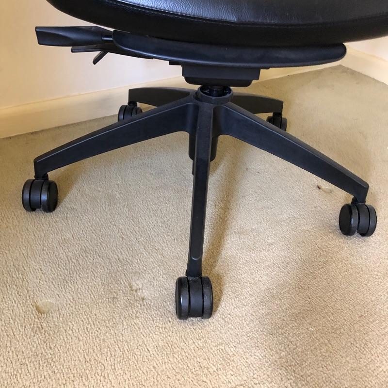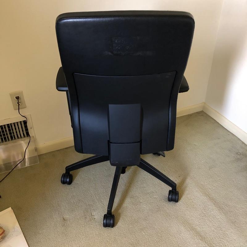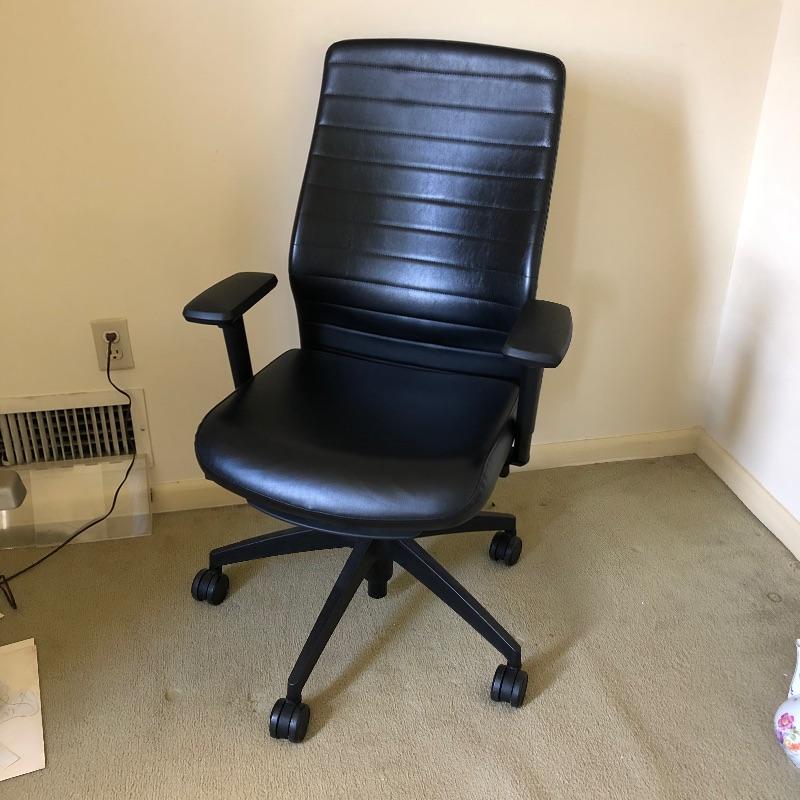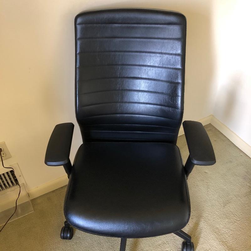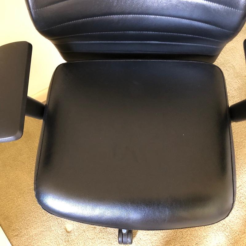 This black office chair is in impeccable condition. Made of faux leather, it has numerous levers to alter height, backrest tilt and more allowing you to find optimal comfort settings and lock it.