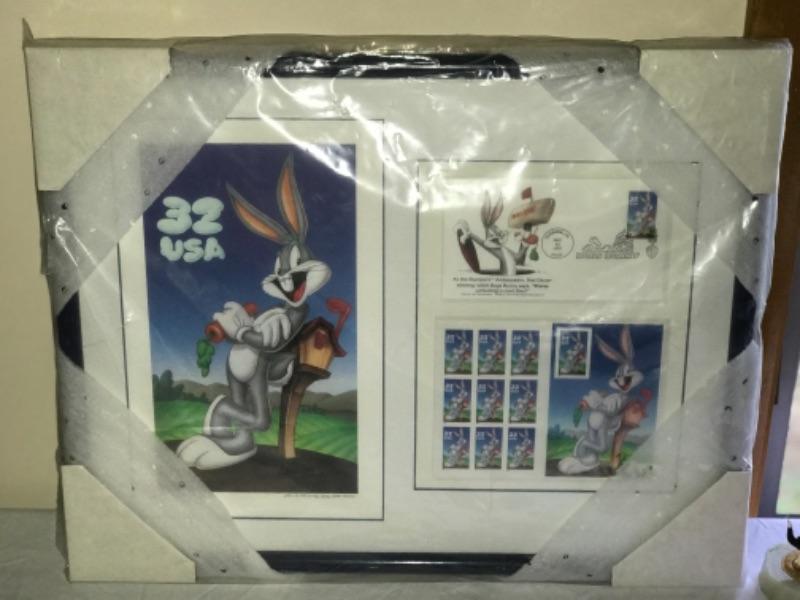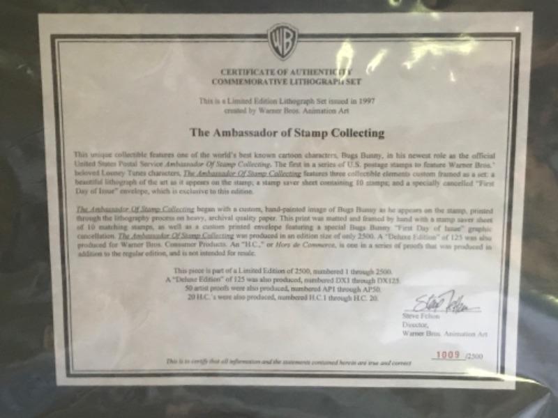 Bugs Bunny “The Ambassador of Stamp Collecting” lithograph set. Set includes a lithograph of the Art used for stamp, stamp saver sheet with 10 stamps and a cancelled “Forst Day of Issue” envelope exclusive to this edition. Measures 21”x16”, numbered 1009/2500 and comes with certificate of authenticity