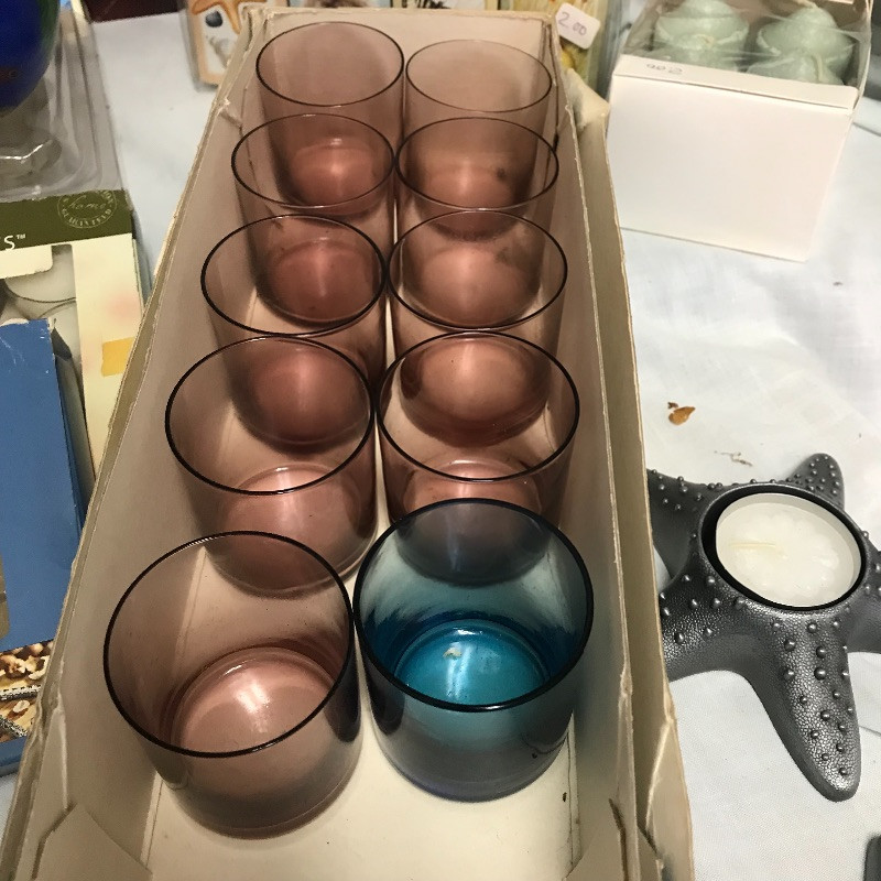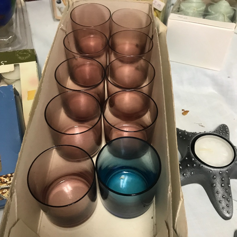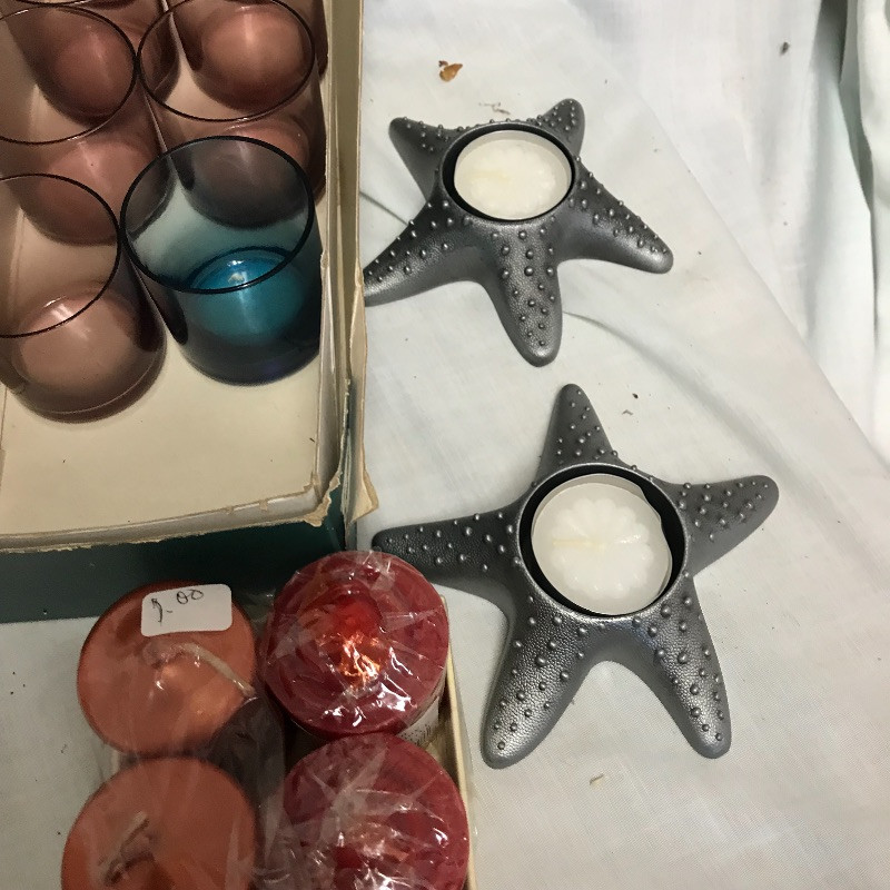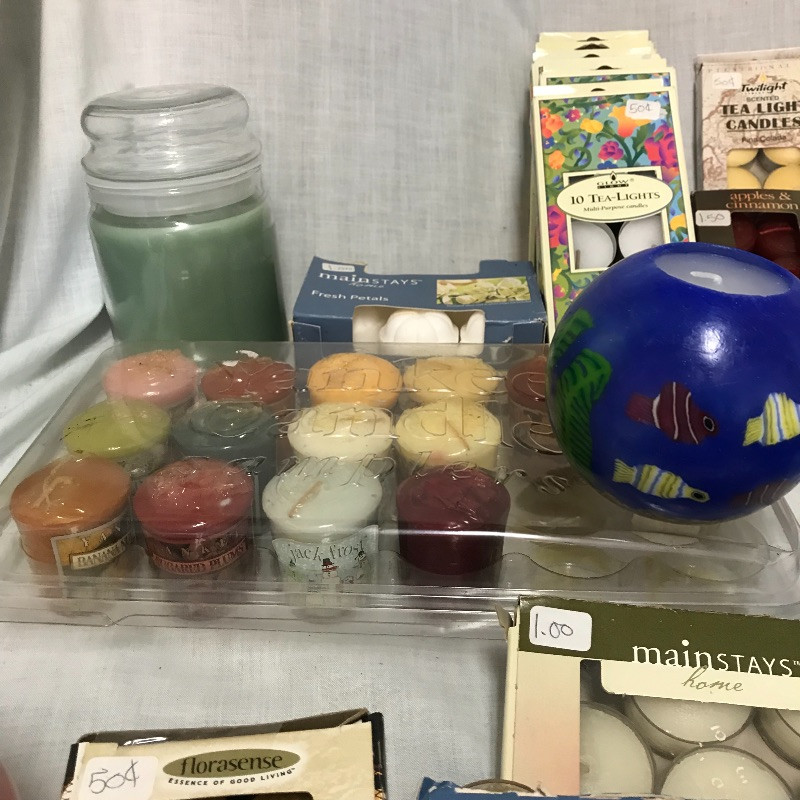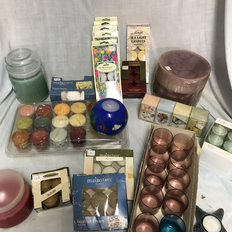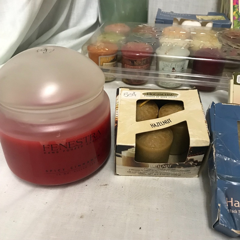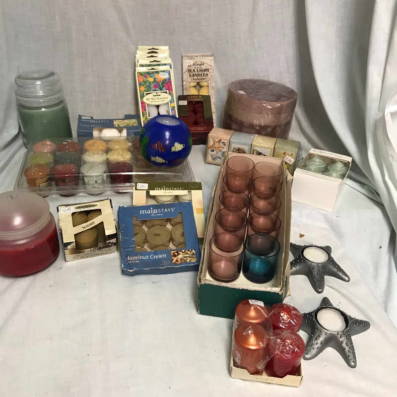 You can set the mood in every room with this large lot of unused candles. Includes tea lights, votives, jar and decorative candles. Many are scented and some indented (mostly the votive). A number of glass votive holders and a pair of metal star fish tea light holders as well. Local pick up only.