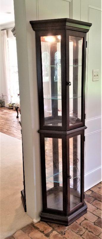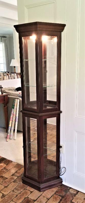 This piece matches the one in Lot #135 - 70" tall, 22.5" across. Lighted - glass shelves. There is a bit of scratching, etc at the base (see photos).