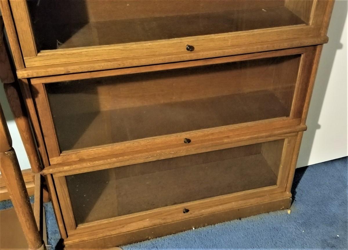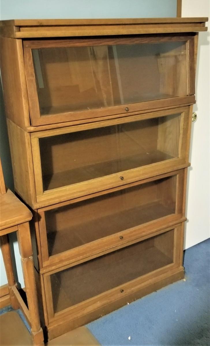 Contemporary Barrister style bookcase - 4 sections - Top glass front needs small repair to frame for front to stay open (see photo). 34" across, 10.5" deep, 56.5" tall.