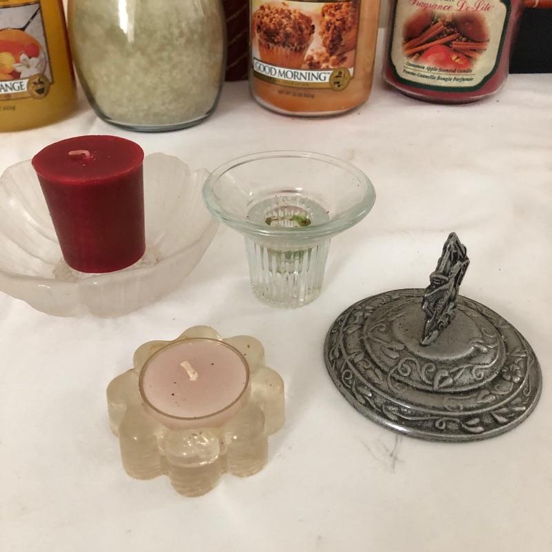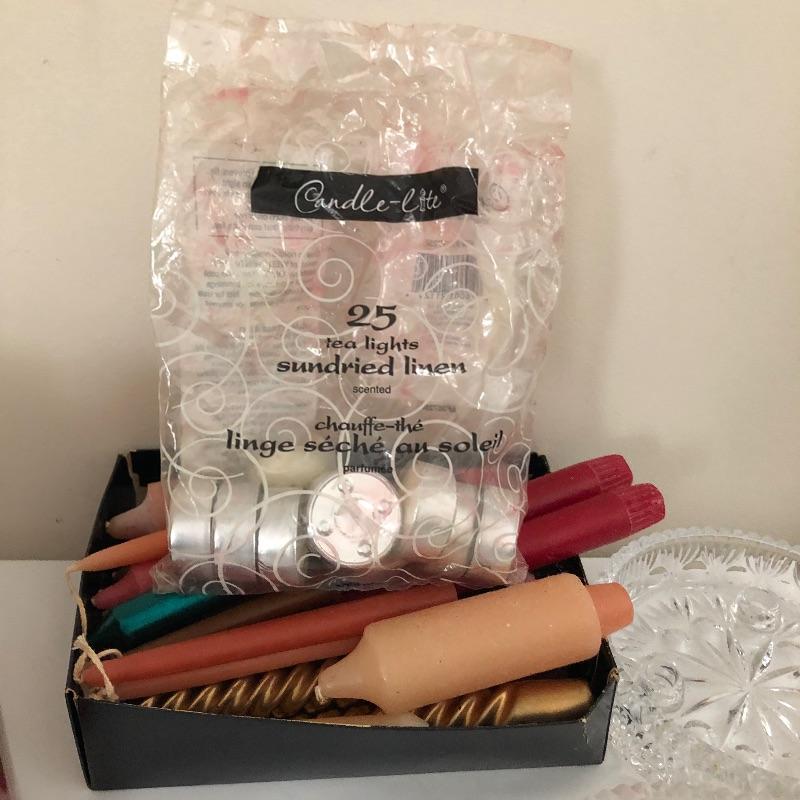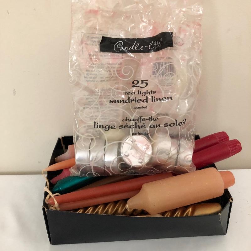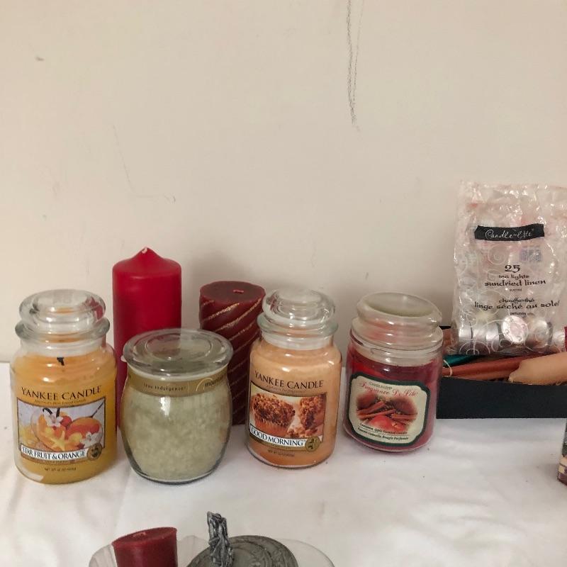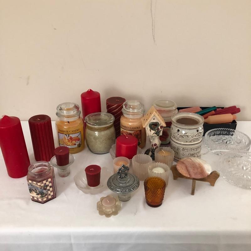 A large assortment of candles in this lot that include Yankee candles, candle burner, ceramic birdhouse tea light holder, tea lights, taper candles, votives, soapstone on a wood stand and much more, see images.