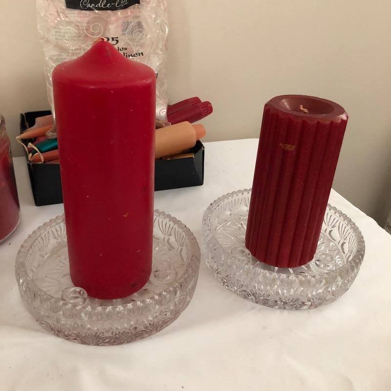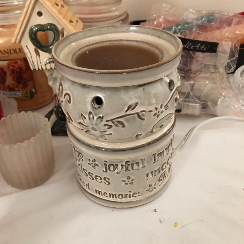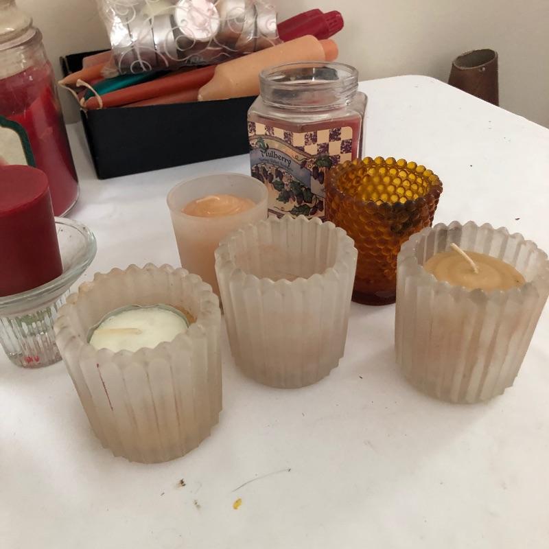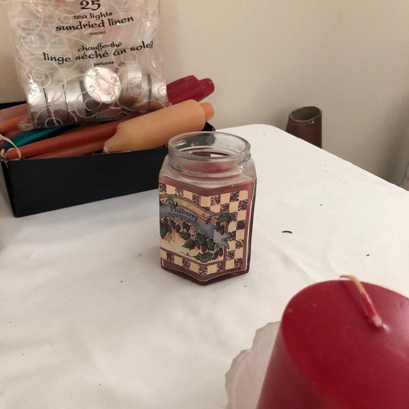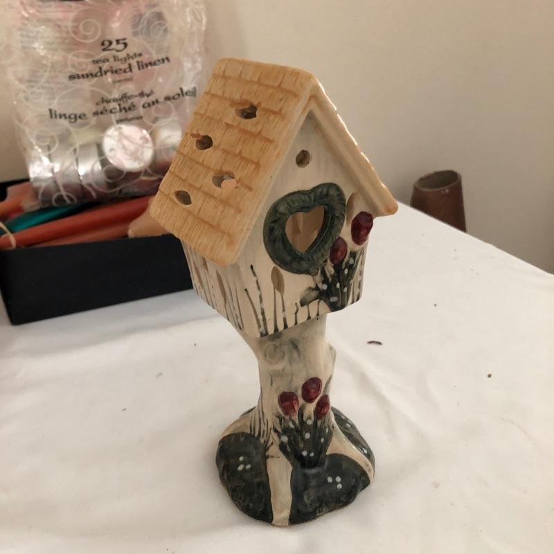 A large assortment of candles in this lot that include Yankee candles, candle burner, ceramic birdhouse tea light holder, tea lights, taper candles, votives, soapstone on a wood stand and much more, see images.