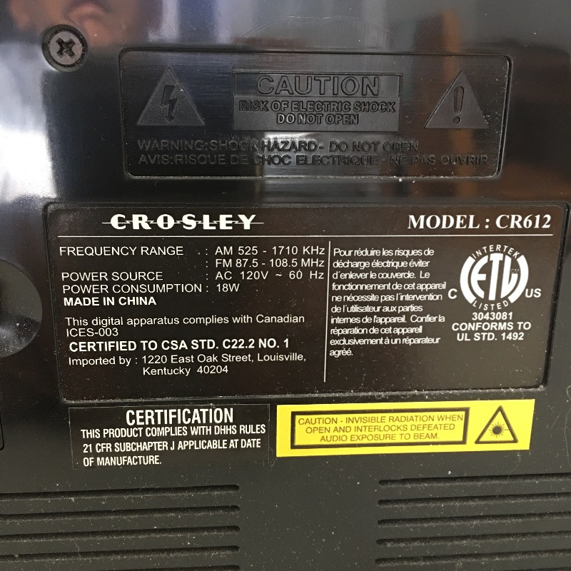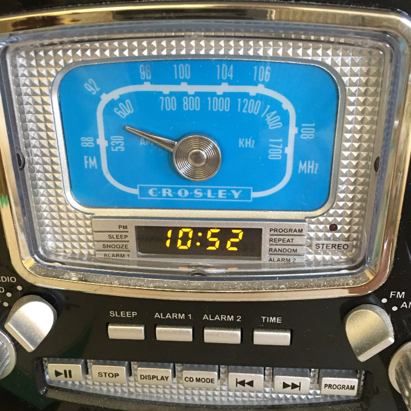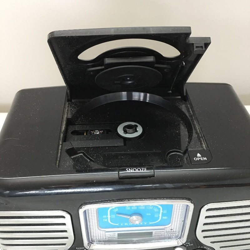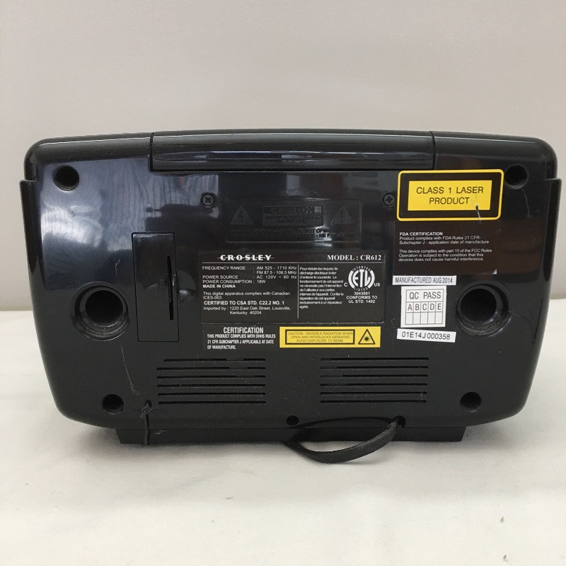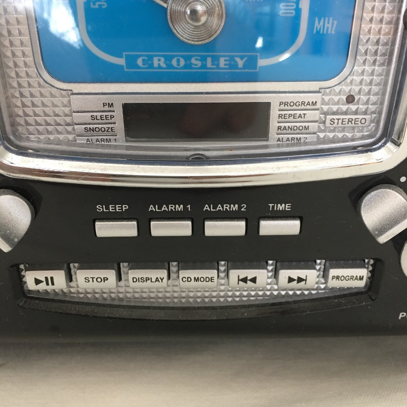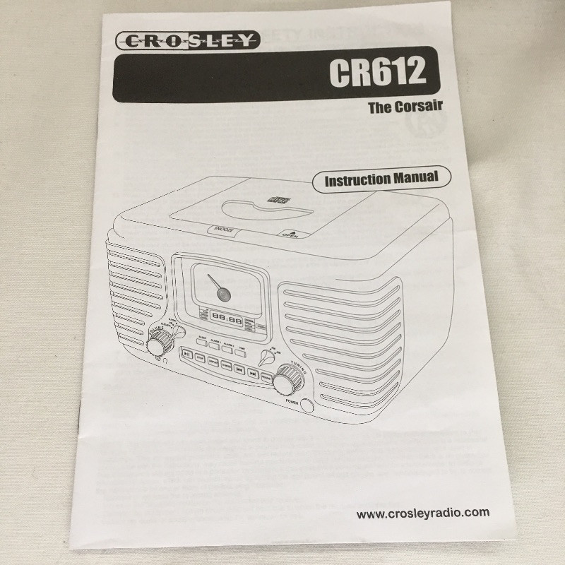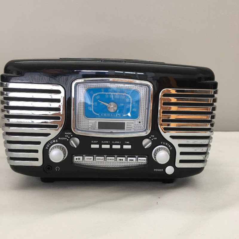 Crosley CR612 Corsair CD, radio and alarm clock. Get the retro look with the modern conveniences with this handsome looking radio. Radio measures 6.75” x 11” x 7”.