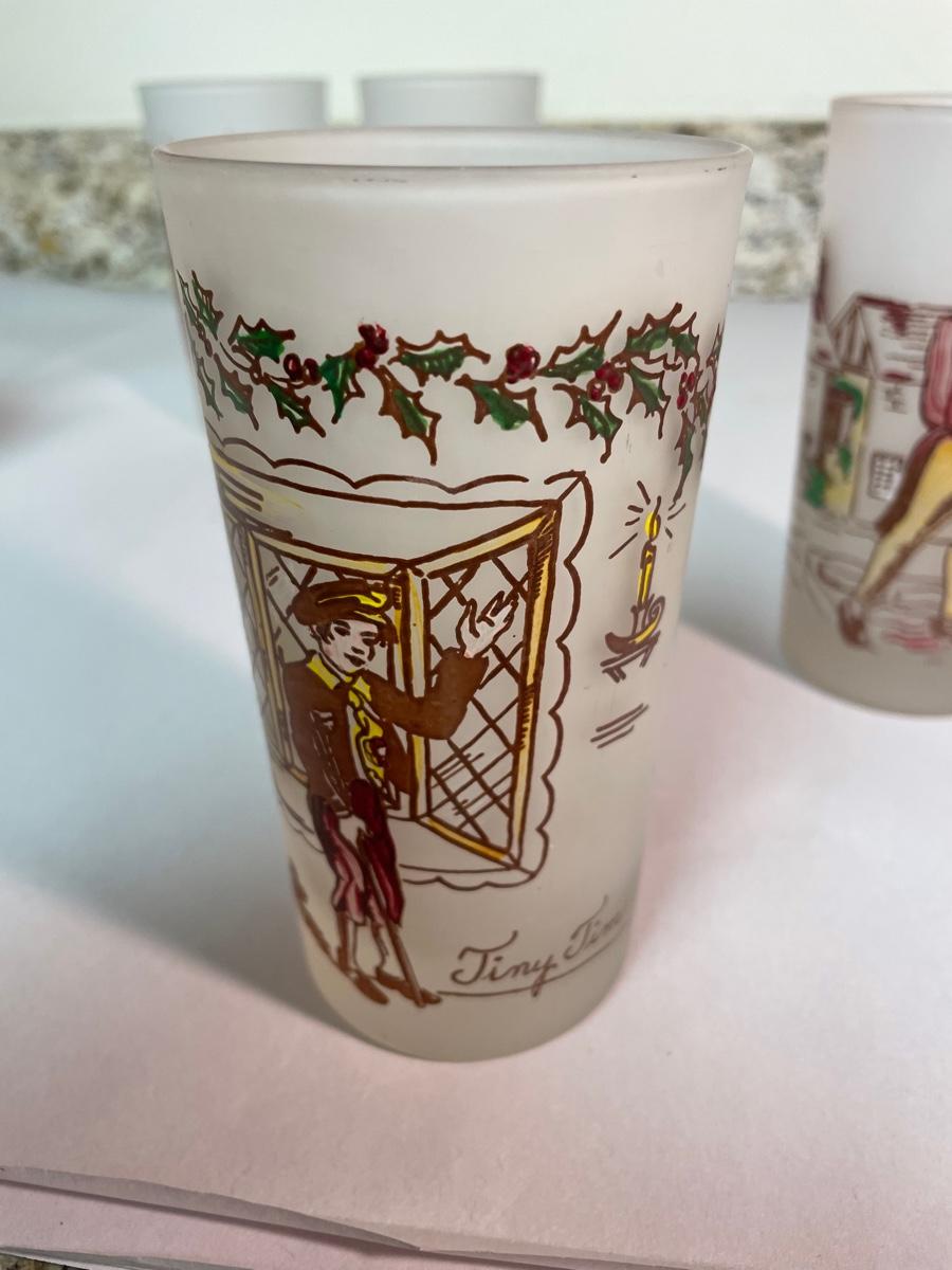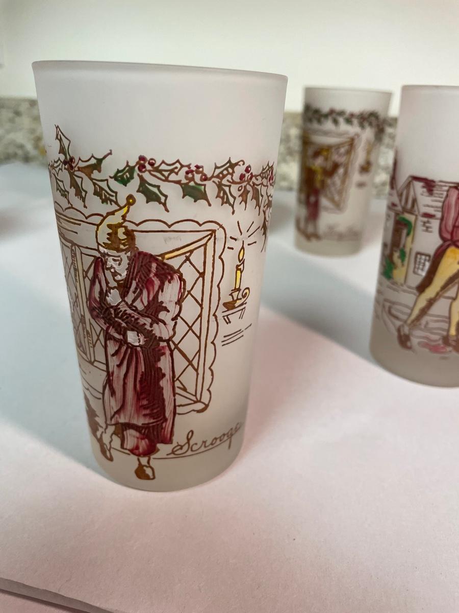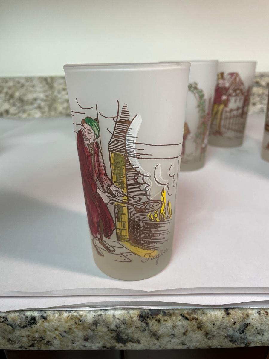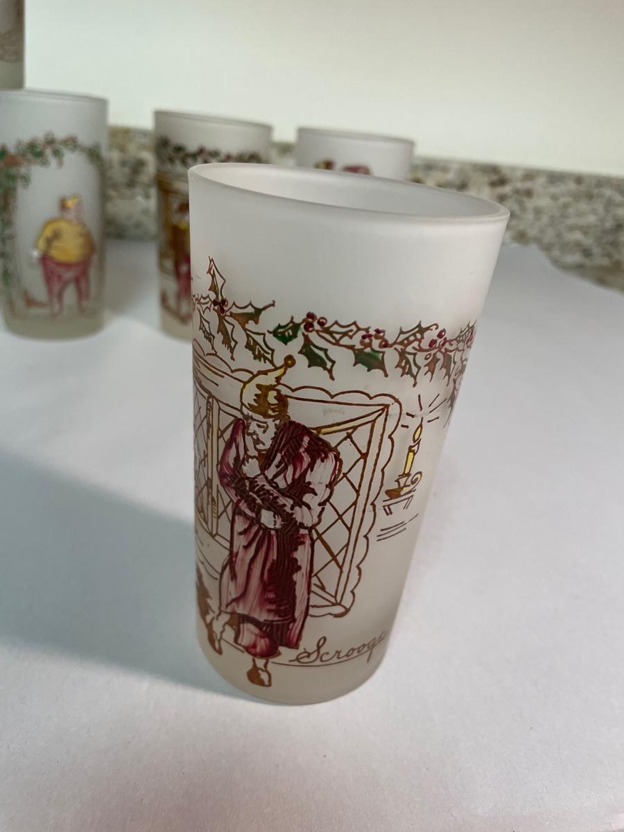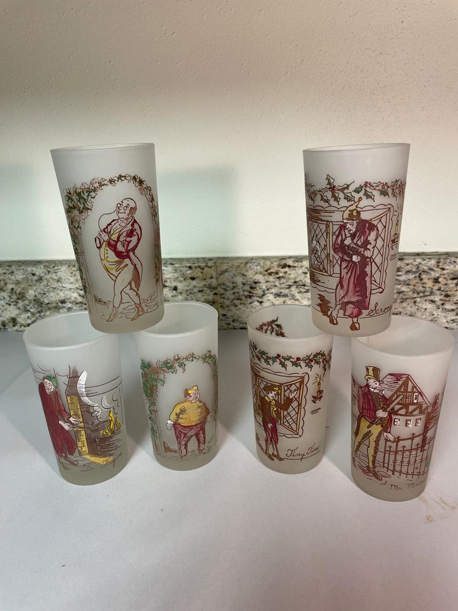 set of 6 frosted glasses commemorating characters from "A Christmas Carol"