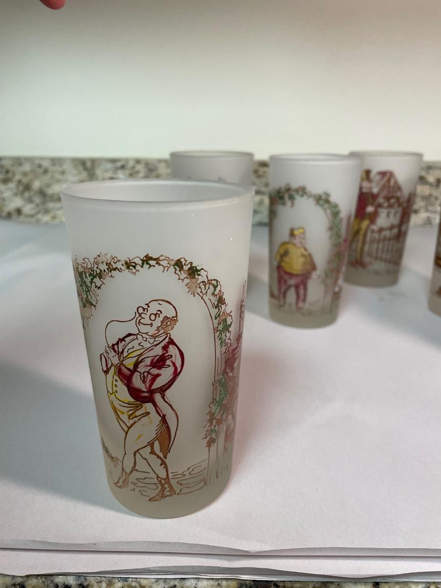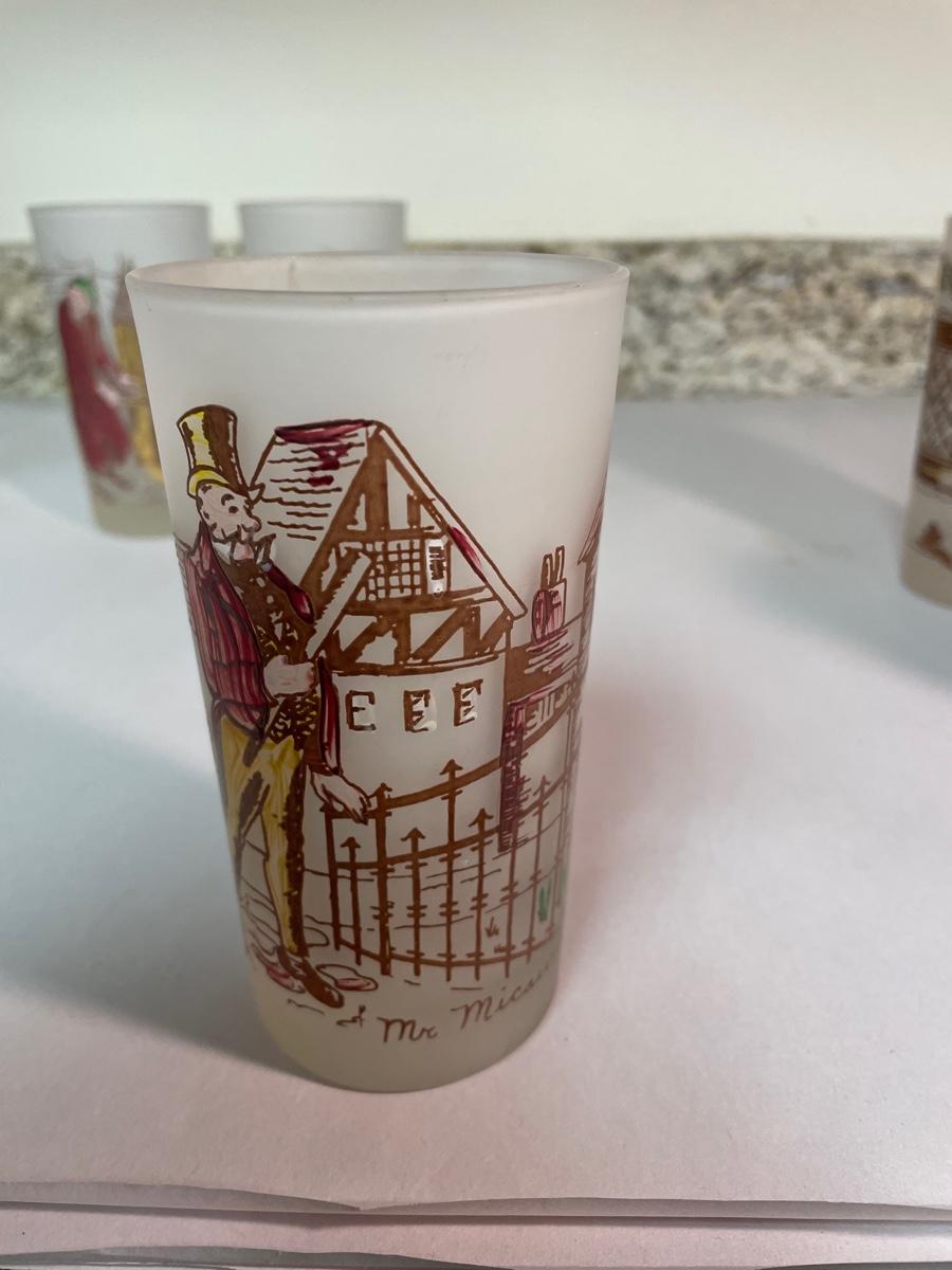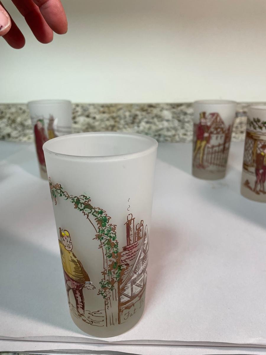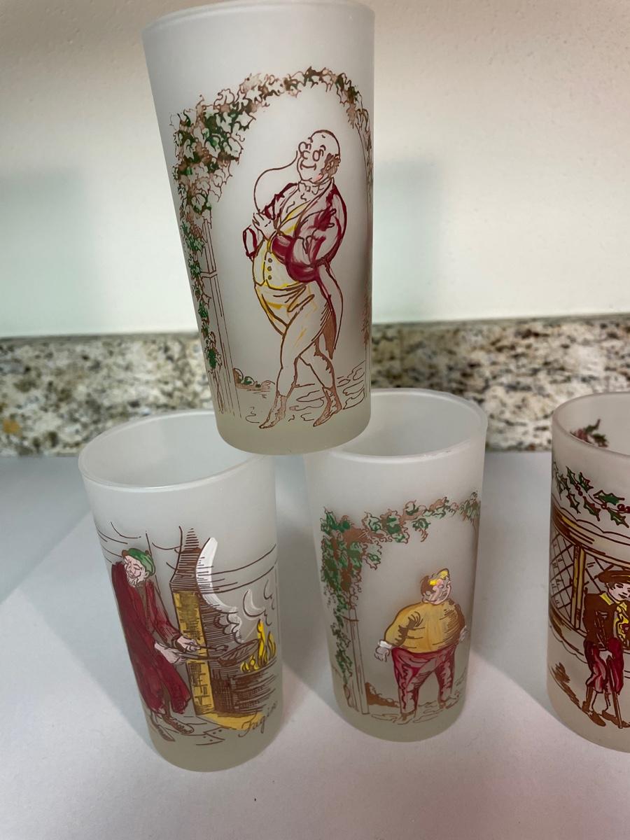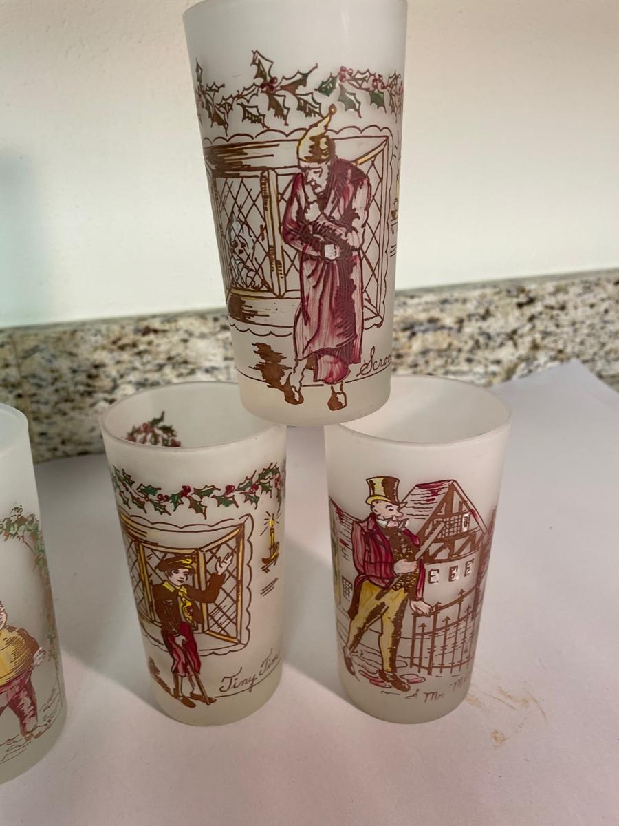 set of 6 frosted glasses commemorating characters from "A Christmas Carol"