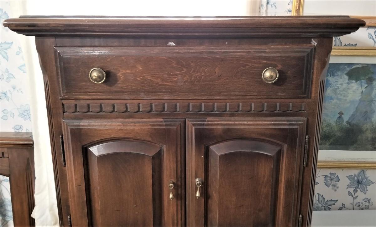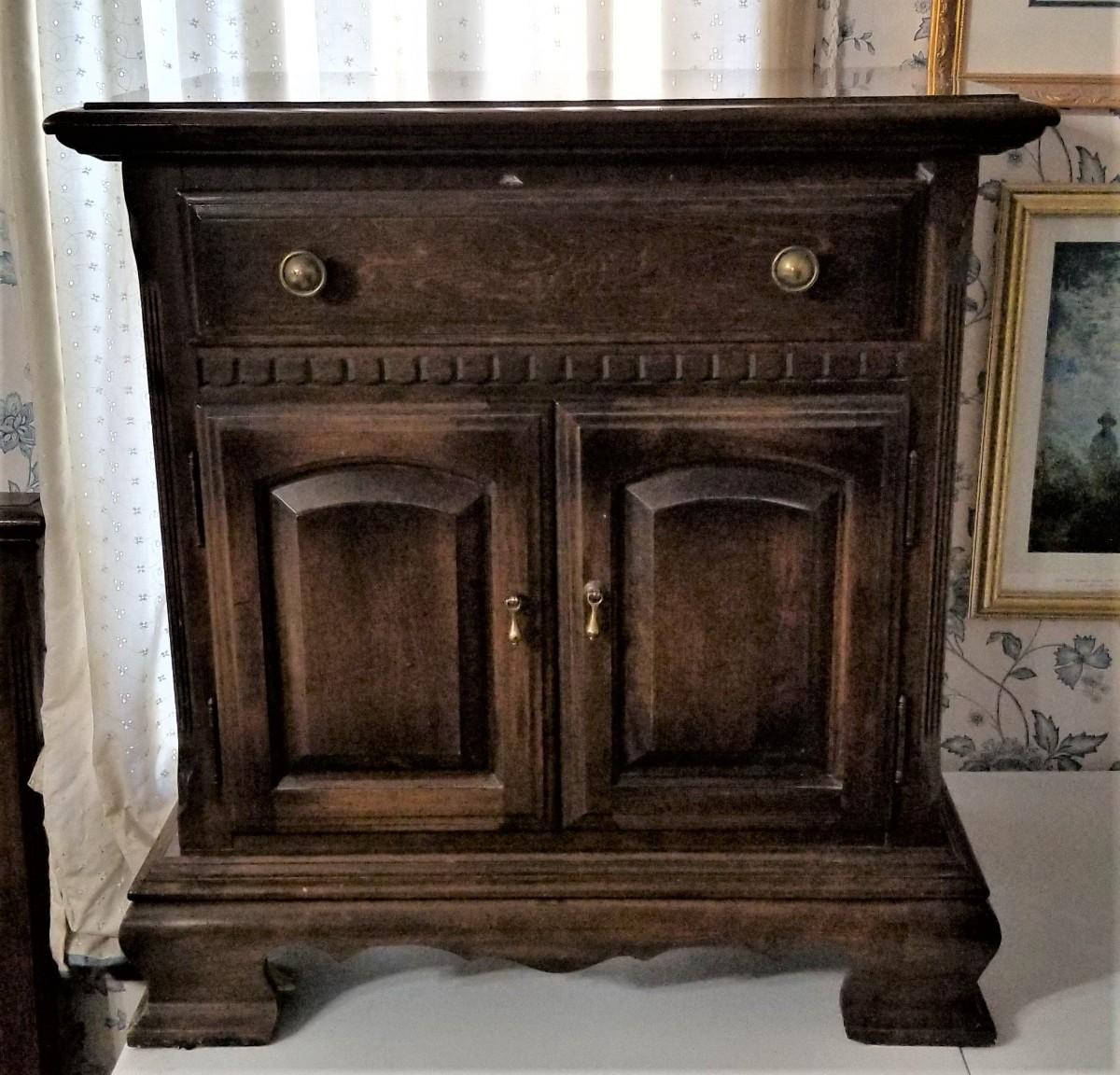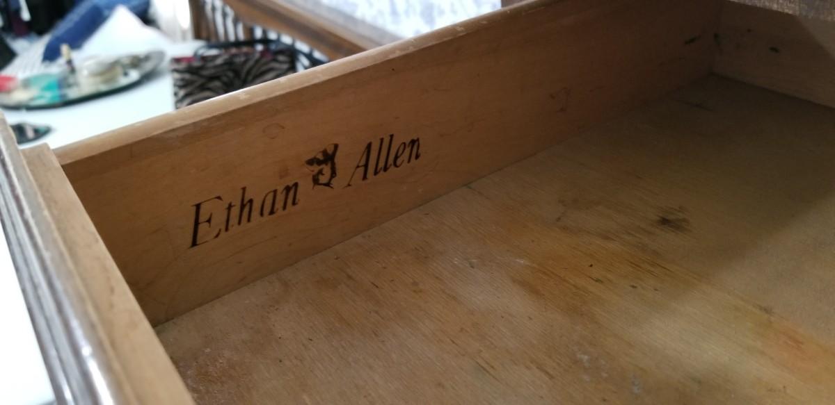 ETHAN ALLEN nightstand - used condition, "collar" missing on one handle - one drawer, storage beneath. 26" tall, 16" deep, 24.5" across.