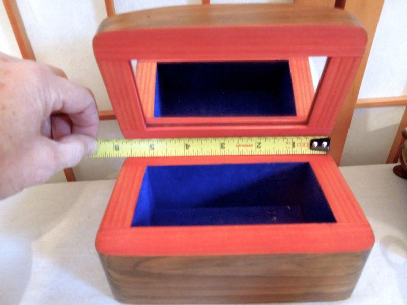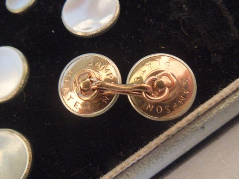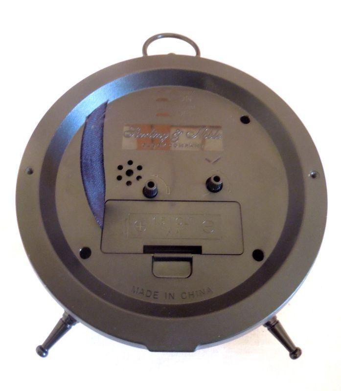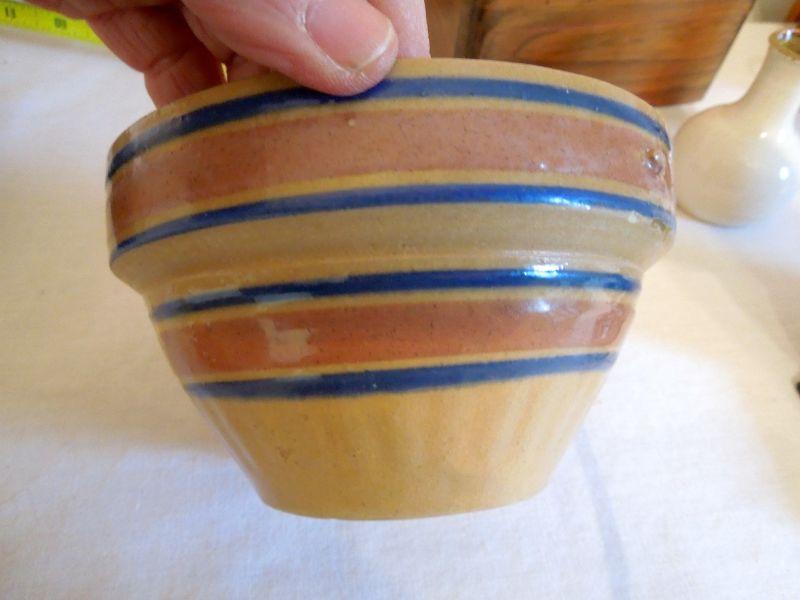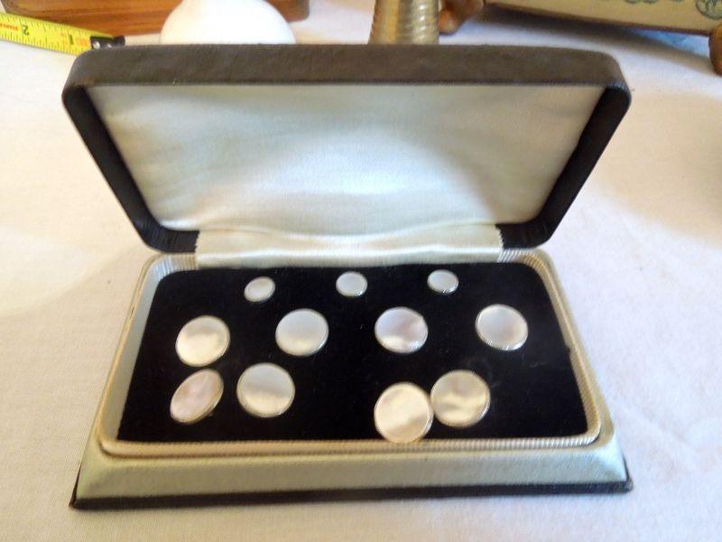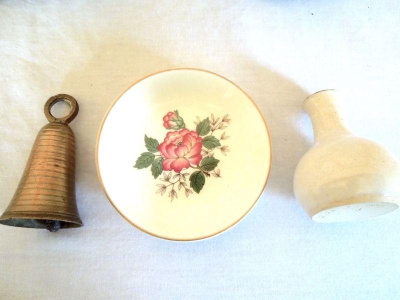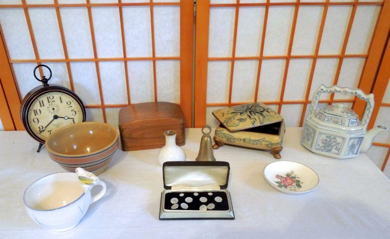 Ceramic Chinese teapot; cllection of mother of pearl dress buttons and cuff links; a plastic battery alarm clock; a small vintage banded mixing bowl; a wooden keepsake box; a small white ceramic bud vase; a brass bell; a covered blue and white keepsake box; a small ceramic rose plate and a whistling tea cup with bird. ( Blow in birds tail to whistle).