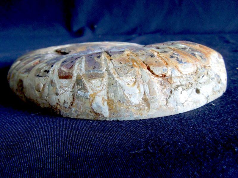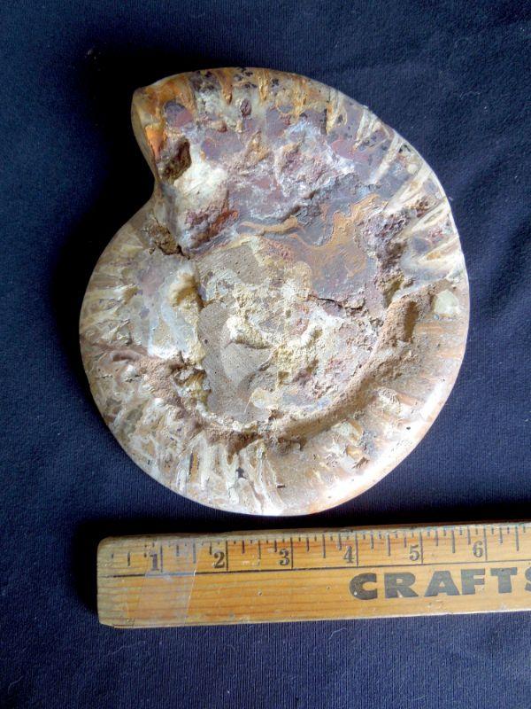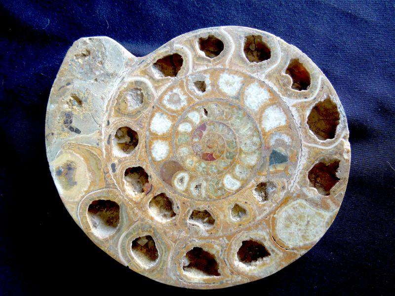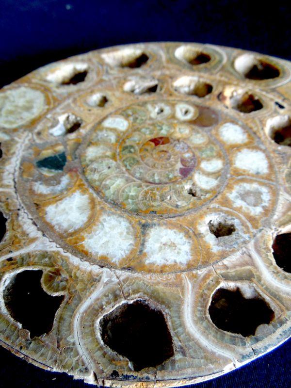 This is an very nice example of a rarely seen ammonite from Madagascar. It is of the genus Choffaticeras, 7.5" wide, quite thick and the half weighs around 3 lbs. Ammonites of this genus are often referred to as Margarite or "Daisy" flower ammonites. It has been cut in half and polished to reveal the amazing inner detail. Some of the chambers have been preserved as deep, spectacular CRYSTAL LINED pockets. This is an extremely aesthetic and displayable ammonite fossil at least 65 million years old.