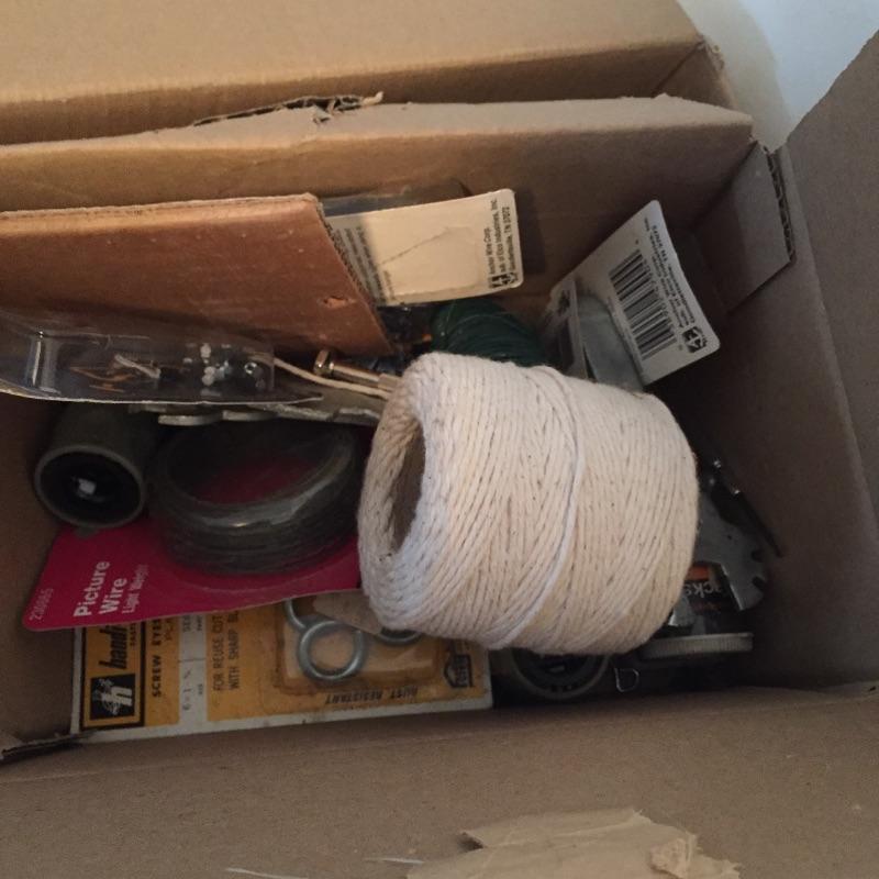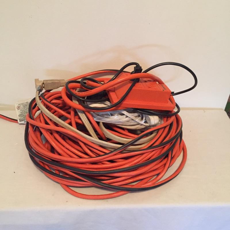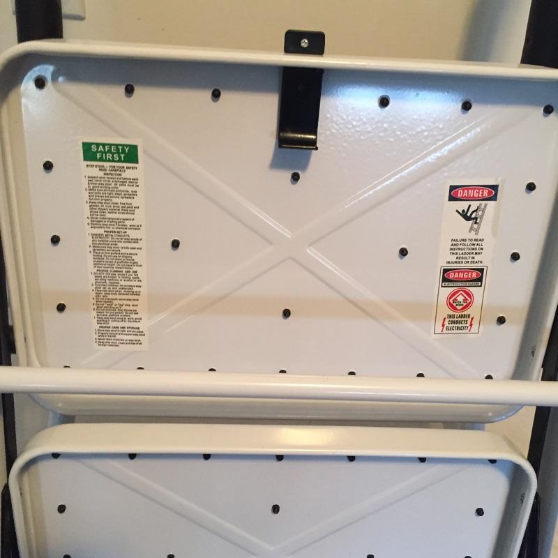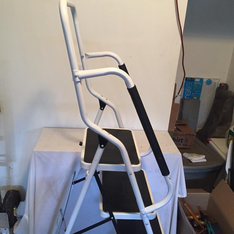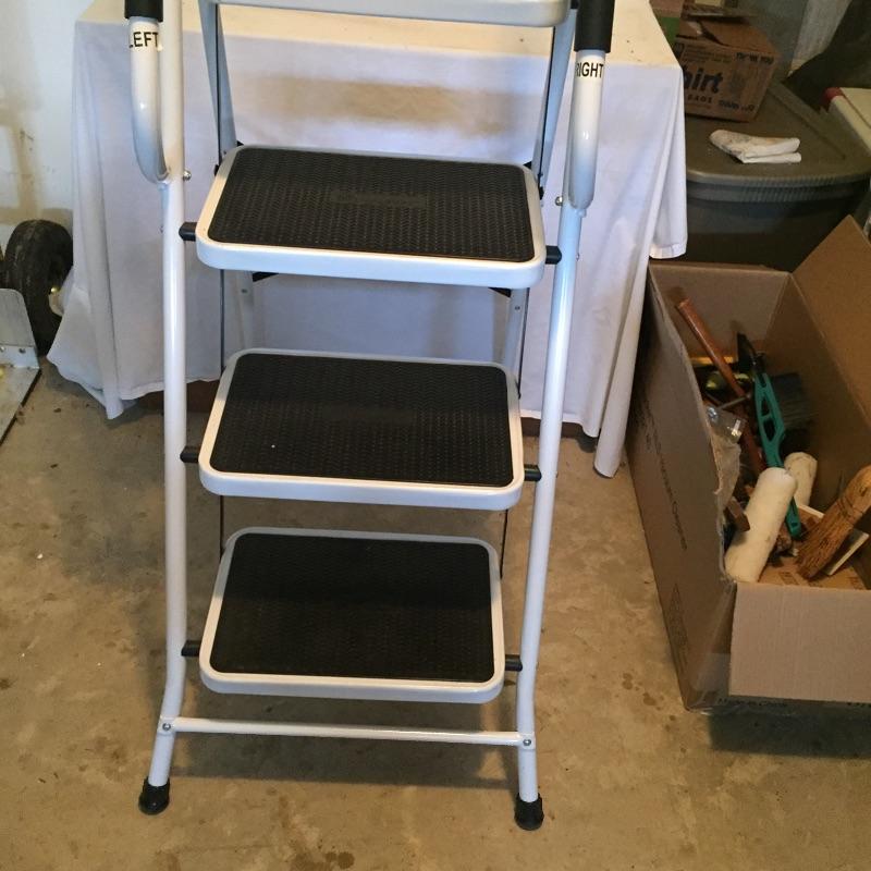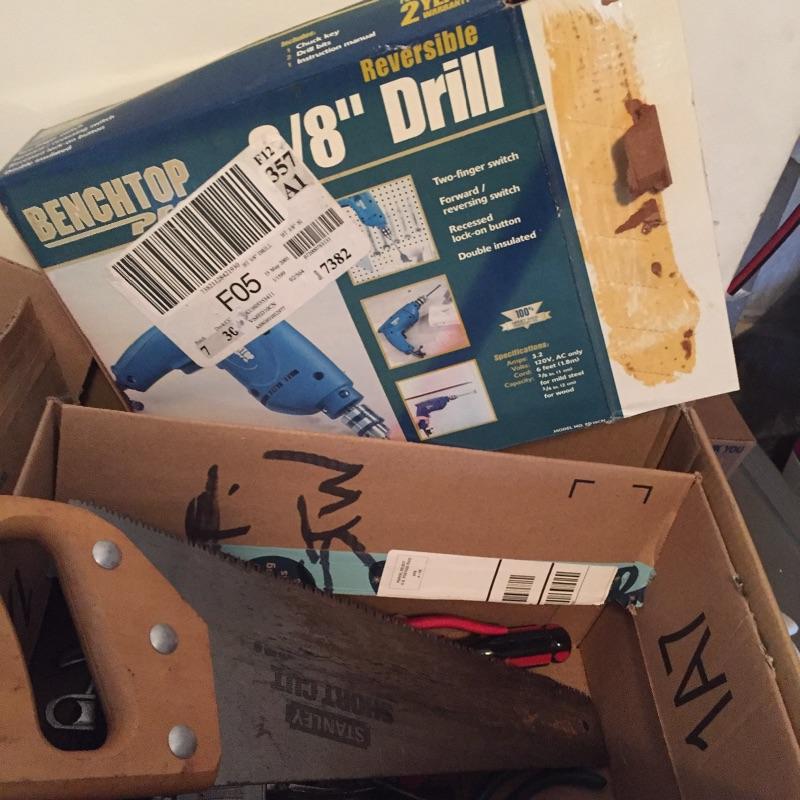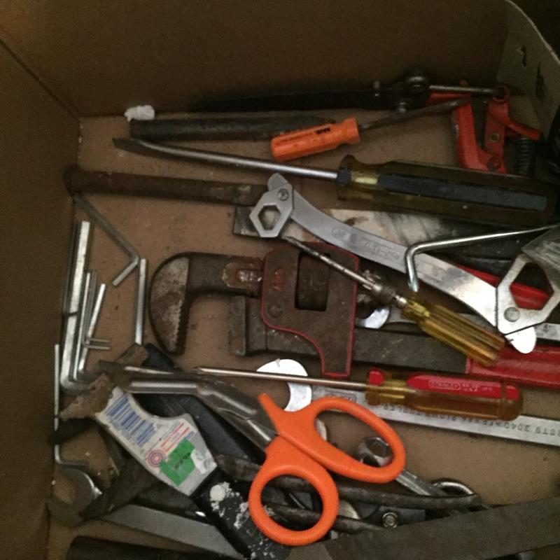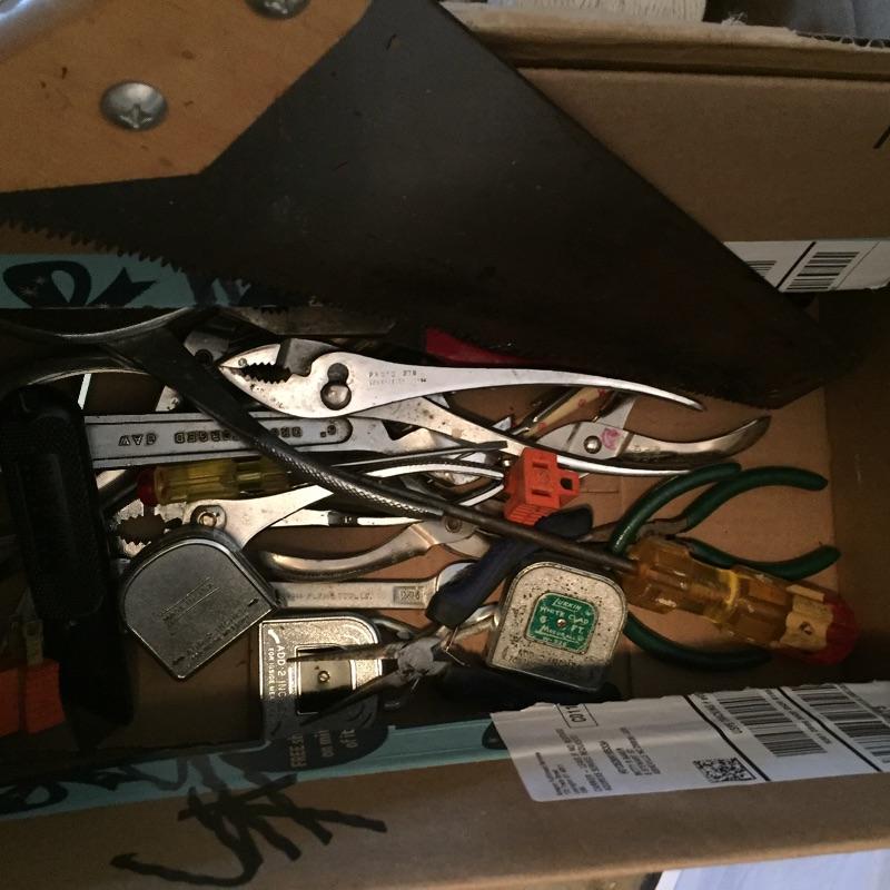 Mix of thing you can use around the house including step ladder that measures 38” to top step , drill , handsaw , pliers , measuring tape , extension cords , sandpaper and loads more.