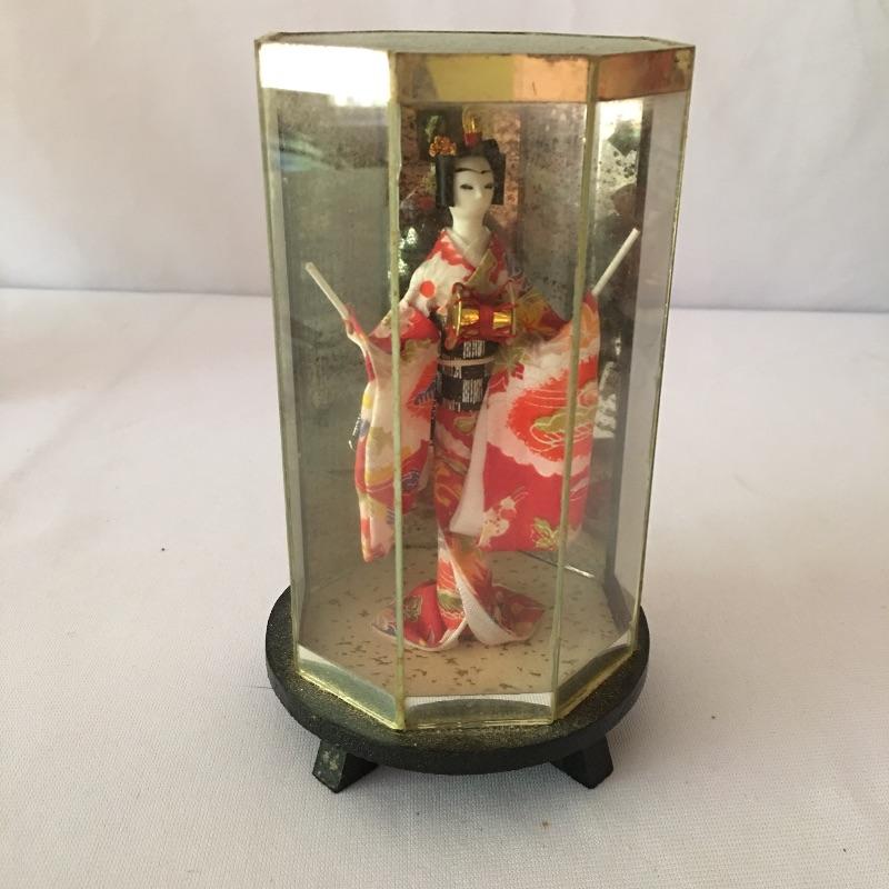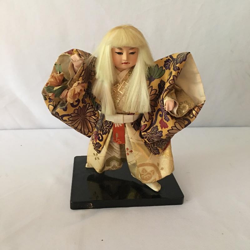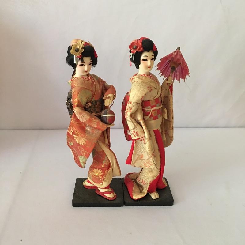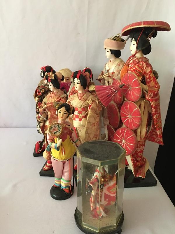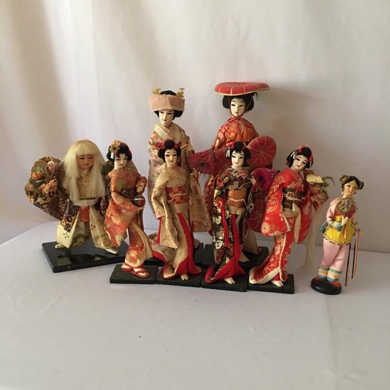 Japanese dolls. Lot includes two Kyugetsu doll, five dolls marked made in Japan, one doll in a plastic display case and one unmarked doll. Largest doll with base measures 4.5” x 6” x 16”.