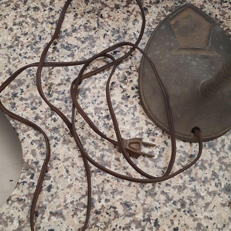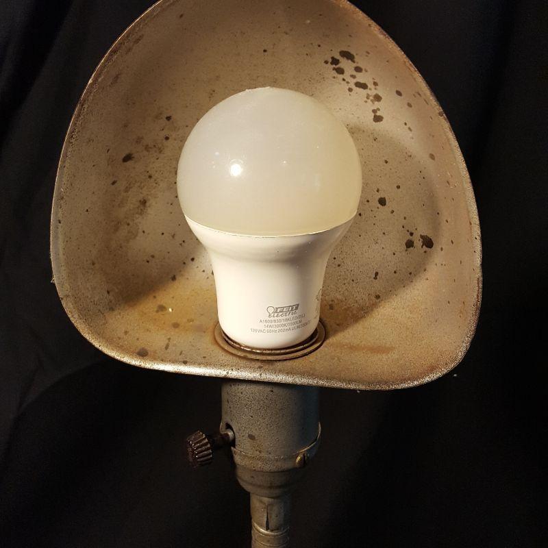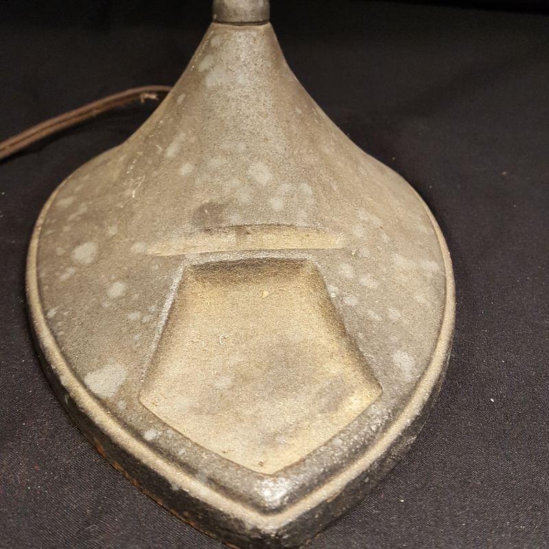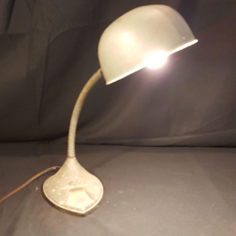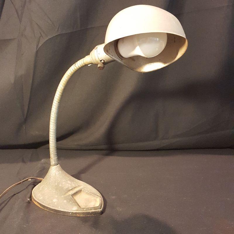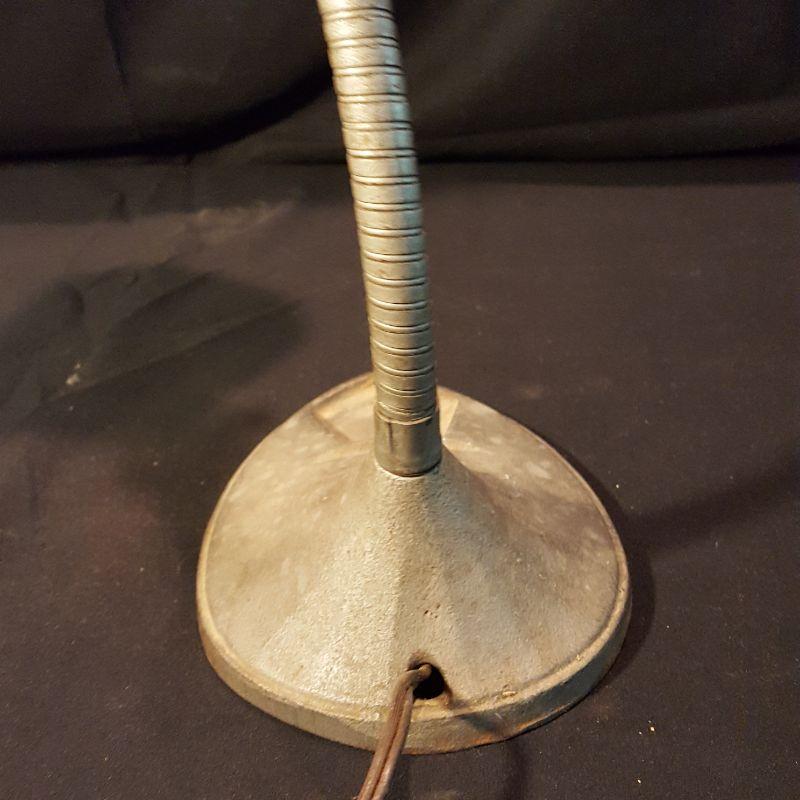 This lamp is way cool and it works!! It has an adjustable neck and feels sturdy! It would make a great bedside lamp or on your desk! In it's pictured shape, it's 17 inches high. There is some discoloration on the silver metal as shown in the pictures. Shipping available.