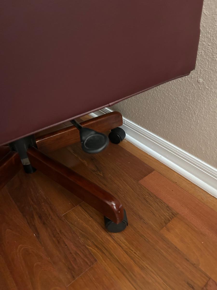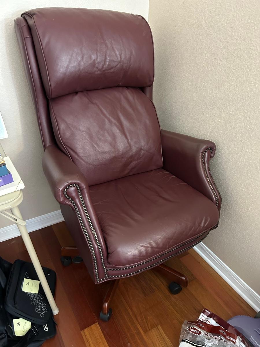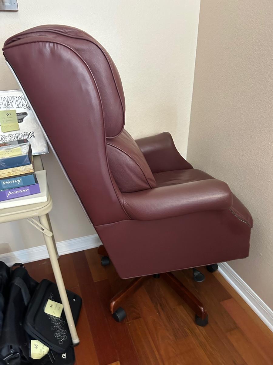 Burgundy leather office chair on wheels. Swivels, rocks & has adjustable height