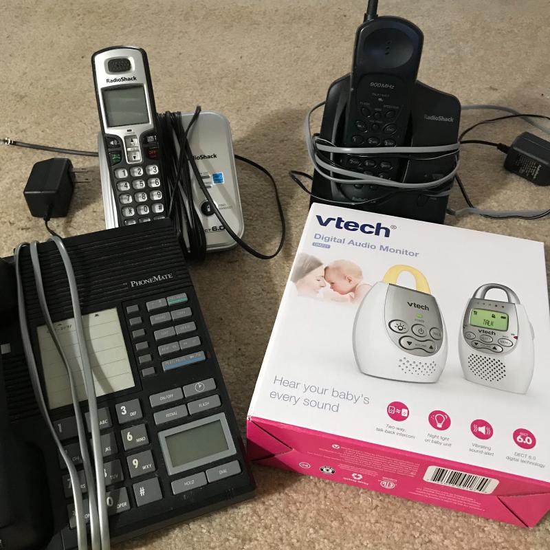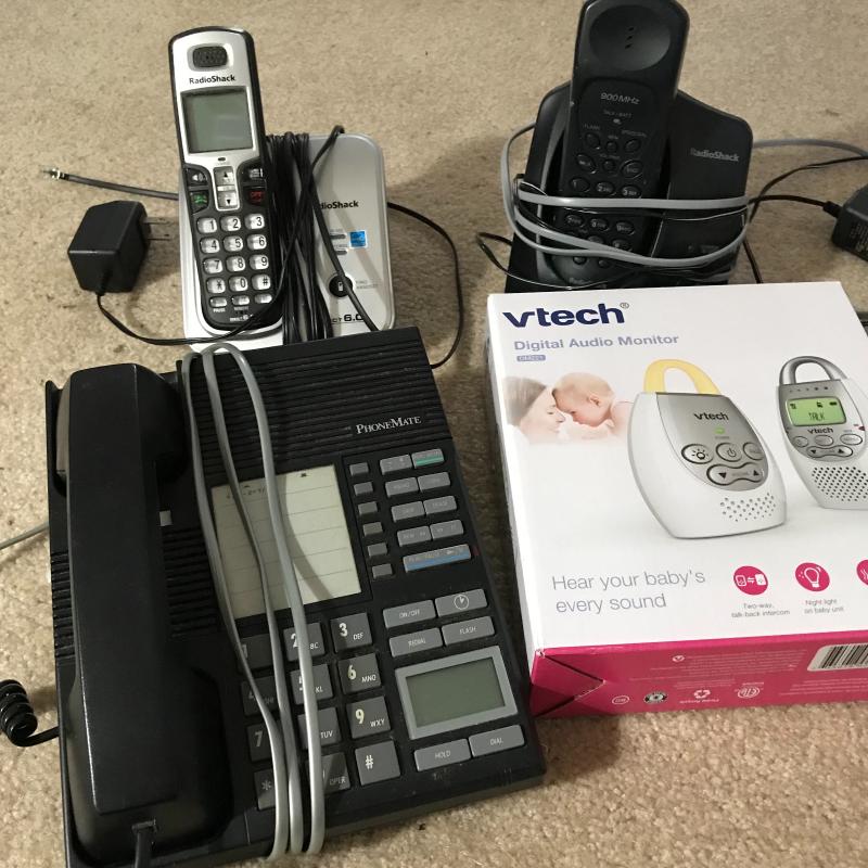Lot includes two Radio Shack cordless phones, one PhoneMate phone, and a Vtech baby monitor, new in box. Cannot verify functionality.