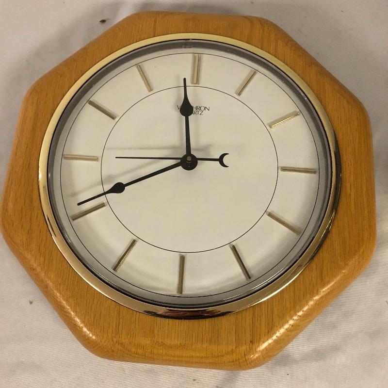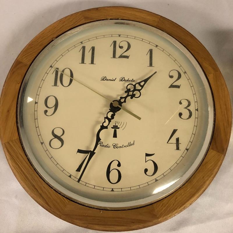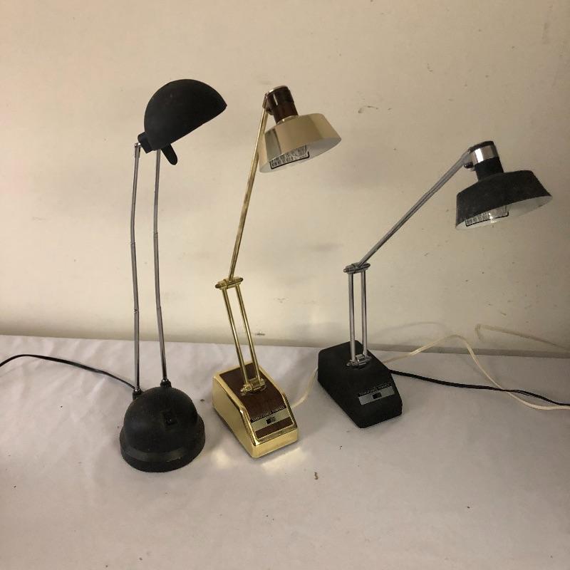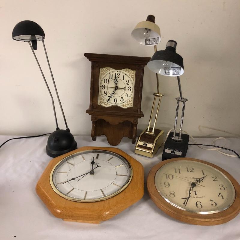 Three clocks and three Underwriter Laboratories desk lamps in this lot. The Daniel Dakota clock is radio controlled and does work as do all these battery operated wall clocks. The Spartus clock is plastic but looks very much like it’s made of wood. All 3 desk lamps work also. Daniela Dakota clock measures 11.5” diameter. Two of the Underwriters have adjusting arms to get you the light where you need it, along with two brightness settings. The third lamp has body similar to an old boom box antenna, extending and bending from the base. It is somewhat height adjustable, although it is currently slightly bent and doesn’t collapse entirely. All three lamps worked when tested.