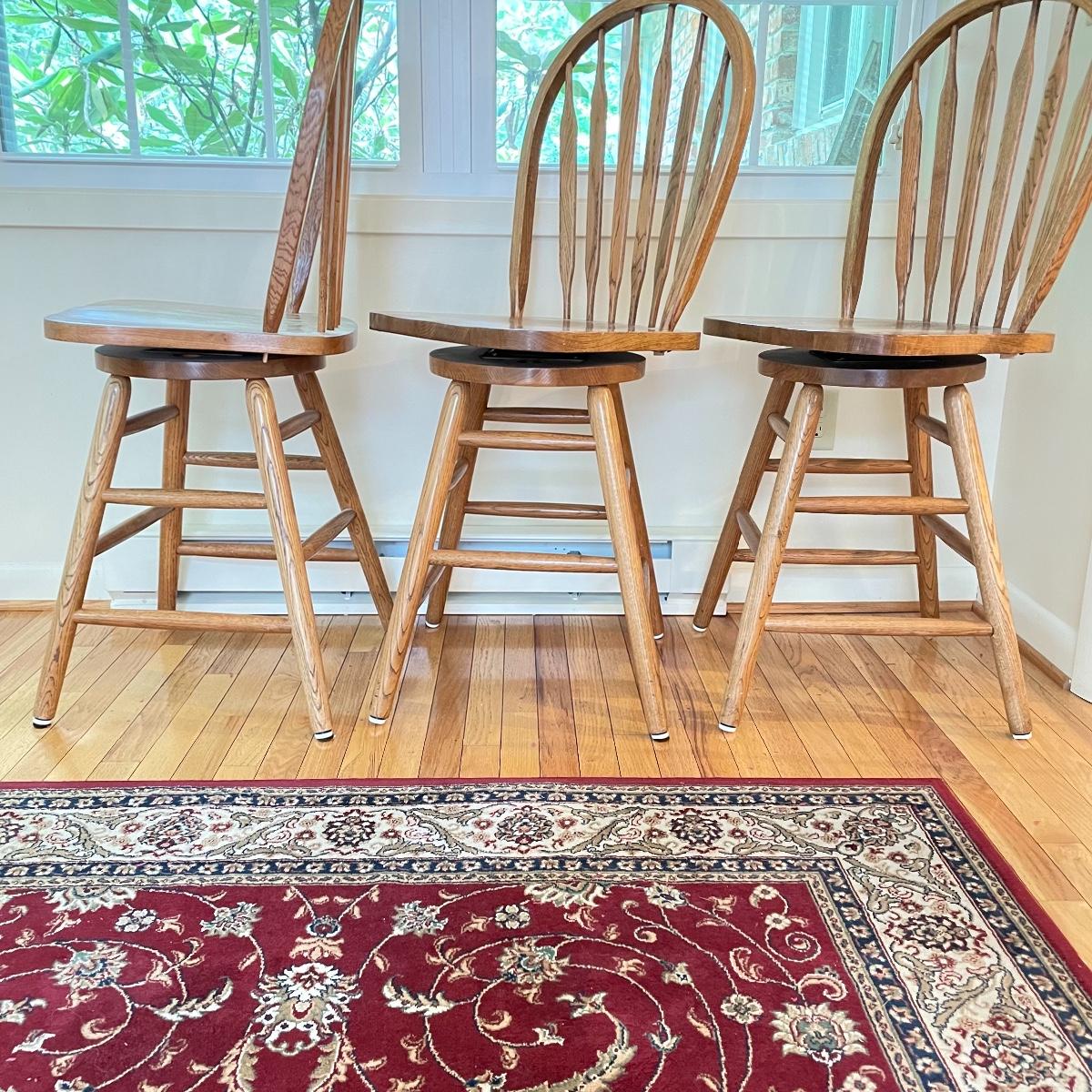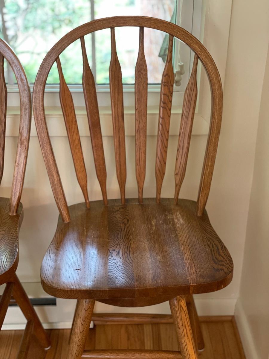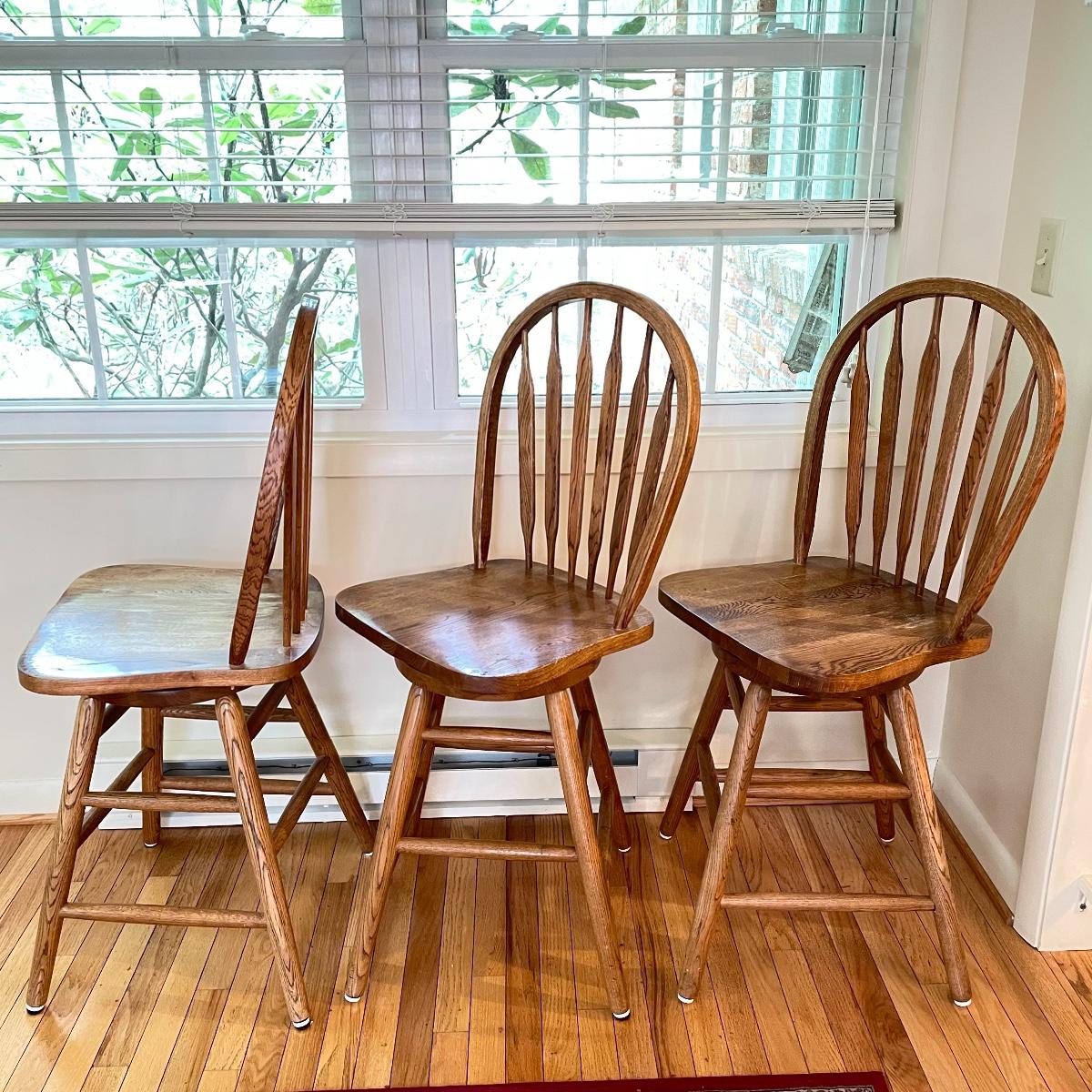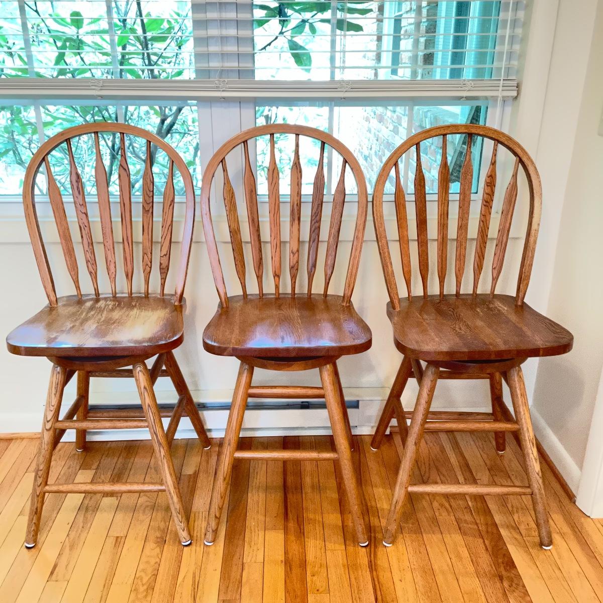 Three nice swivel bar stools. All three swivel well and appear to be solid oak-like wood. One seat has a noticeable lightening. The images appear to have an ash brown seat with an oranger seat back, this is shown in more contrast in images than in person. Stools measure approximately 17.5” x 17” x 44” with a seat height at 24”. See images. Local pick up only.