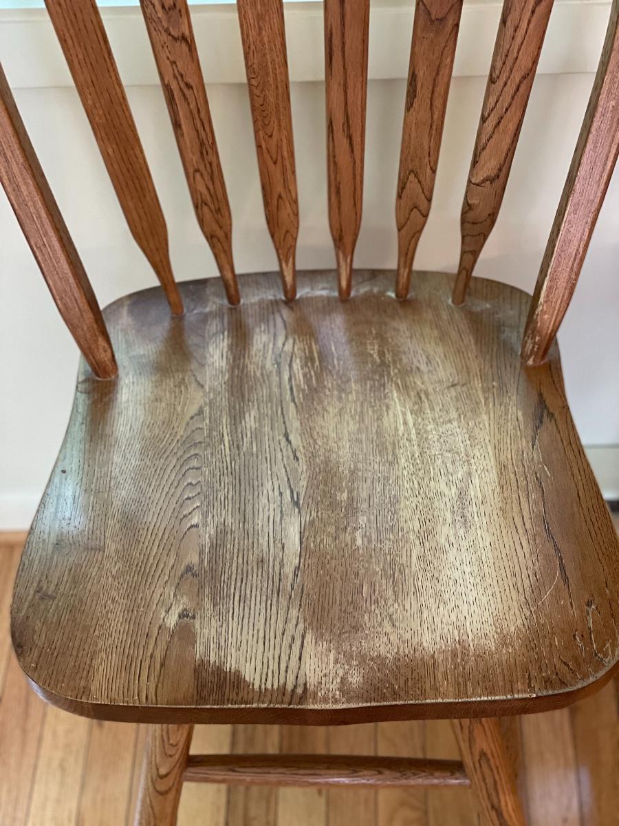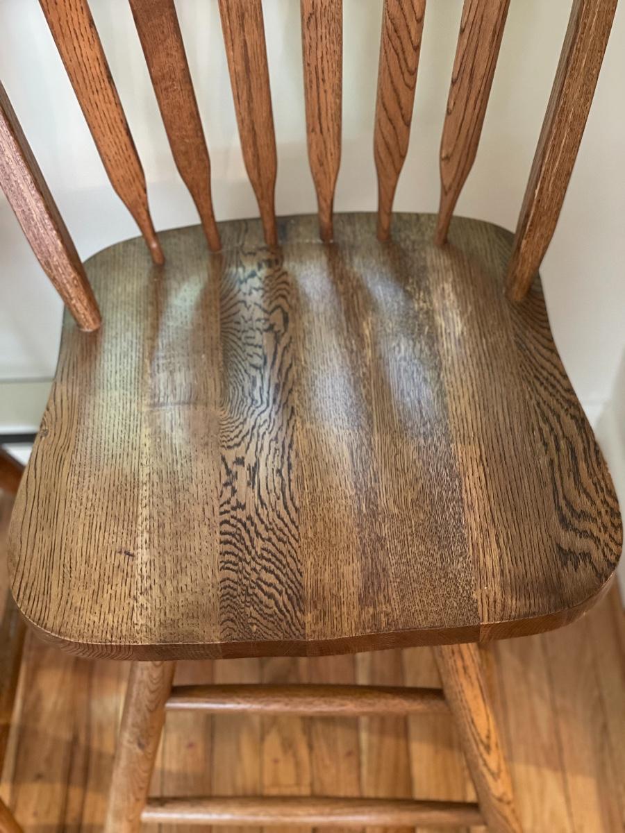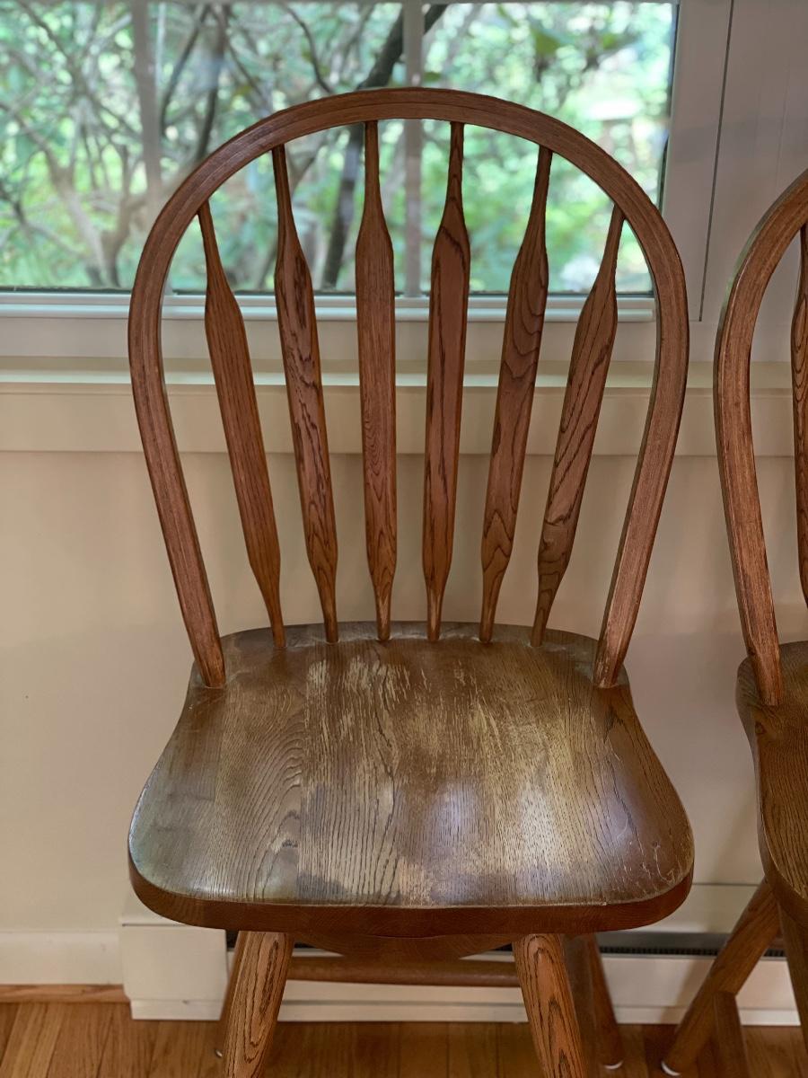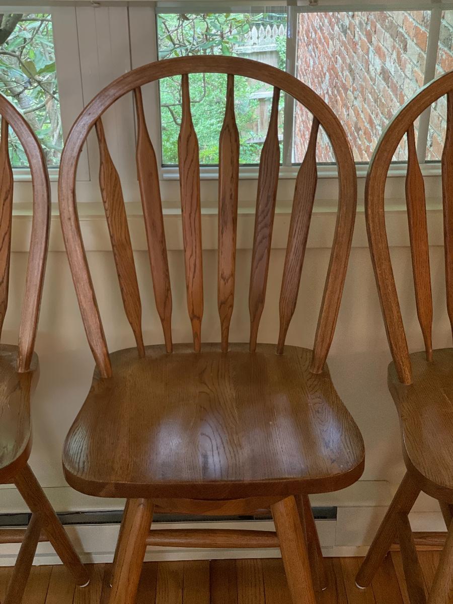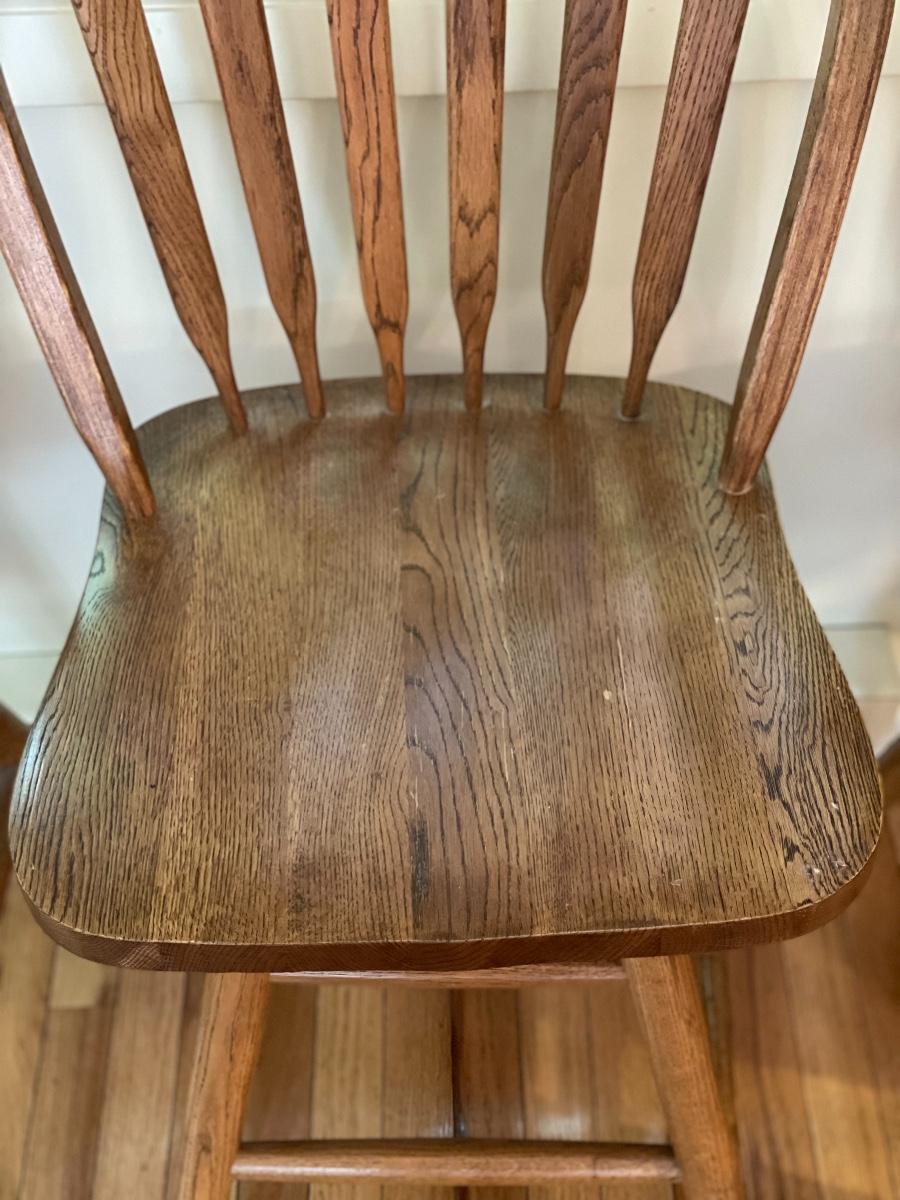 Three nice swivel bar stools. All three swivel well and appear to be solid oak-like wood. One seat has a noticeable lightening. The images appear to have an ash brown seat with an oranger seat back, this is shown in more contrast in images than in person. Stools measure approximately 17.5” x 17” x 44” with a seat height at 24”. See images. Local pick up only.