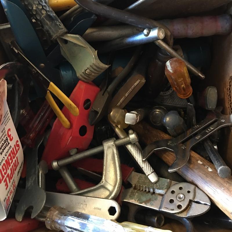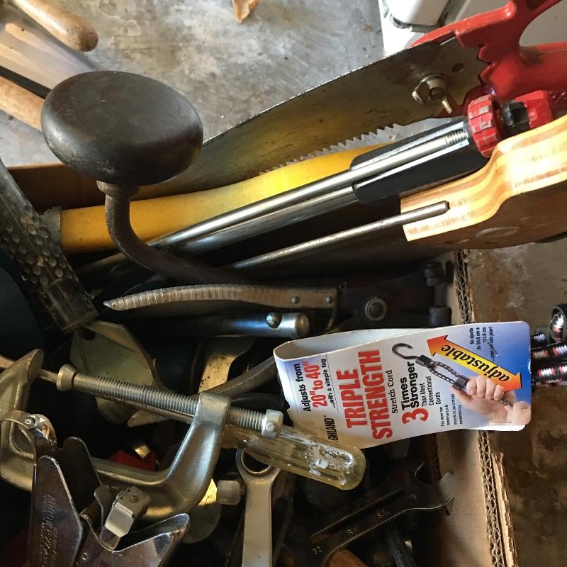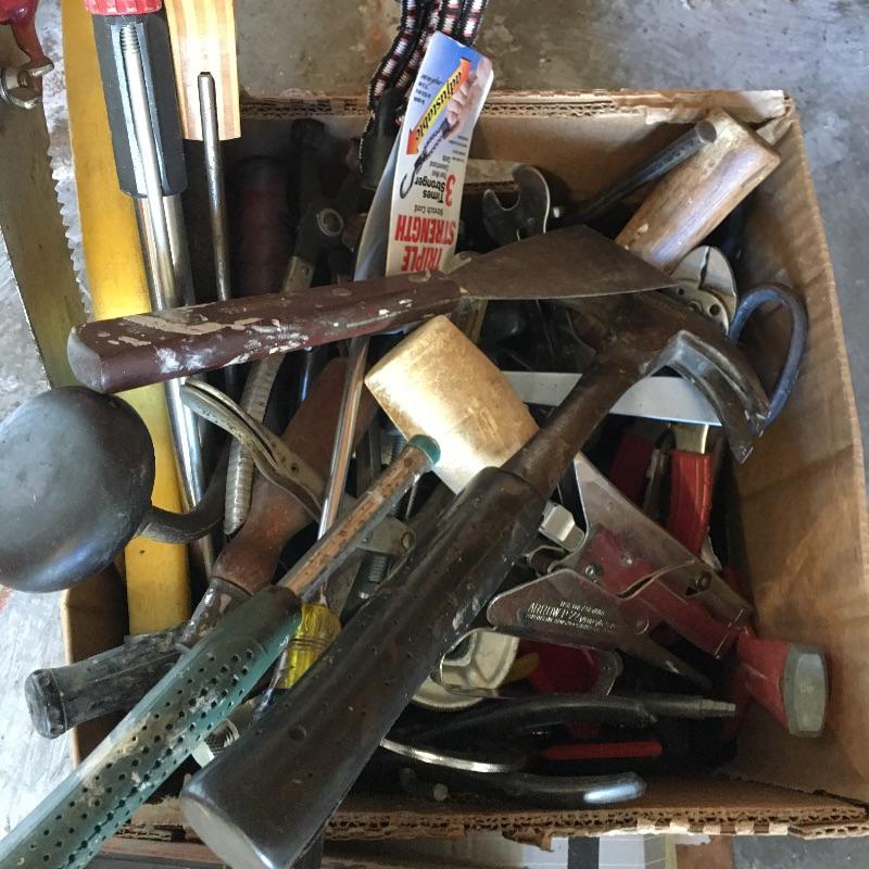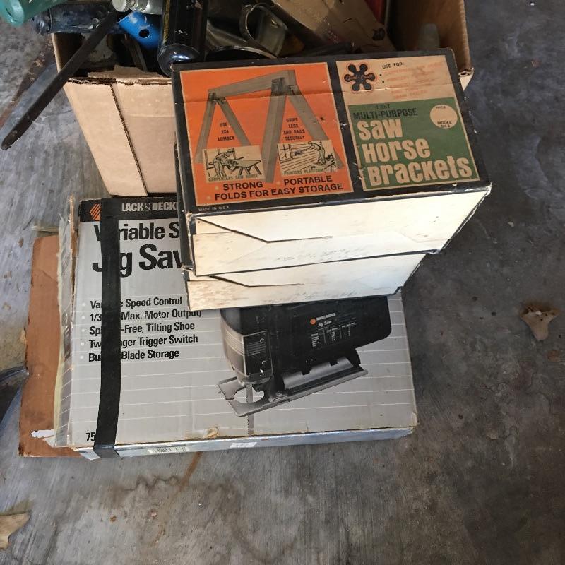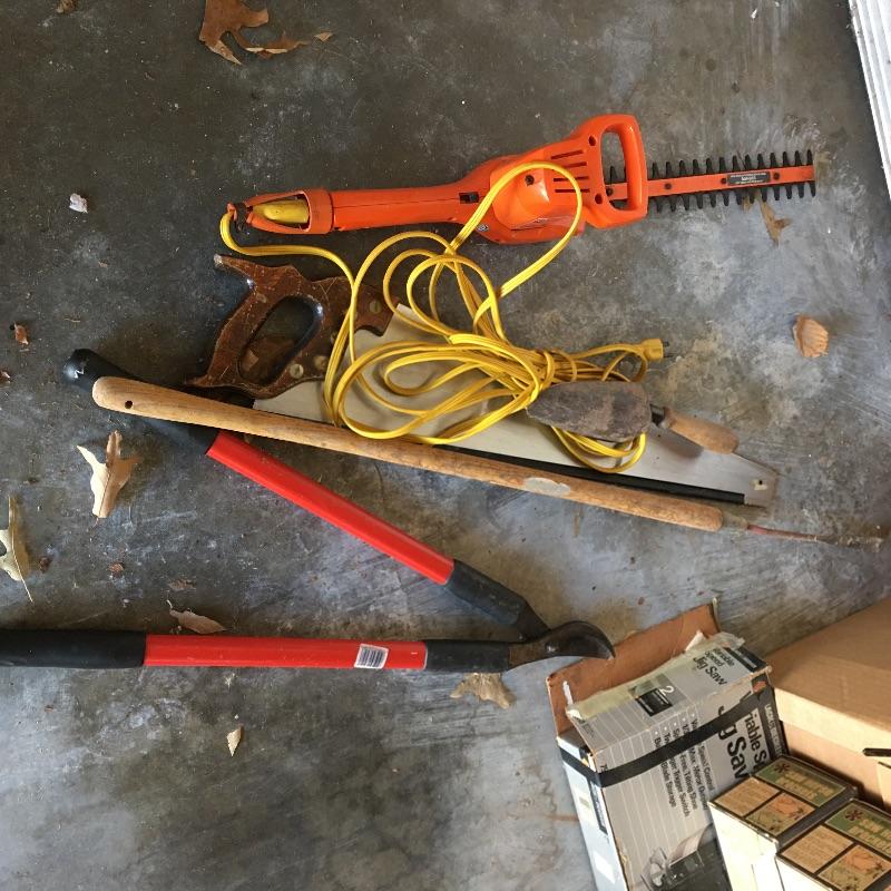 A plethora of tools includes hammer, saw horse brackets, saws, hedge trimmer, loppers, stapler, jigsaw and more.