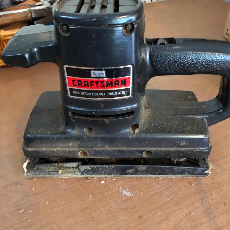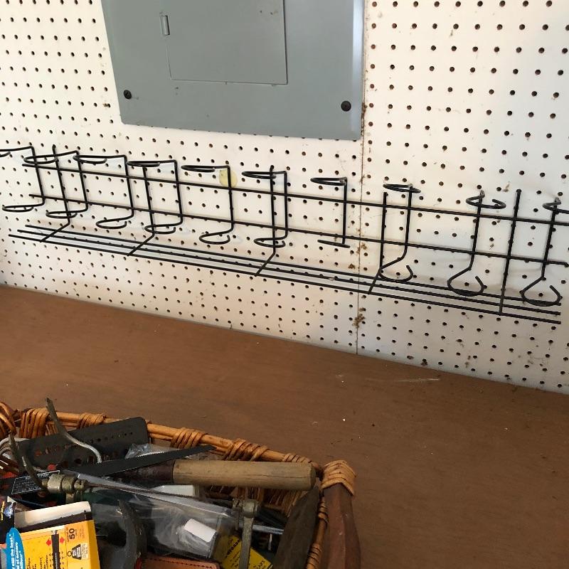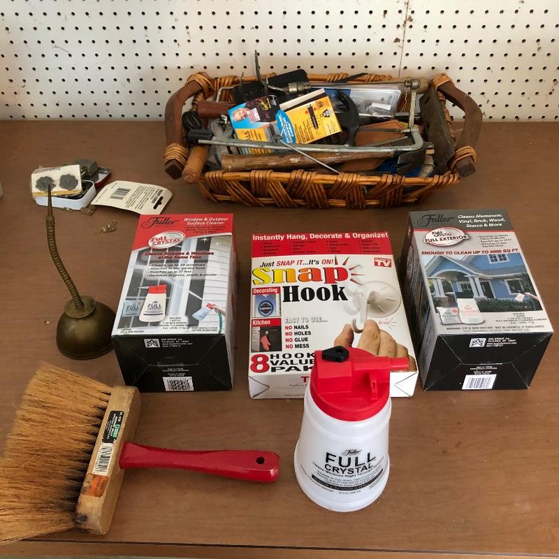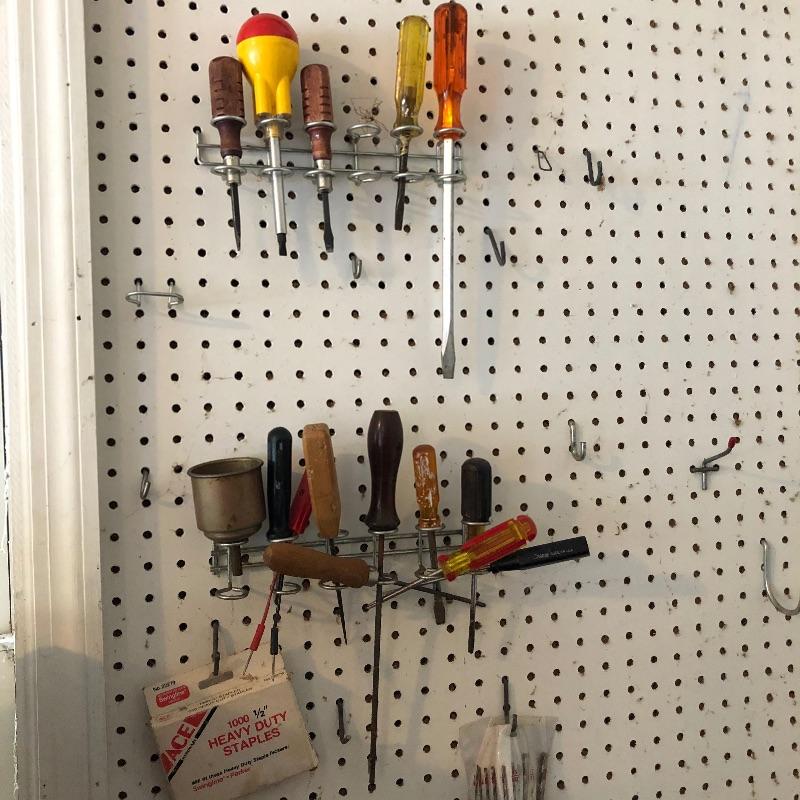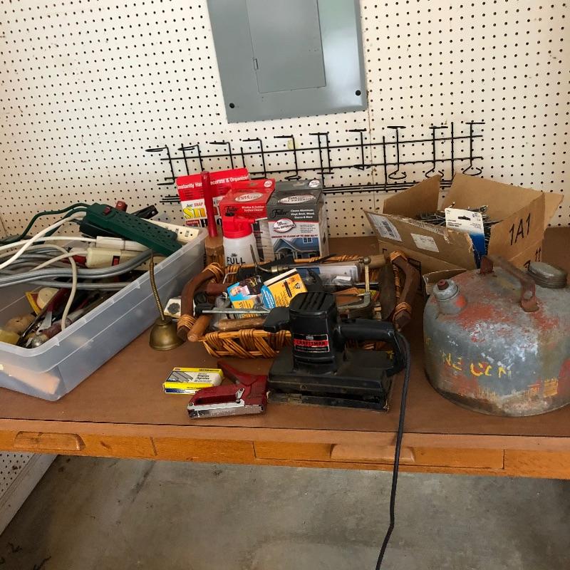 This vast lot contains a great mix of tools and household maintenance essentials. See images for everything that is included, but to name a few, a Craftsman sander and a bunch of extra sandpaper (turned on when tested), a box full of pegboard hooks and a black metal tool holder for pegboards that measures 3’ wide by 7” tall and much more.