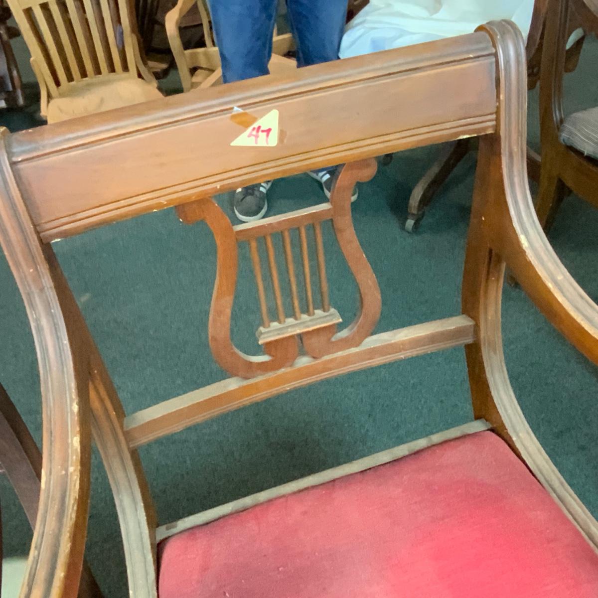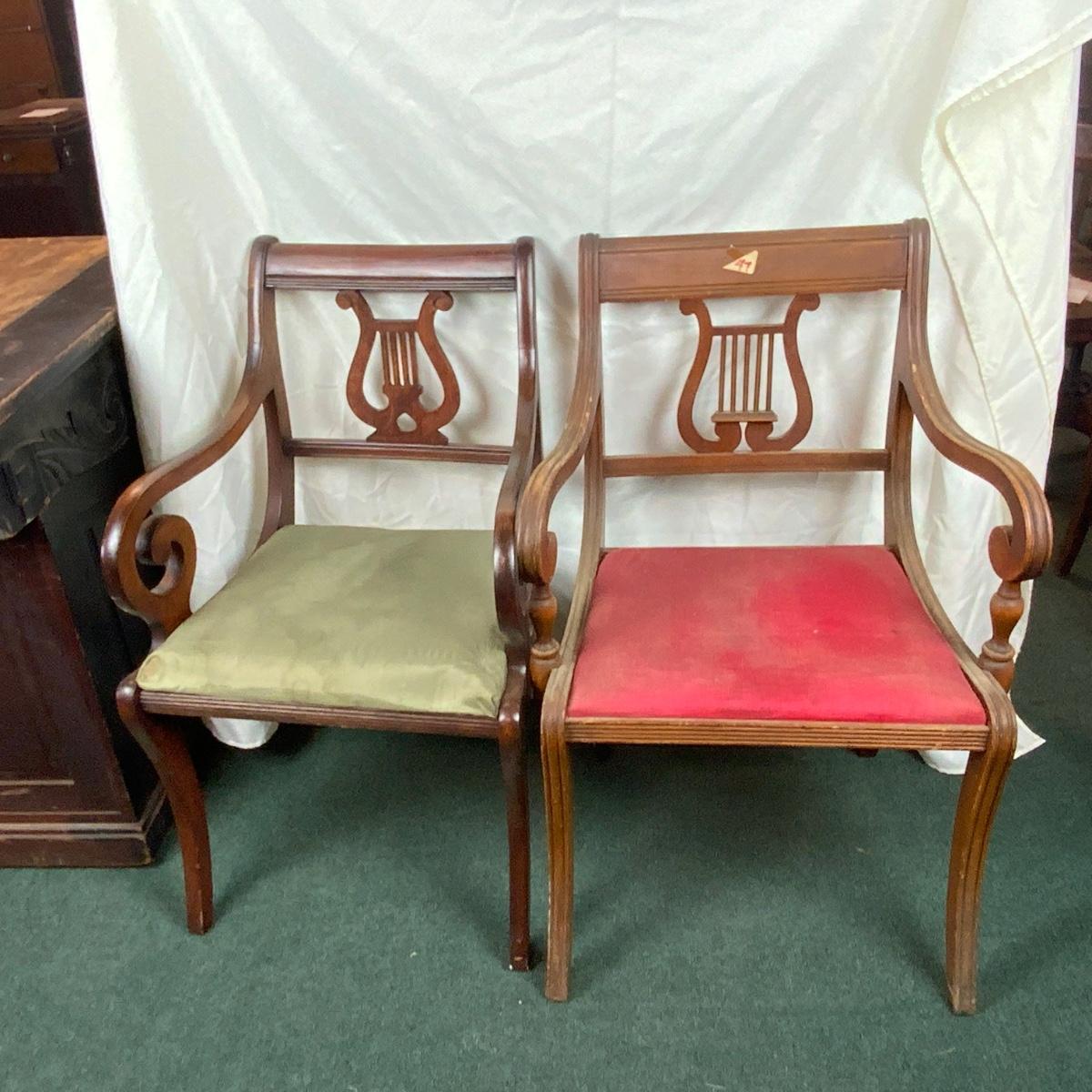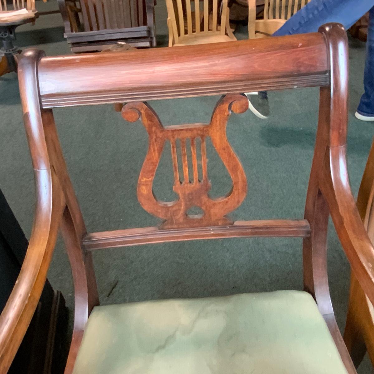 Three Lute Back Chairs. Perfect for Christmas! Lovely accent chairs. While sorting the chairs we found one more of the Green Seated Chairs. See photo for additional chair. //::\\ Please see photos for details and condition. No attempt has been made to hide any imperfections. All items listed in this auction are warehouse items, and need to be cleaned. A majority of the items need restoration as well. All items are sold AS IS and WITHOUT GUARANTEE. If you are uncertain about an item, DO NOT BID. Due to the nature of this online auction in-person inspection is HIGHLY recommended. All Sales are FINAL. Pick Up Times are FIRM. Please confirm with your own schedule that you can pick up in the scheduled times listed in the Terms and Conditions. Any questions please message the auctioneer. DO NOT Contact The Harp Gallery.