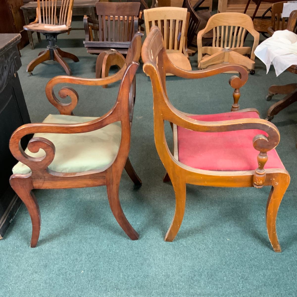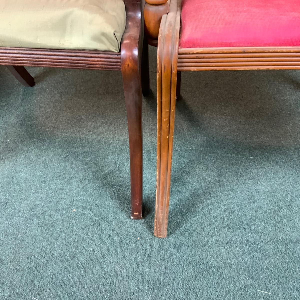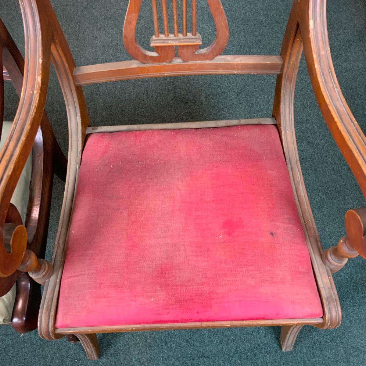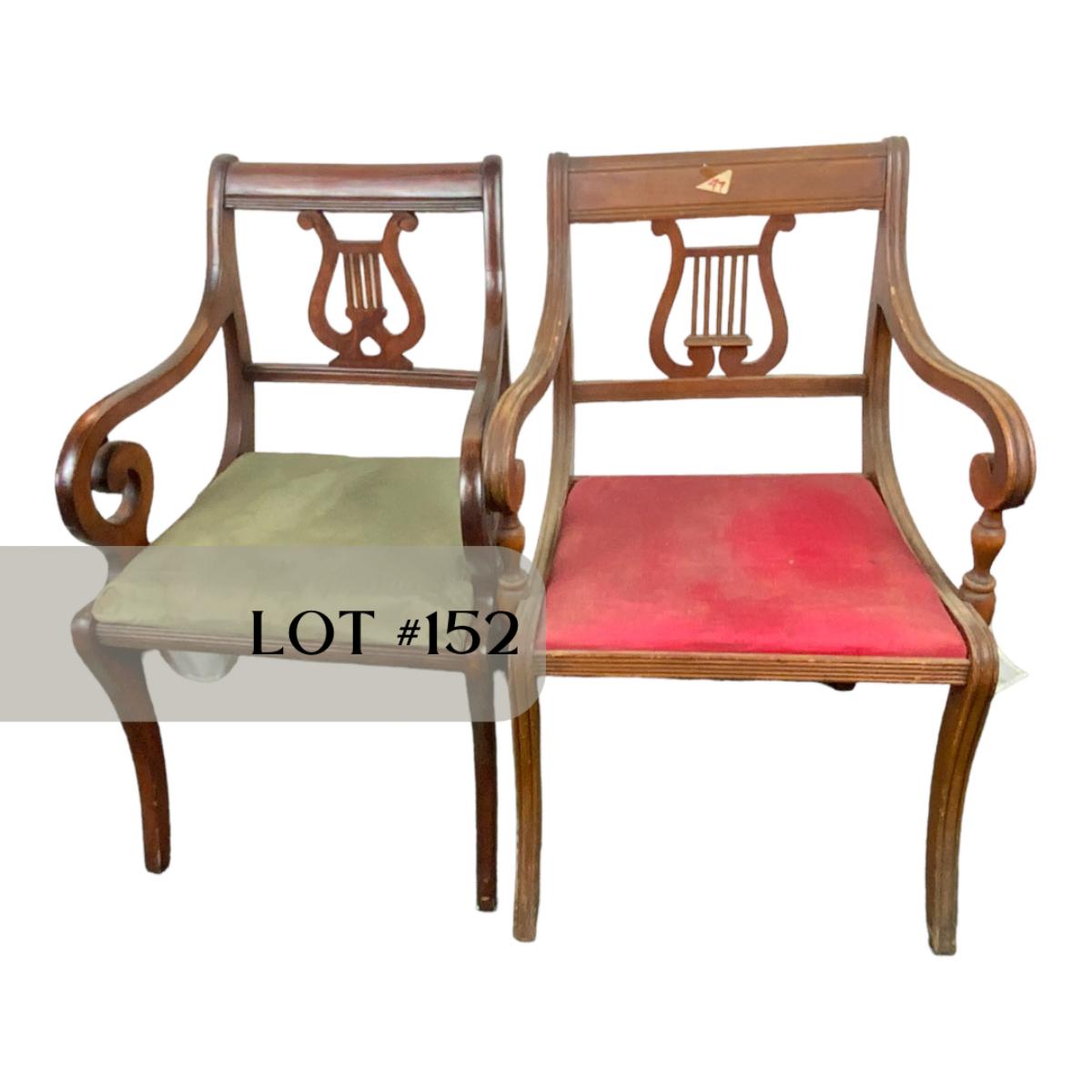 Three Lute Back Chairs. Perfect for Christmas! Lovely accent chairs. While sorting the chairs we found one more of the Green Seated Chairs. See photo for additional chair. //::\\ Please see photos for details and condition. No attempt has been made to hide any imperfections. All items listed in this auction are warehouse items, and need to be cleaned. A majority of the items need restoration as well. All items are sold AS IS and WITHOUT GUARANTEE. If you are uncertain about an item, DO NOT BID. Due to the nature of this online auction in-person inspection is HIGHLY recommended. All Sales are FINAL. Pick Up Times are FIRM. Please confirm with your own schedule that you can pick up in the scheduled times listed in the Terms and Conditions. Any questions please message the auctioneer. DO NOT Contact The Harp Gallery.
