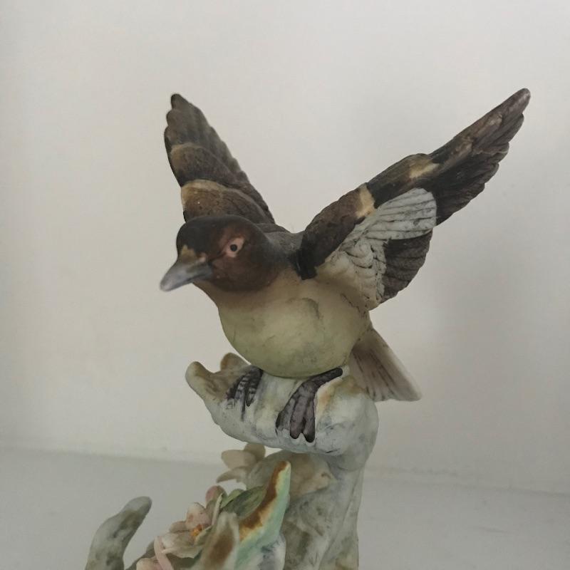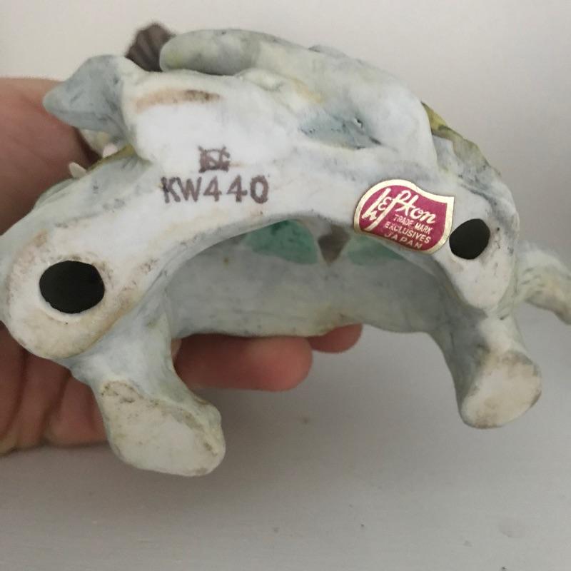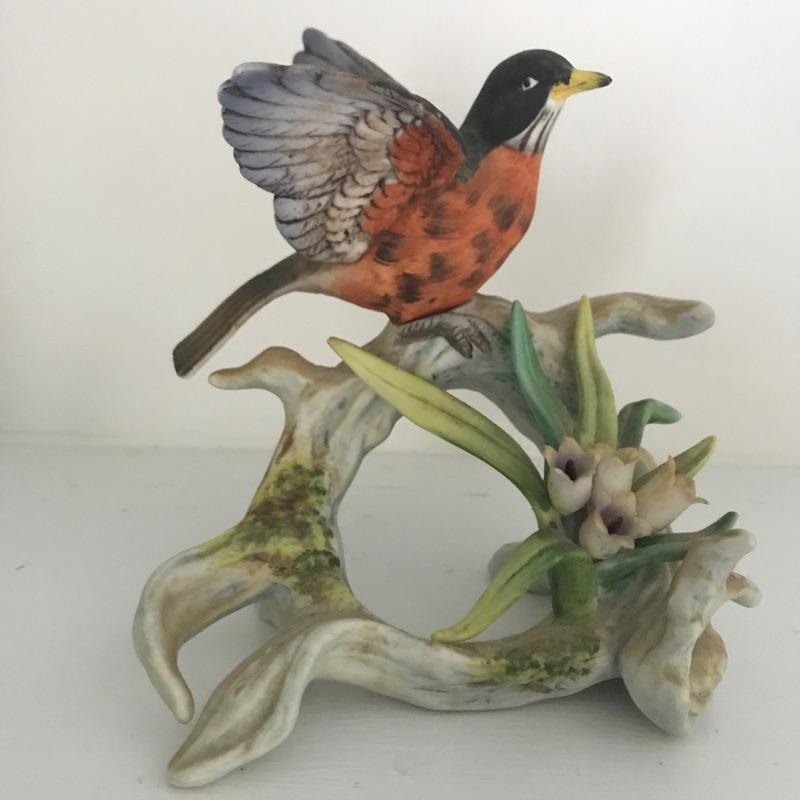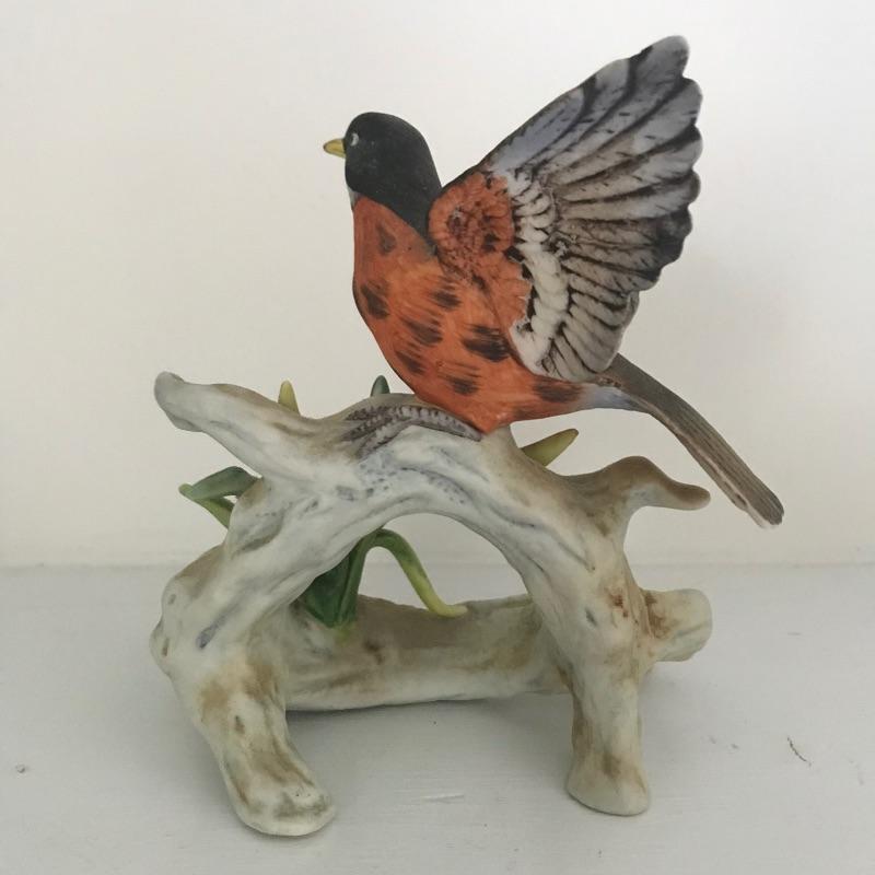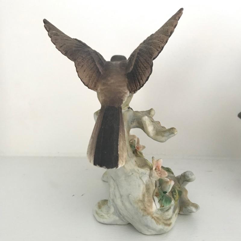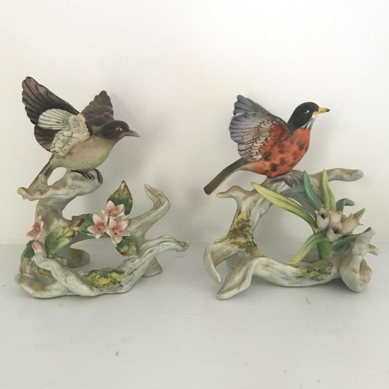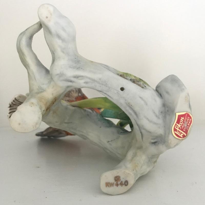 Two lovely little porcelain figurines by Lefton. Both feathered friends are perched on driftwood with floral foliage. Both bird are marked KW440 and possess Lefton brand stickers. Both figurines are just over 5” tall. See photos. Shipping available.