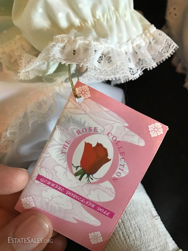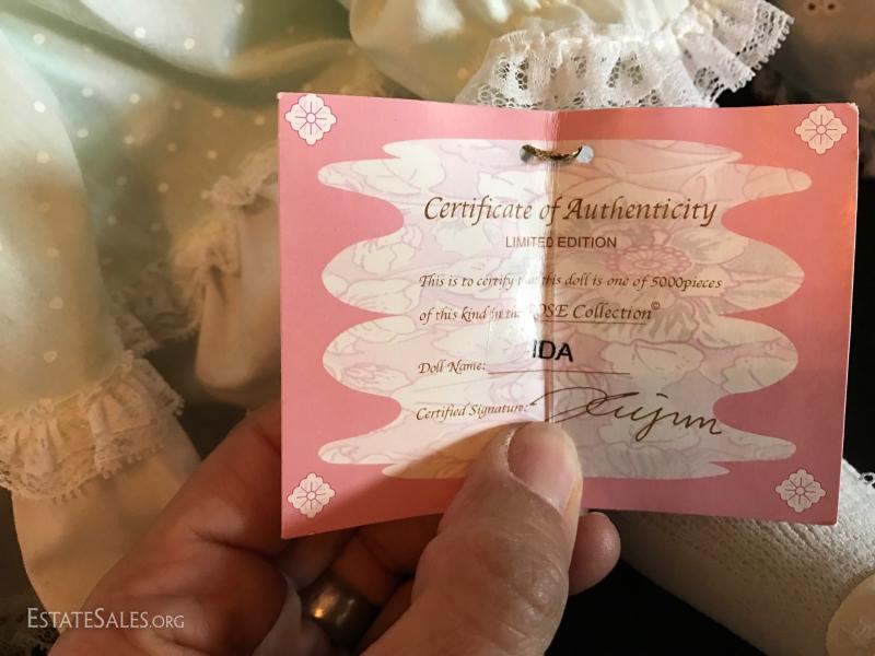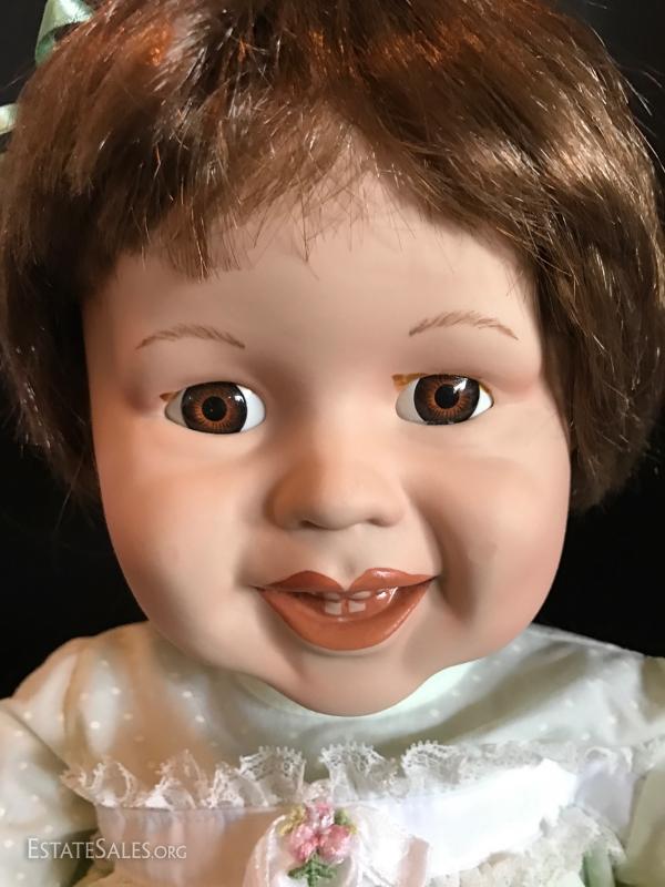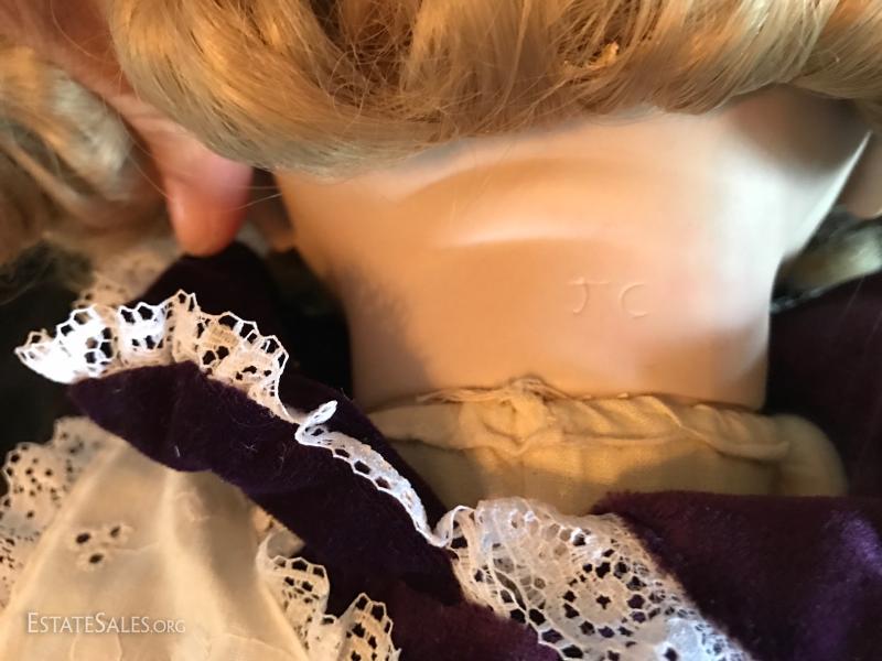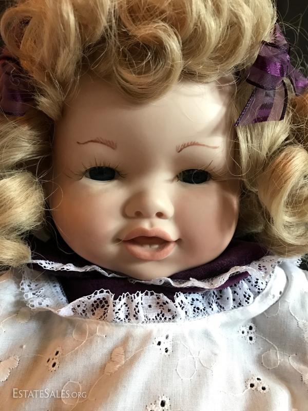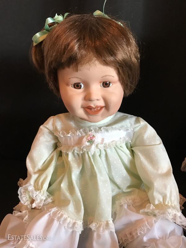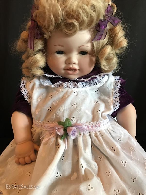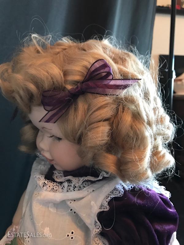 “Ida” is a limited edition doll from the Rose Collection and includes original box and hangtag with COA. She wears a light green polka dot outfit. The second porcelain doll does not have a tag. Has JC on neck. No box or COA or shoes. She's a cute blond with wringlets, large eyelashes and a purple velvet outfit. Both are approximately 24”tall. See photos for details. Doll ships from Columbus, North Carolina or local pick up.