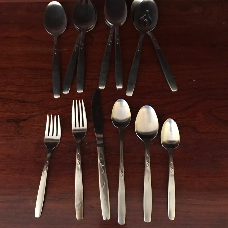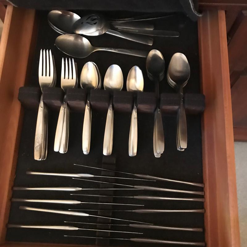 Includes a stainless mid century design set that is made in the USA. Insert silverware storage is not included in lot. Shipping or local pick up.