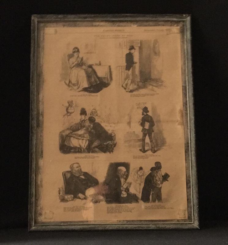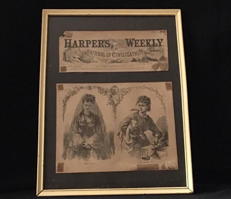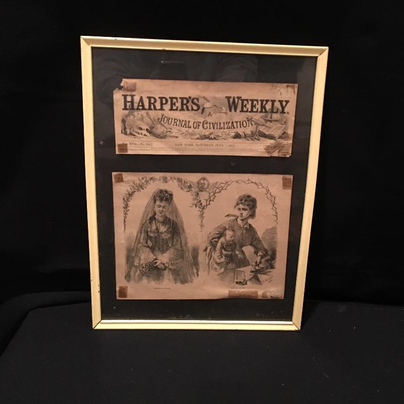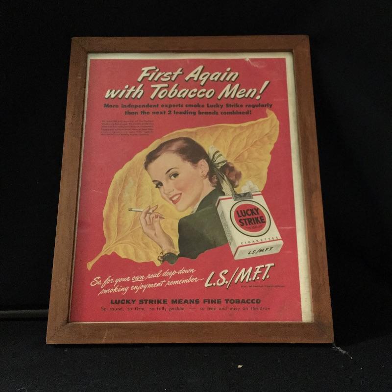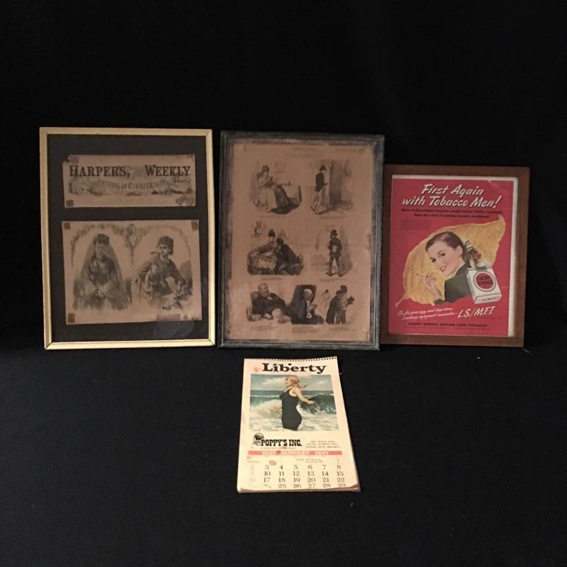 Three framed vintage ads and one calendar from 1927. Two from Harpers Weekly and one Lucky Strike ad. Largest frame measures 12.5” x 16.75”.