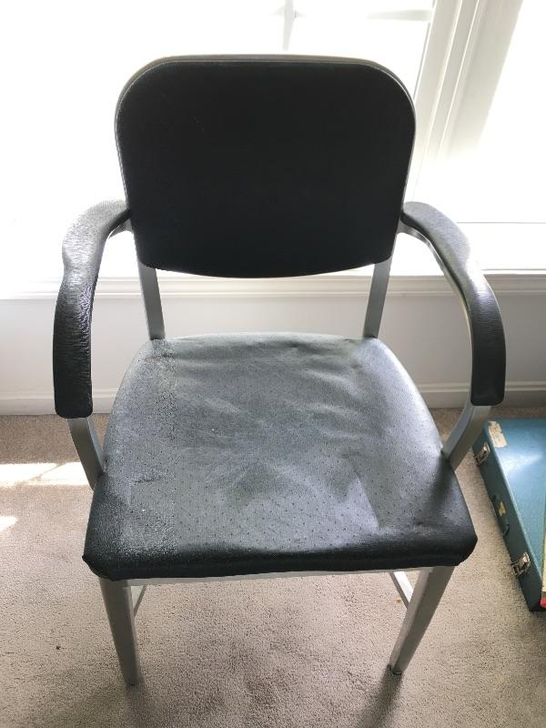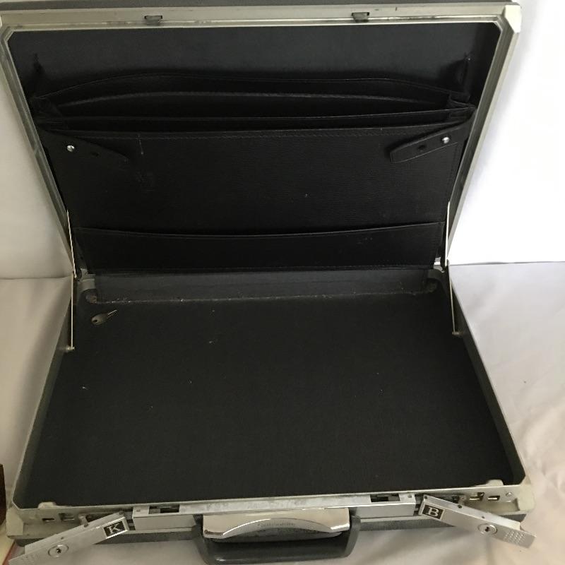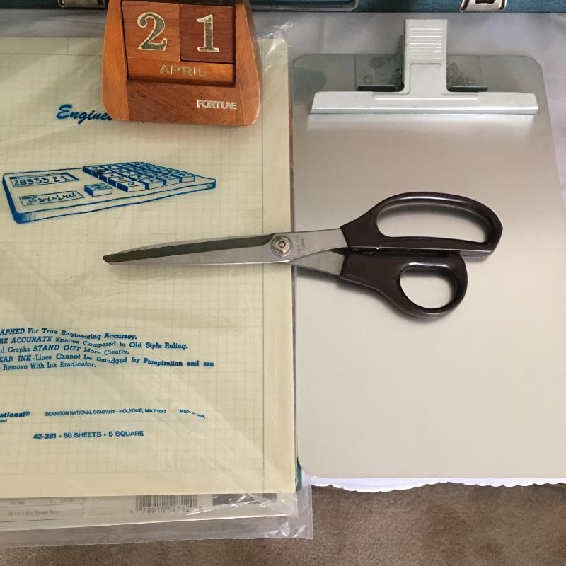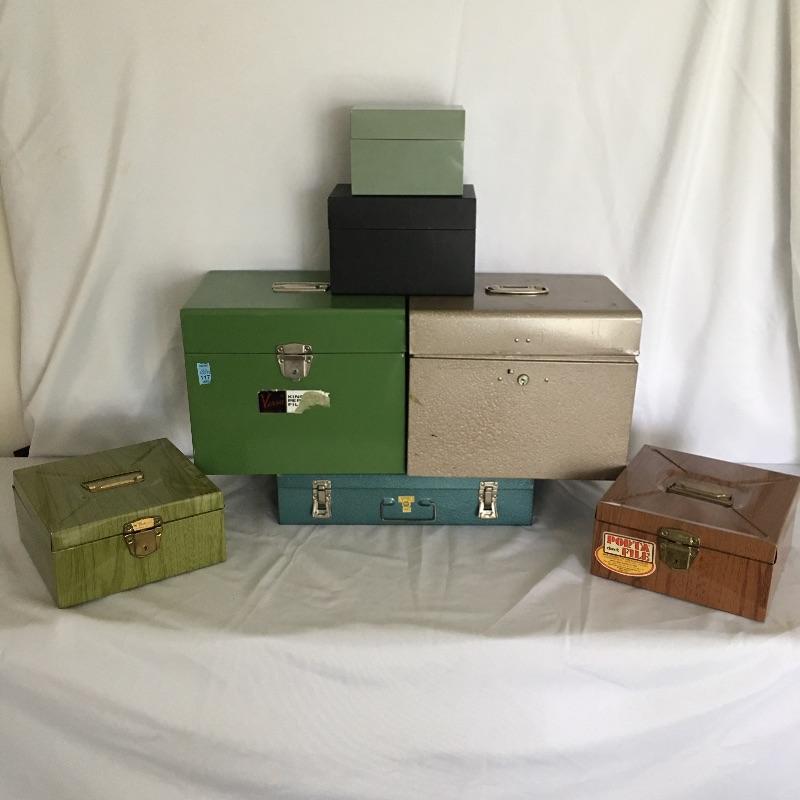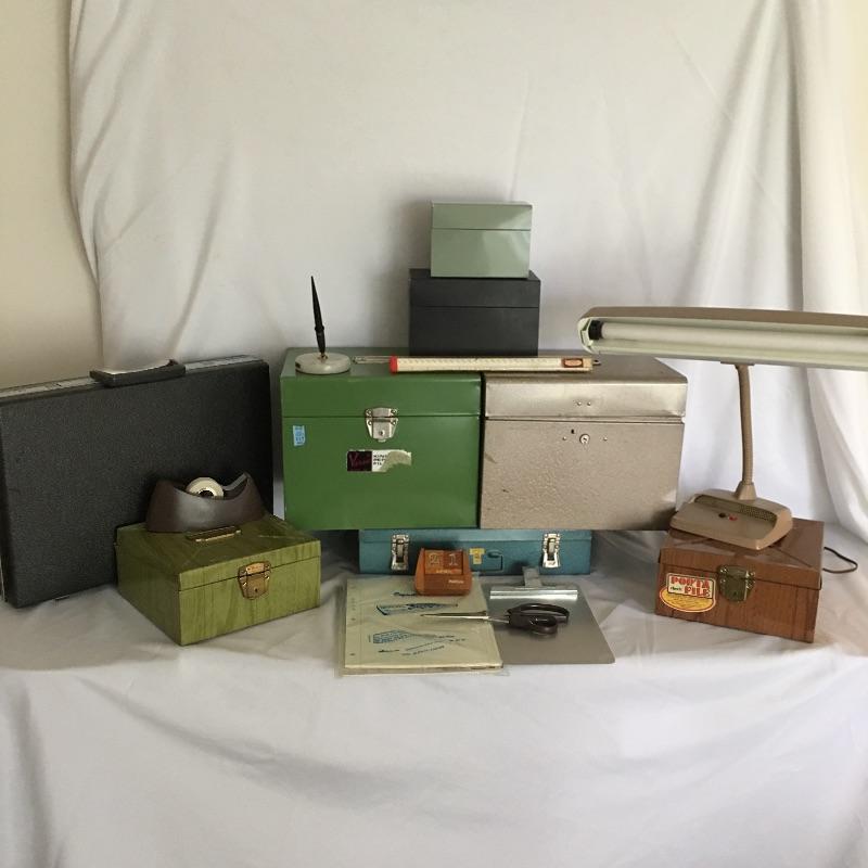 Vintage office array. Lot includes a assortment of metal boxes, tape roll, pen with stand, wooden calendar, Samsonite briefcase, Art Metal Construction brand chair, vintage lamp and more. You will kick yourself if you don’t win this lot, it is that cool.