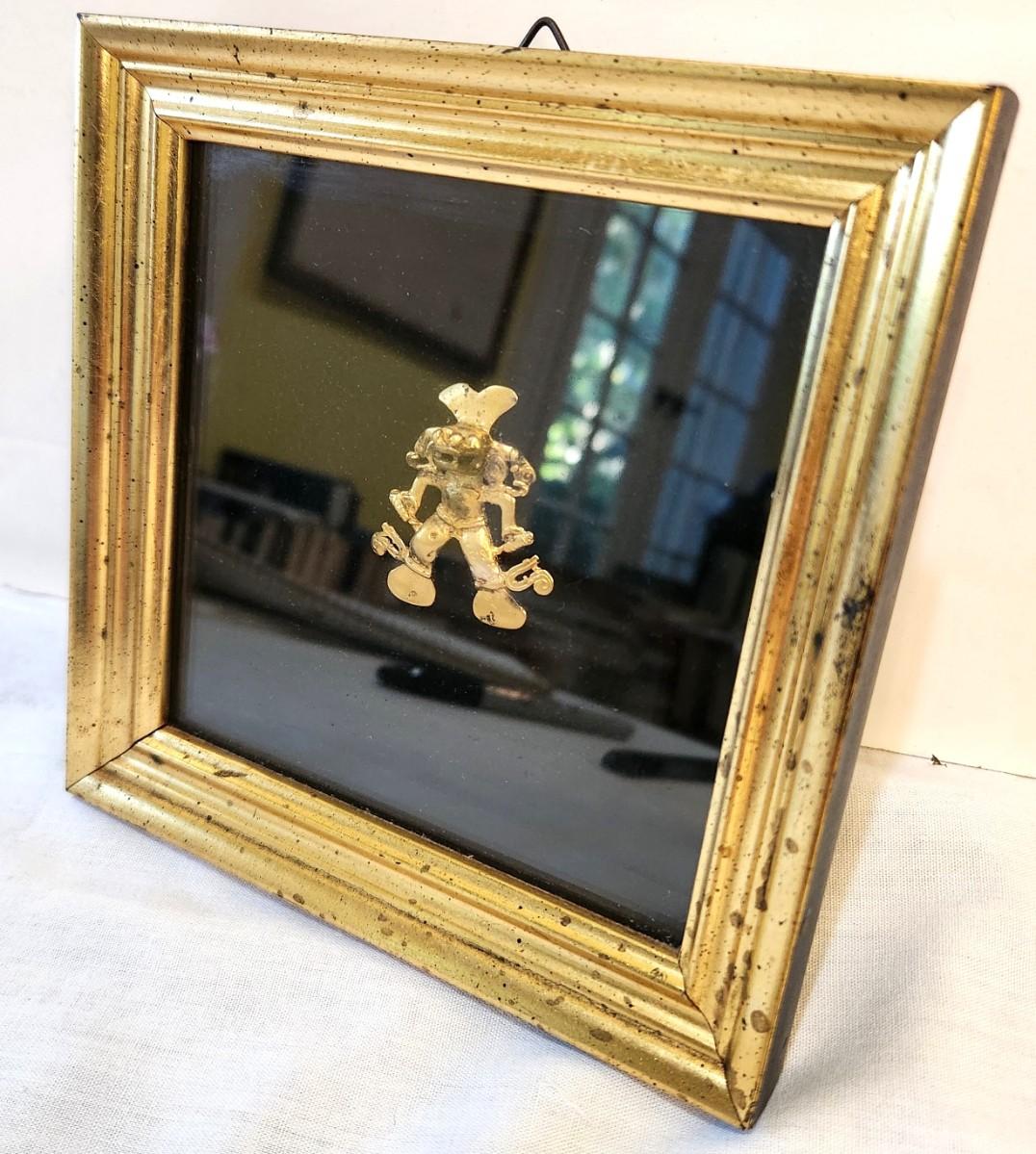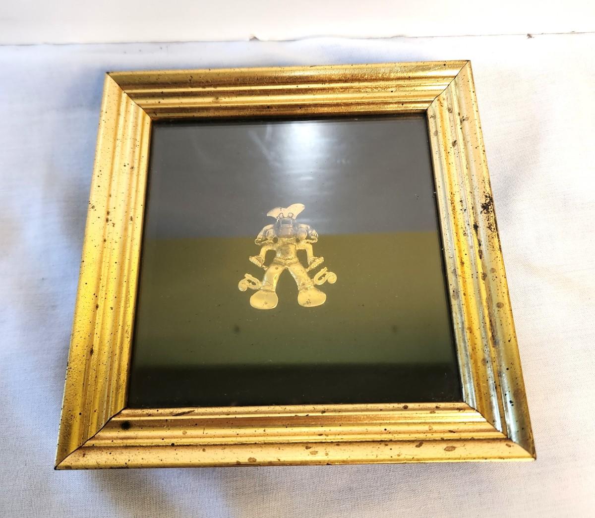Vintage Replica of a vintage Panamanian Gold Huaca, or Medicine Man in a Shadowbox frame. A Huaca is an artifact recovered from a burial mound - gold plated - a classic example of Panamanian art. 6" x 6" (frame). Good condition.