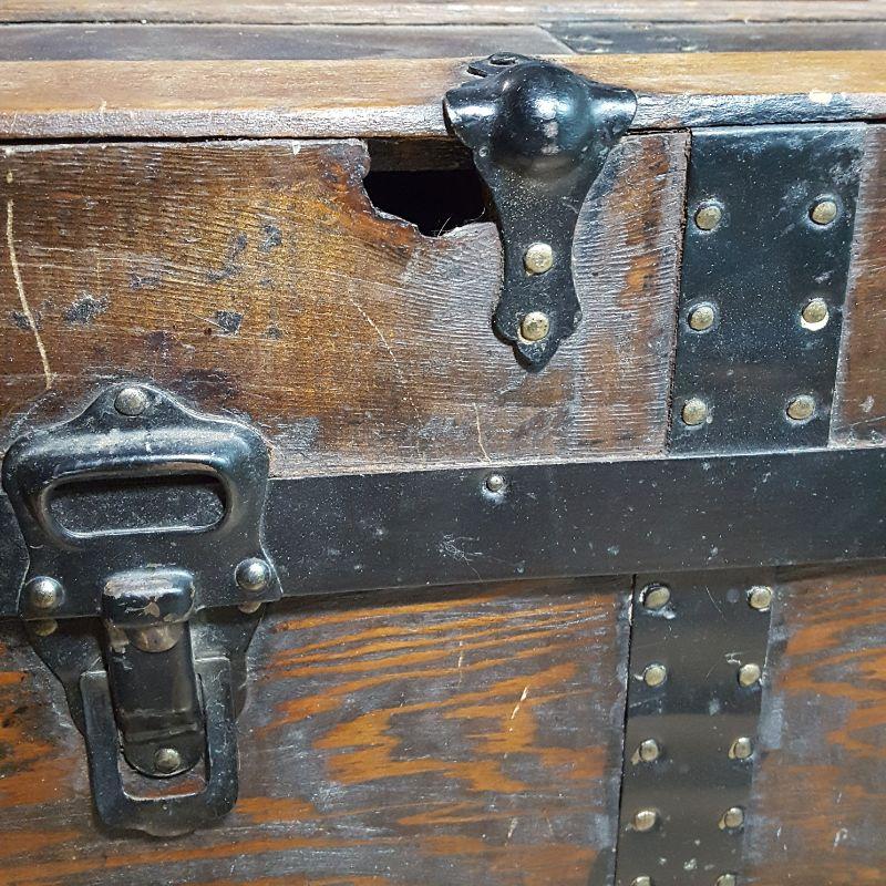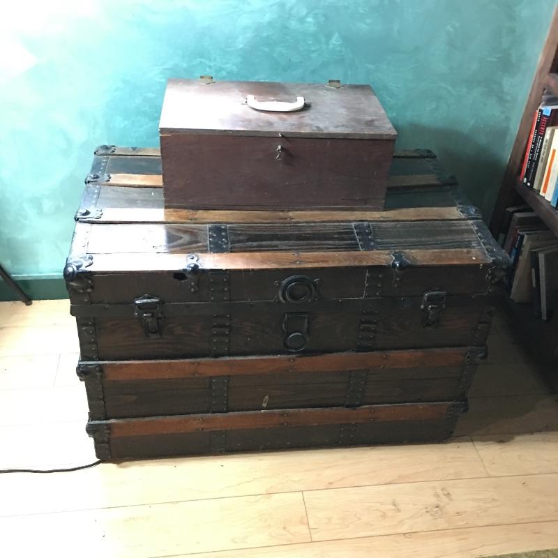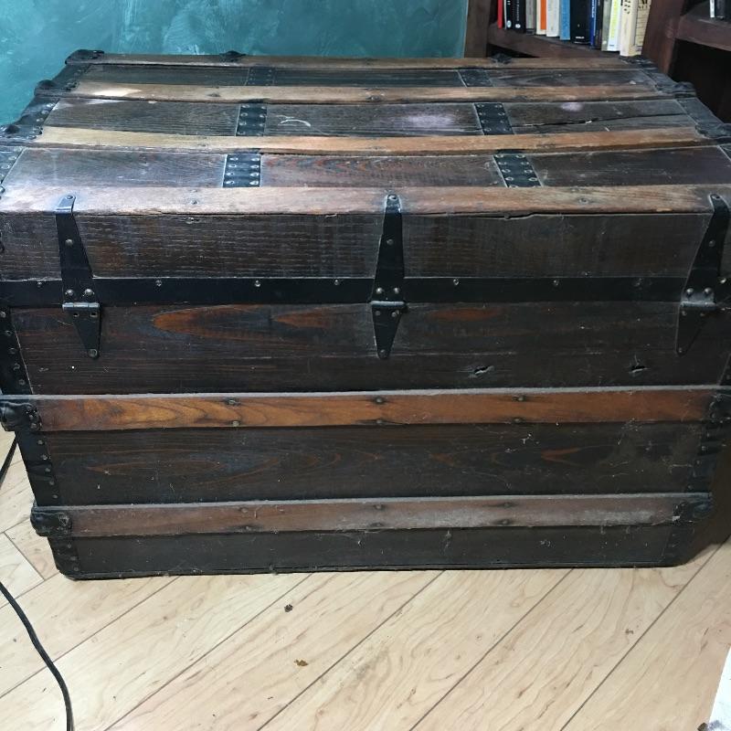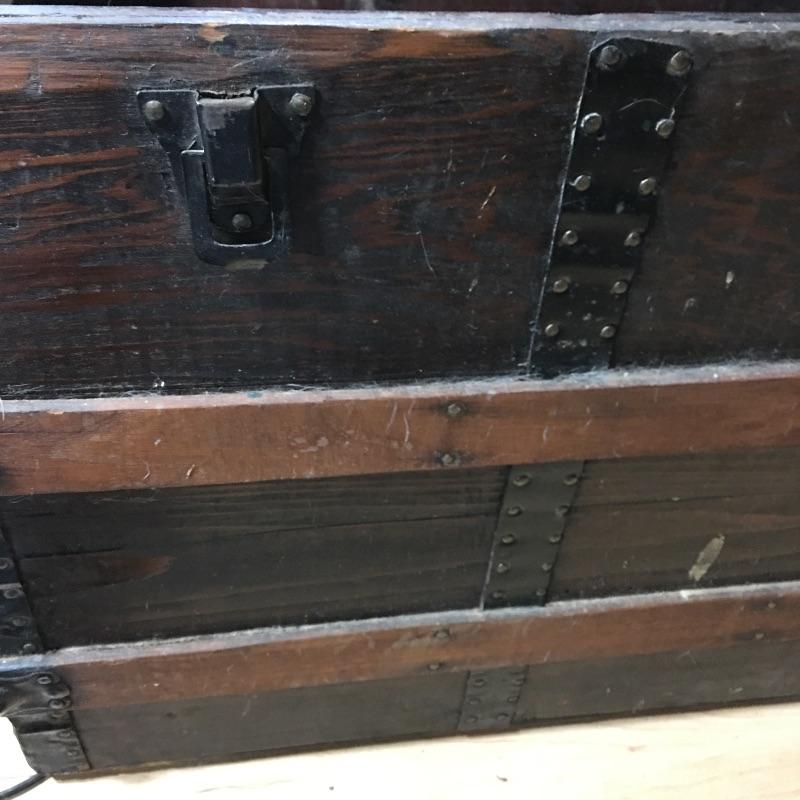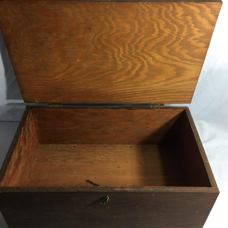 Vintage trunk and box. Lot includes plywood box and vintage trunk that measures 34.5”x 21” x 22”. Trunk is missing both side handles and one piece of side trim, see pictures. There is a small hole on the left side of the trunk next to the lock, see pictures.
