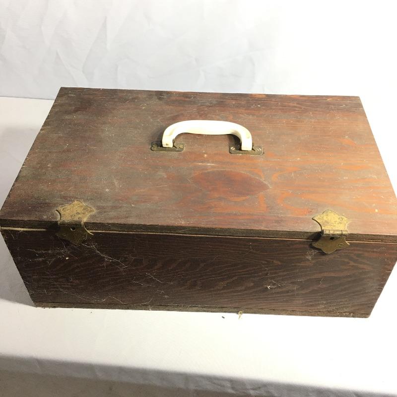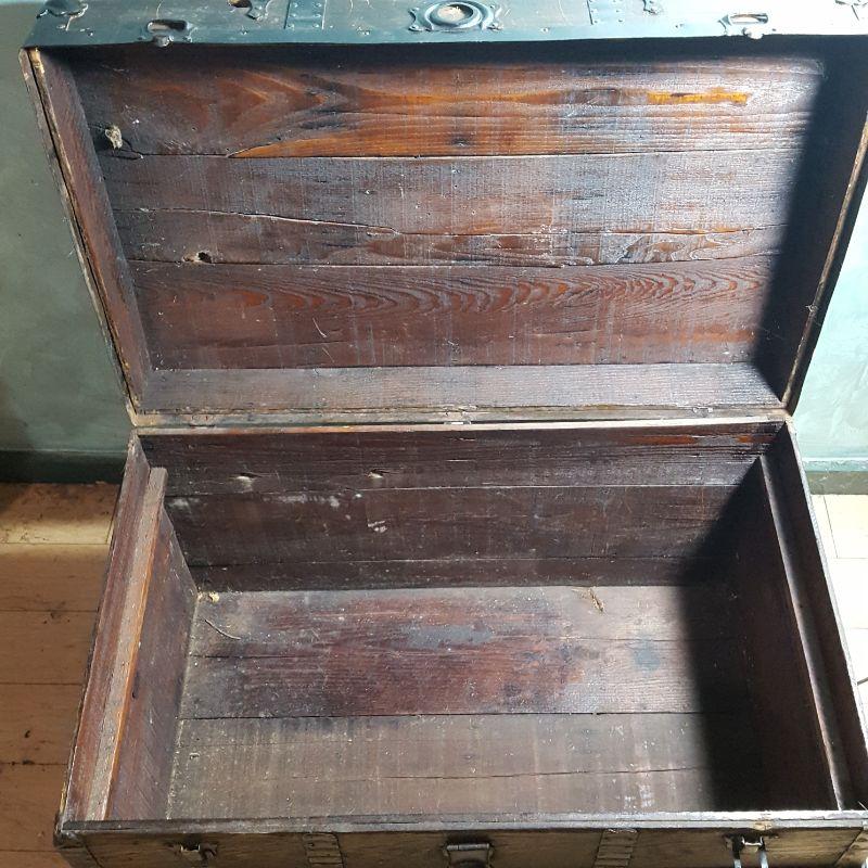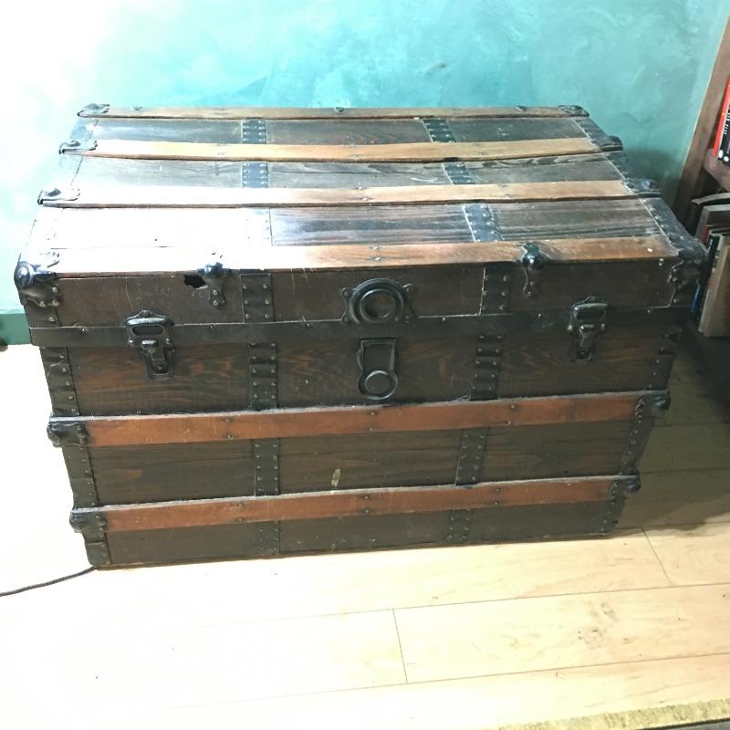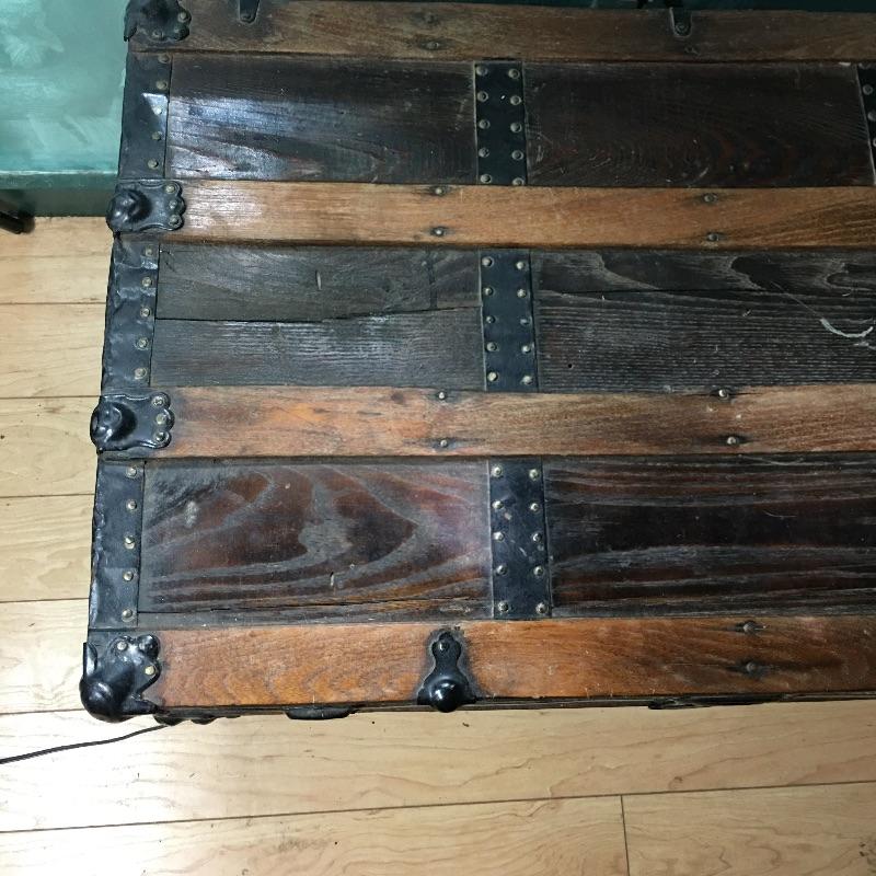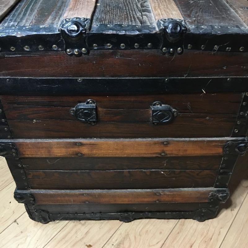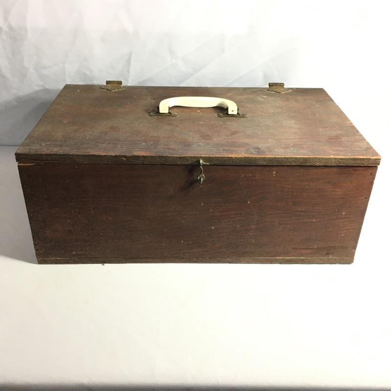 Vintage trunk and box. Lot includes plywood box and vintage trunk that measures 34.5”x 21” x 22”. Trunk is missing both side handles and one piece of side trim, see pictures. There is a small hole on the left side of the trunk next to the lock, see pictures.
