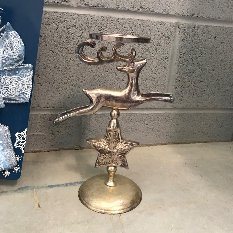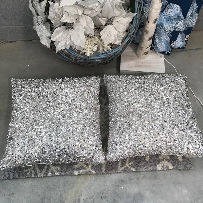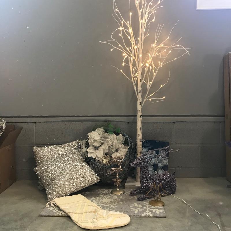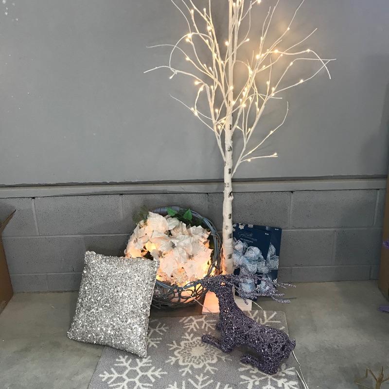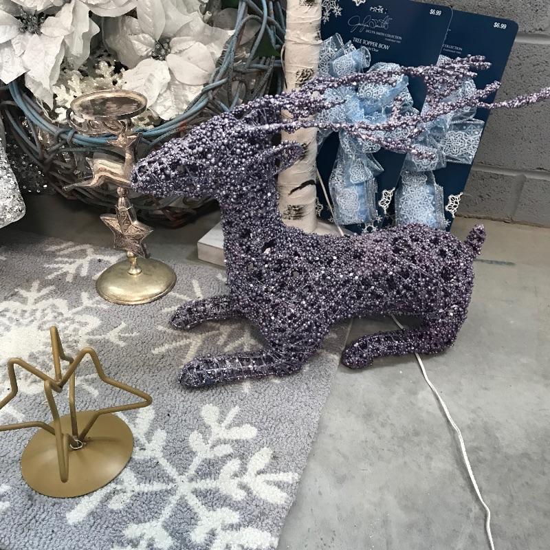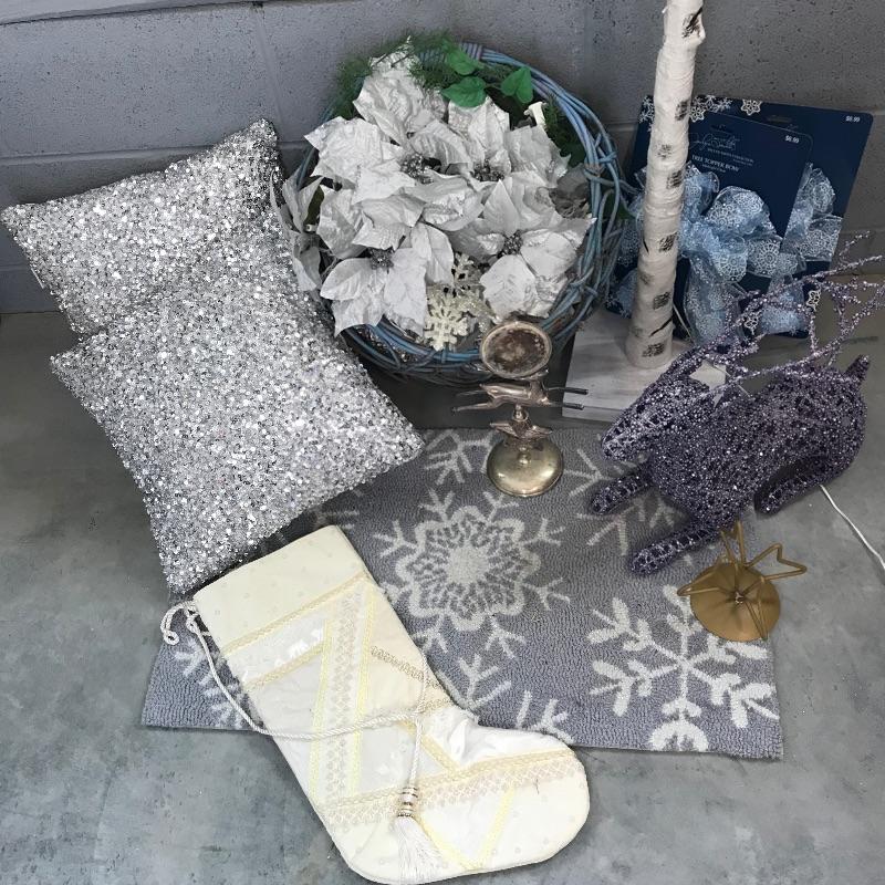 Lovely icy themed holiday decor including a lit aspen tree ready for your personal touches. A shimmering pair of silver sequin pillows with a resting lilac colored reindeer, silver plate candle holder and more! Mat measures approximately 30” x 17.5” and tree stands approximately 66”. See photos. No shipping.