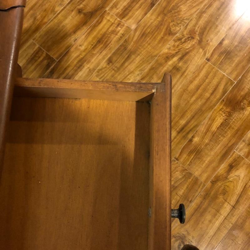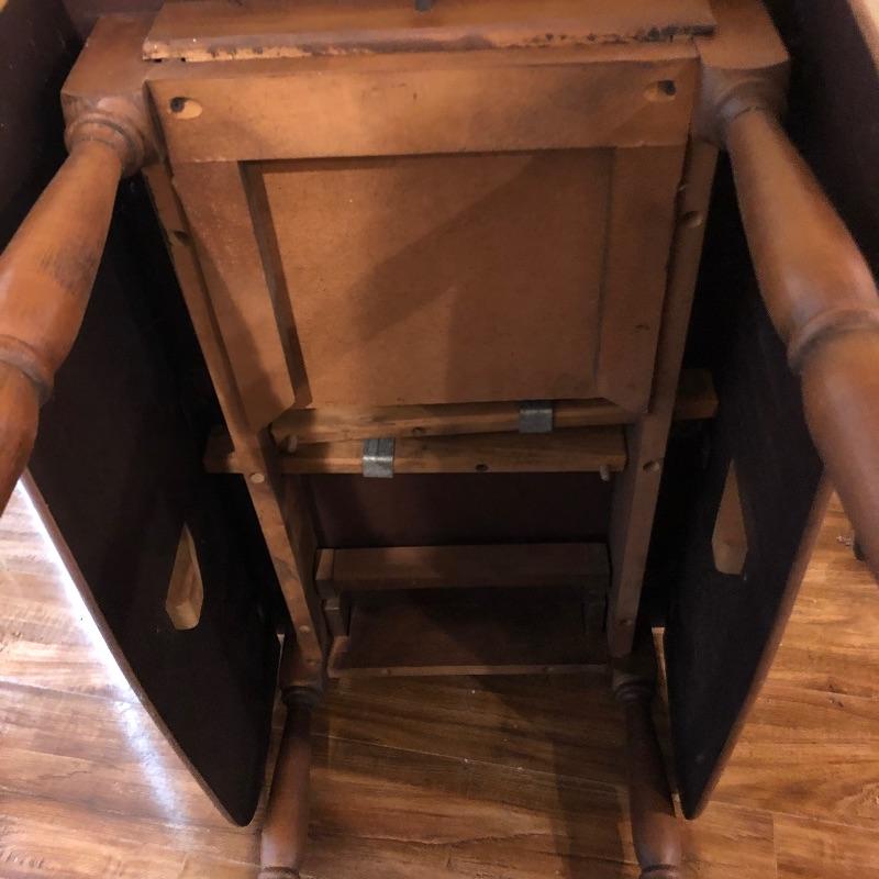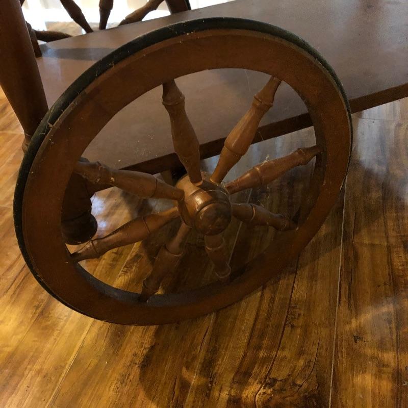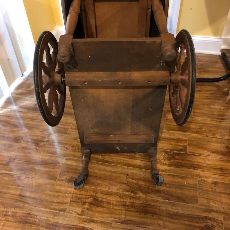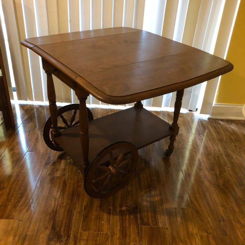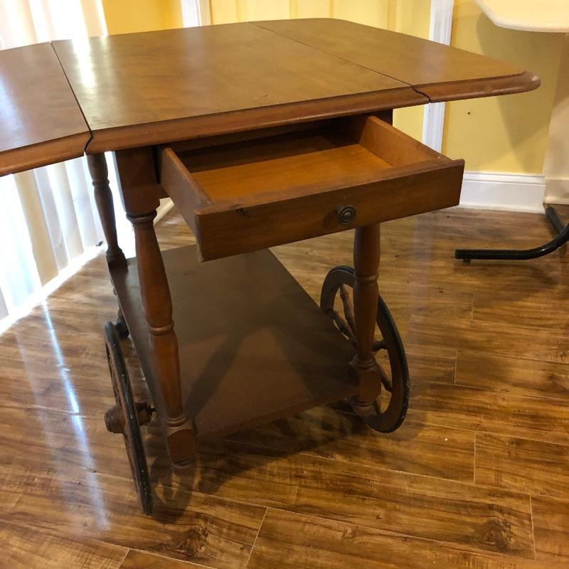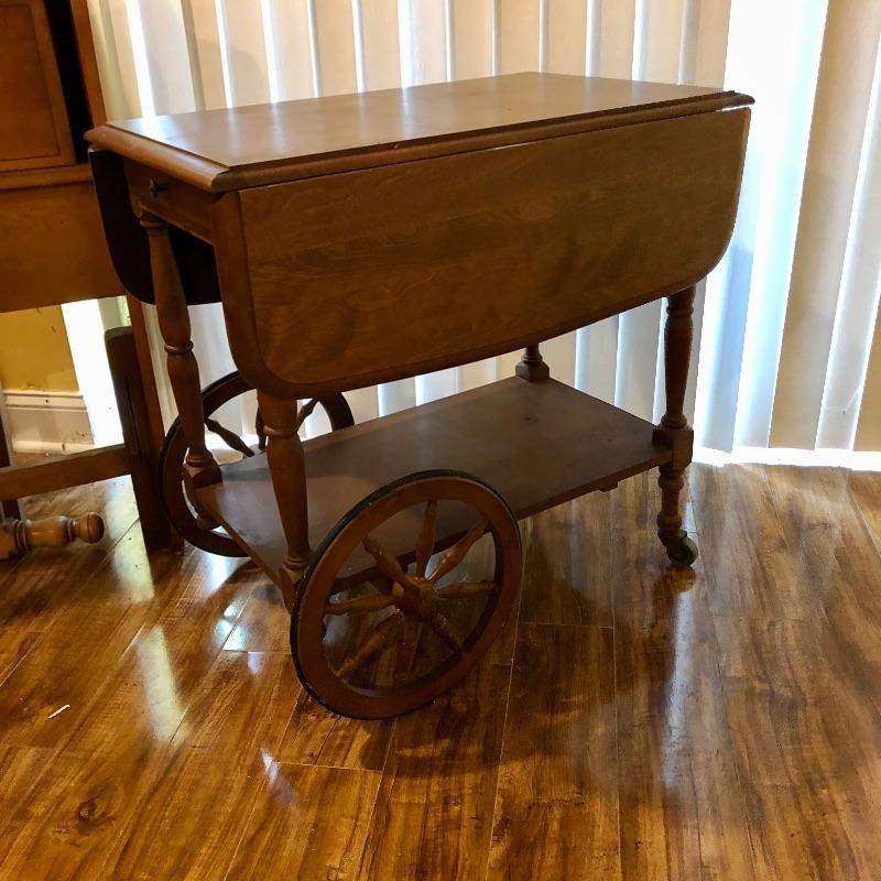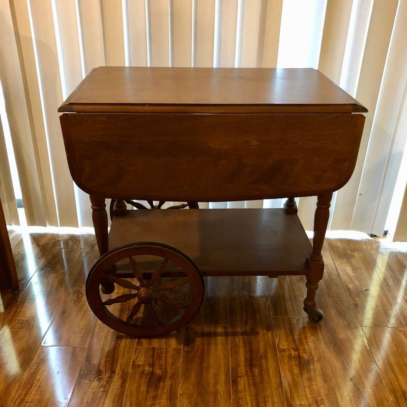 This traditional style wooden teacart is adorable with its country elegant look and versatility. It measures 32” deep x 38” wide x 29” high when fully open and 18” wide when the leaves are down. It appears to be made from a dark oak colored pressed wood.