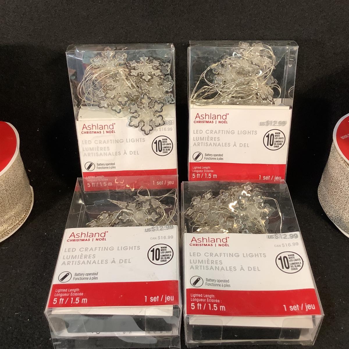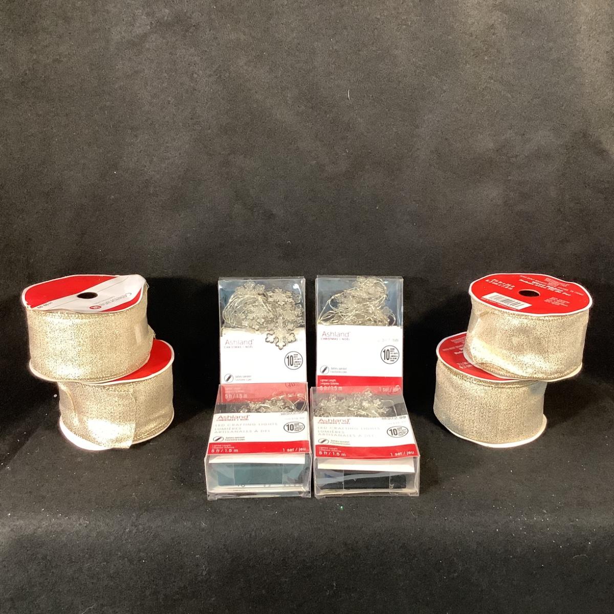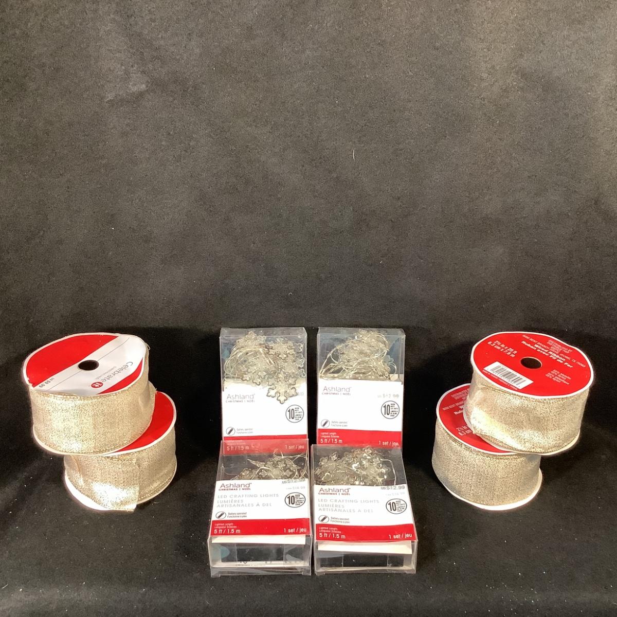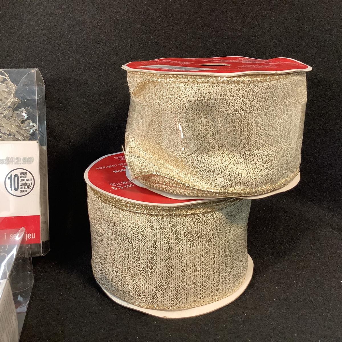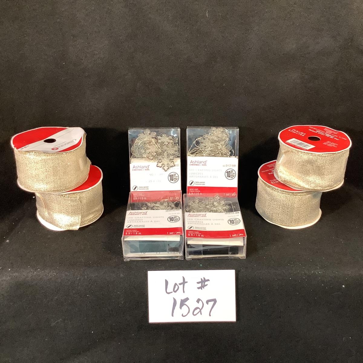 Lot 1527  Lot of Four Rolls Wired Gold/White Ribbon & Four PKG LED Snowflake Light String