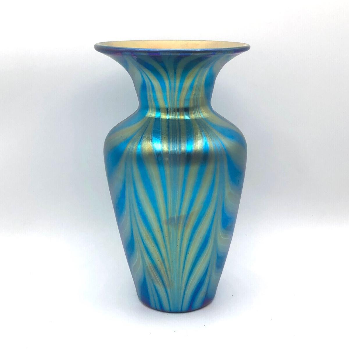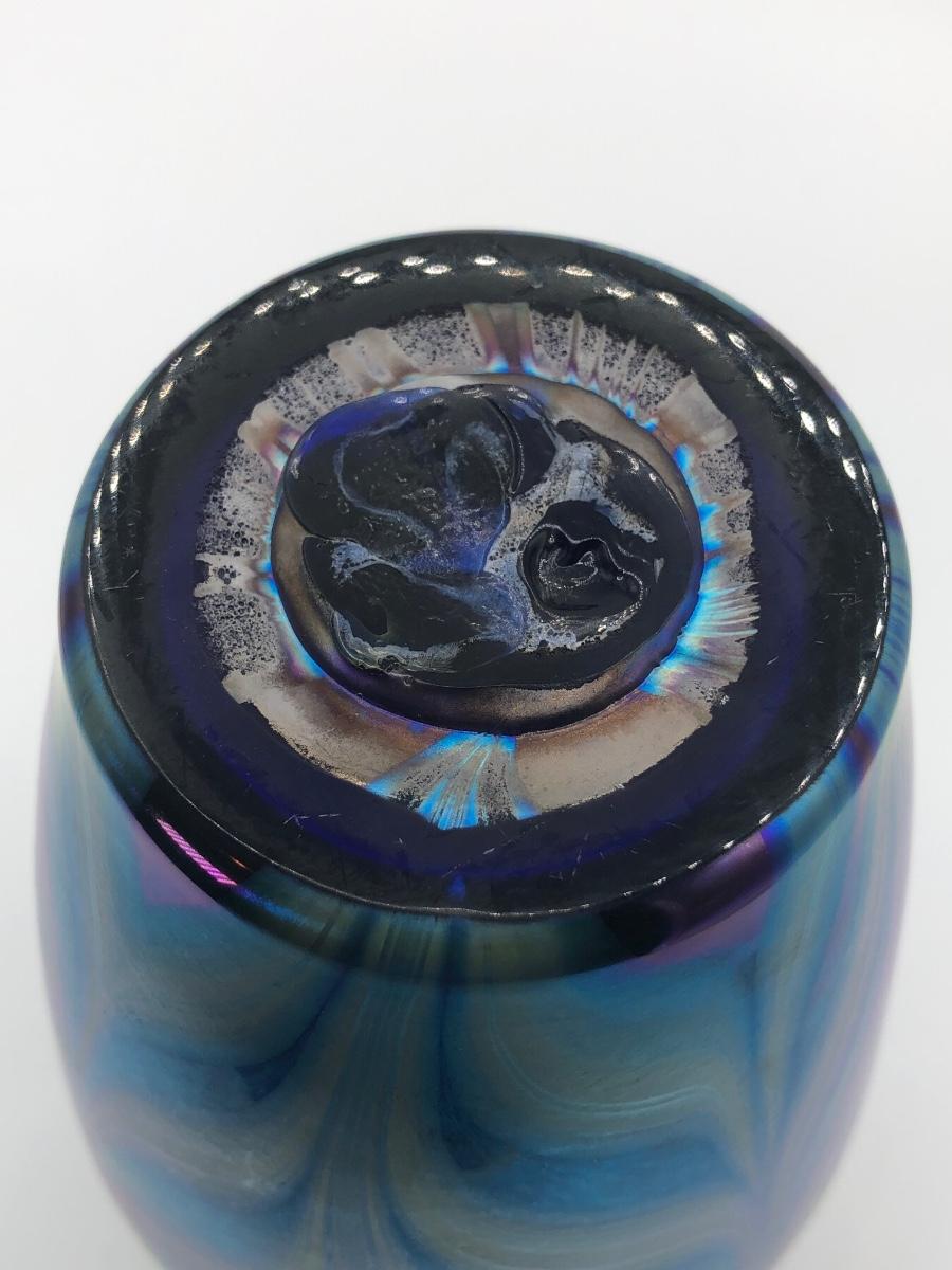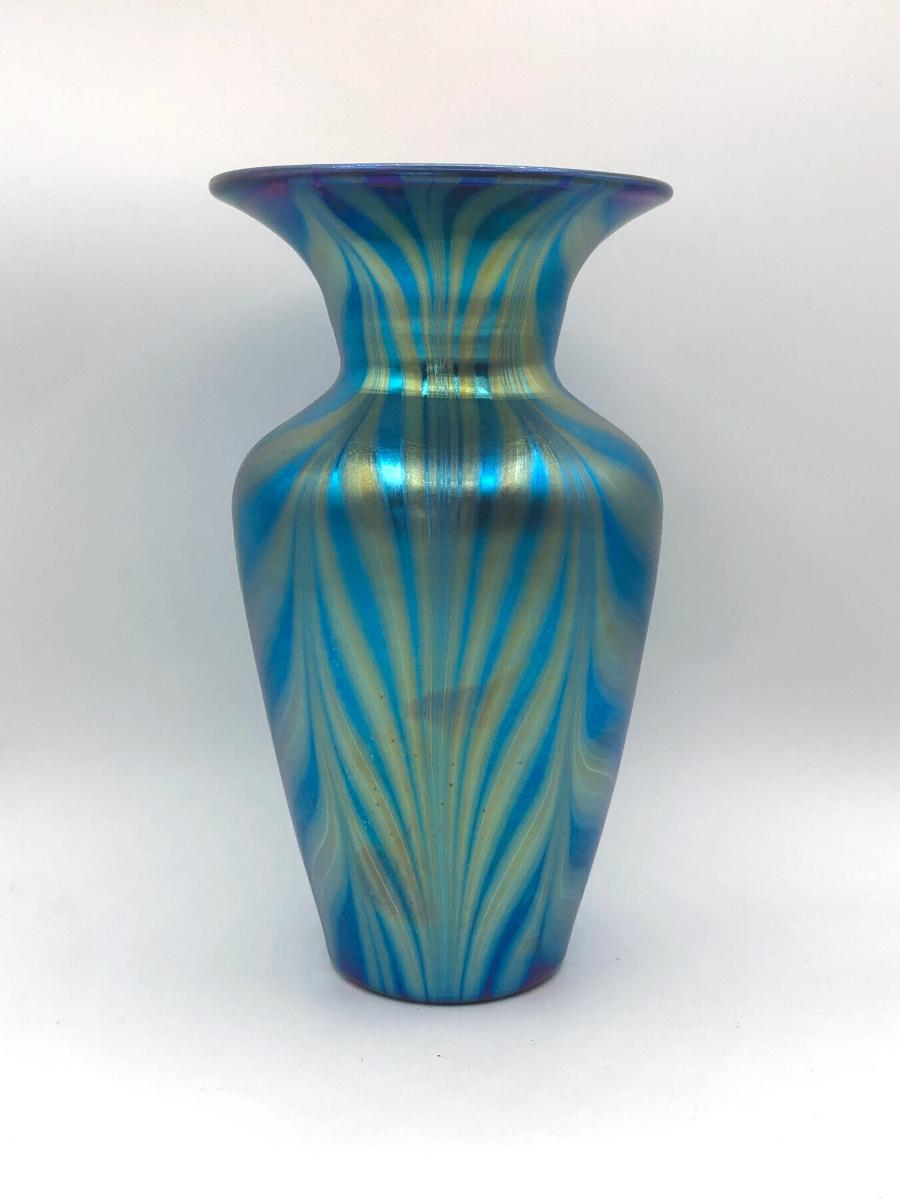 LOT 152F: Vintage Lundberg Studios Hand Blown Royal Zebra Art Glass Vase