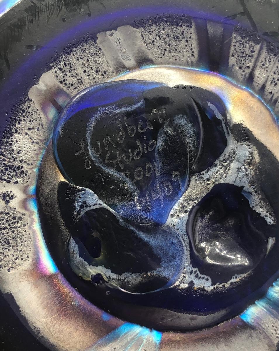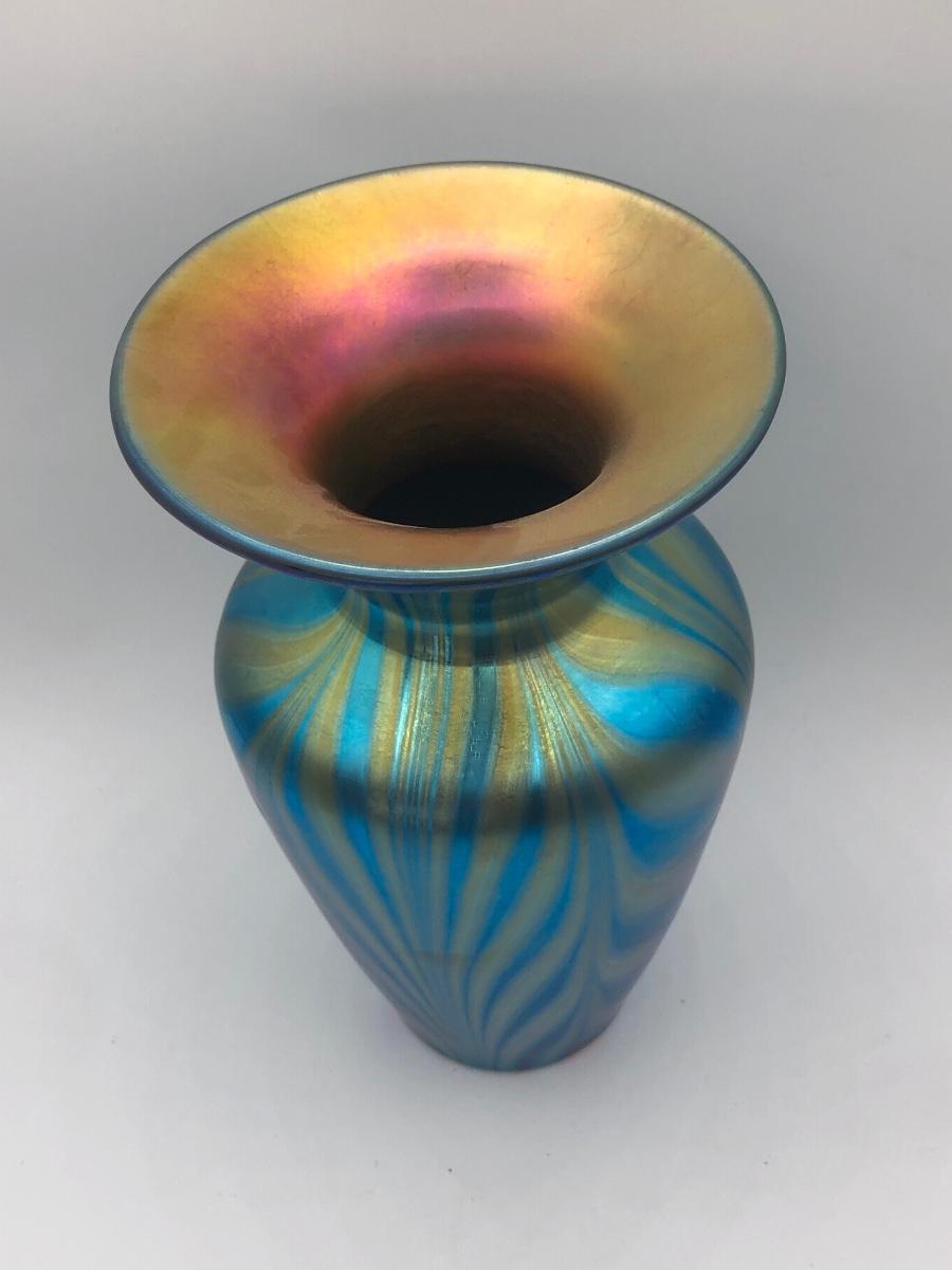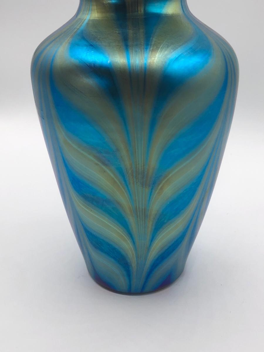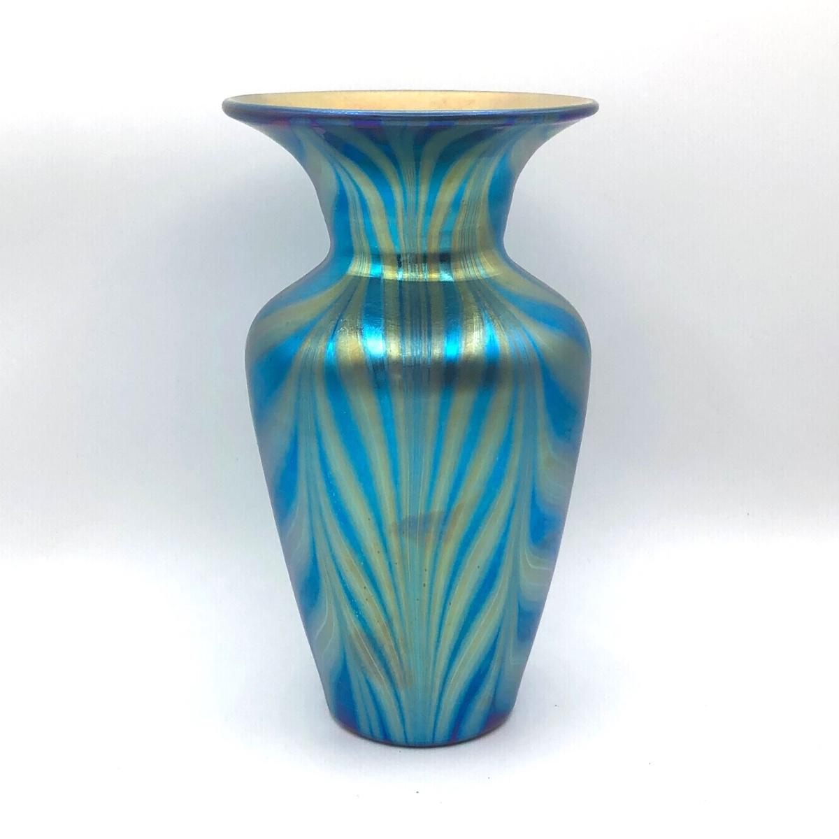 LOT 152F: Vintage Lundberg Studios Hand Blown Royal Zebra Art Glass Vase