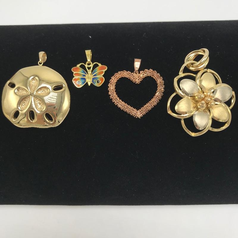 Four lovely pendants to add to your necklaces. Sand Dollar, Butterfly, Heart and Flower. All gold marked 14K or 18K. See photos for exact markings. Starting price based on melt value.