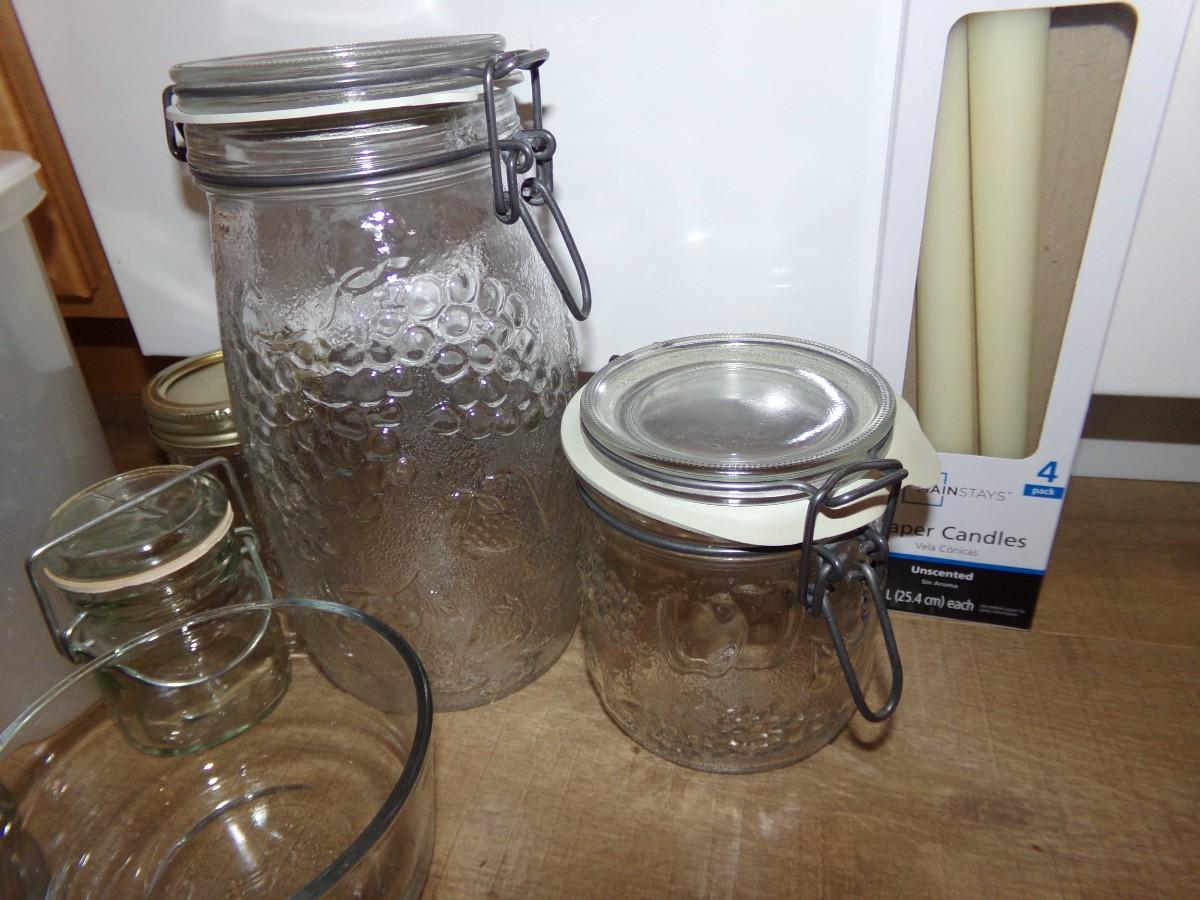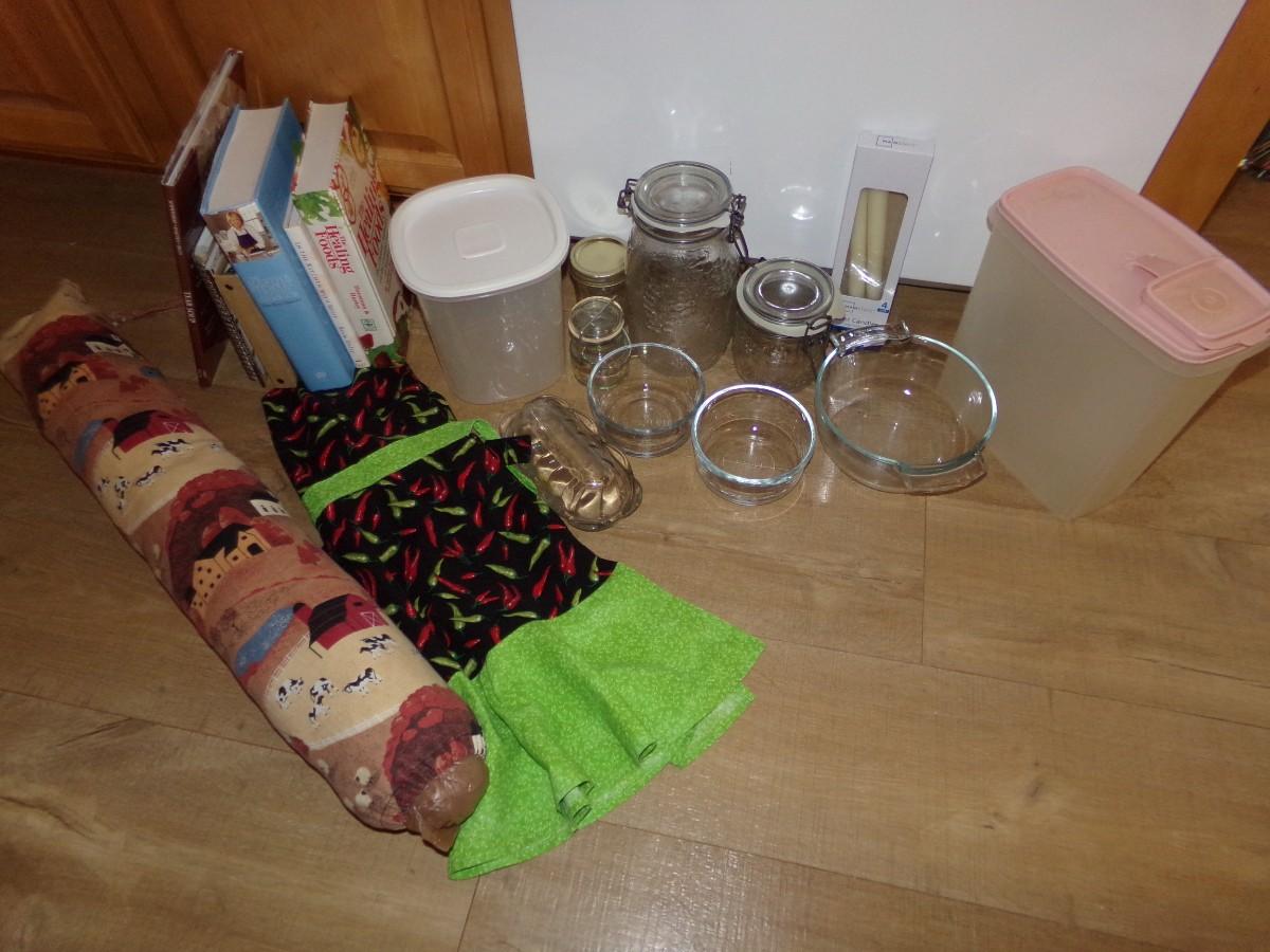 GLASS BOWLS, FEW COOKBOOKS, GROCERY BAG STORAGE SLEEVE, APRON, GLASS AND PLASTIC FOOD STORAGE CONTAINERS