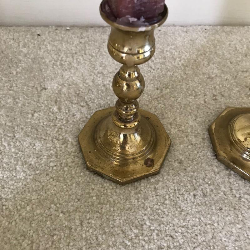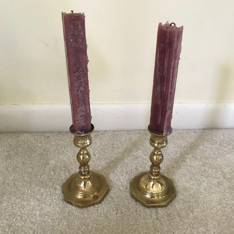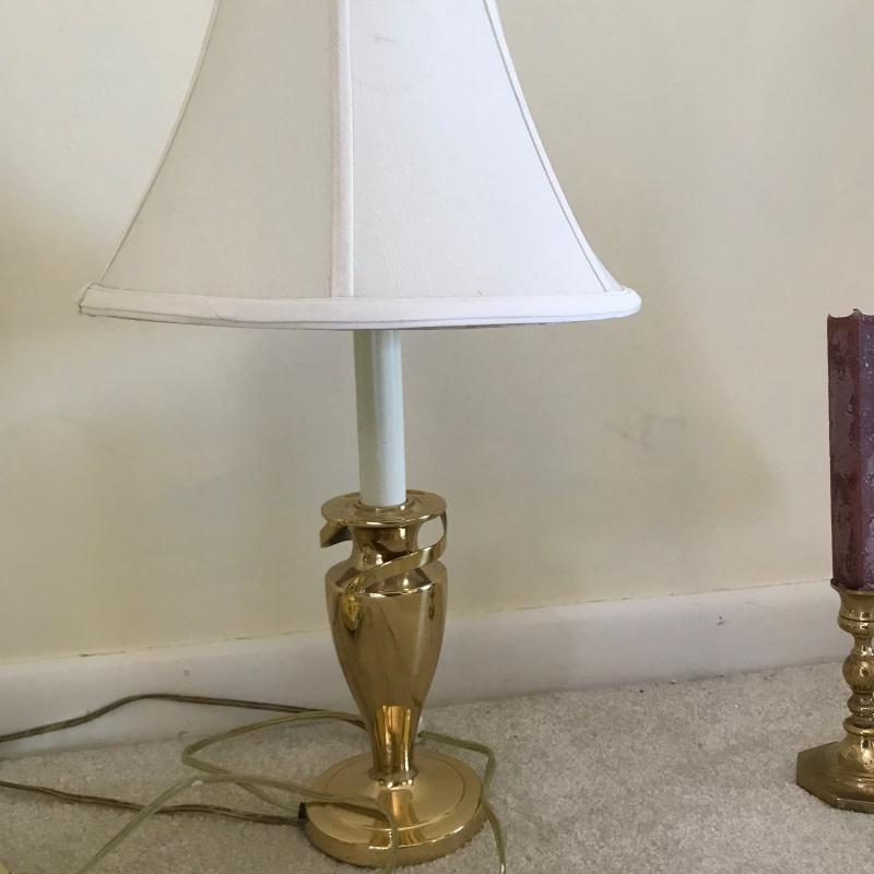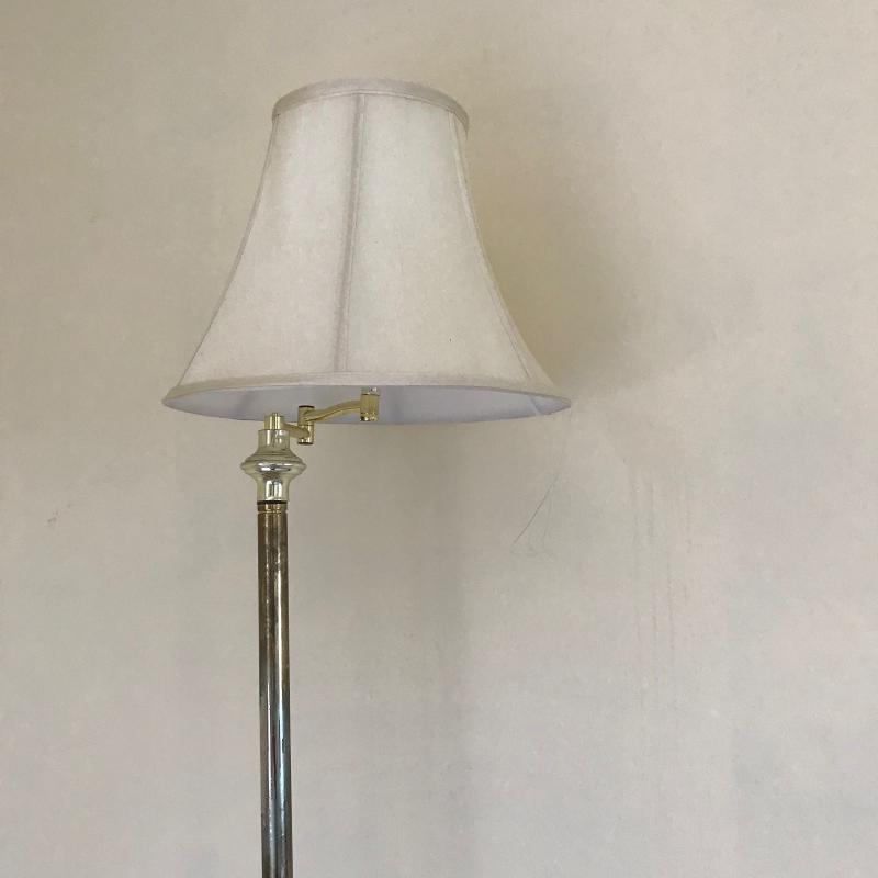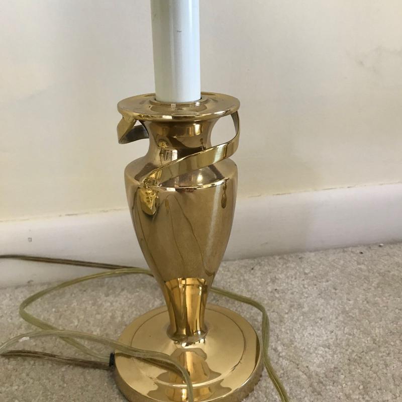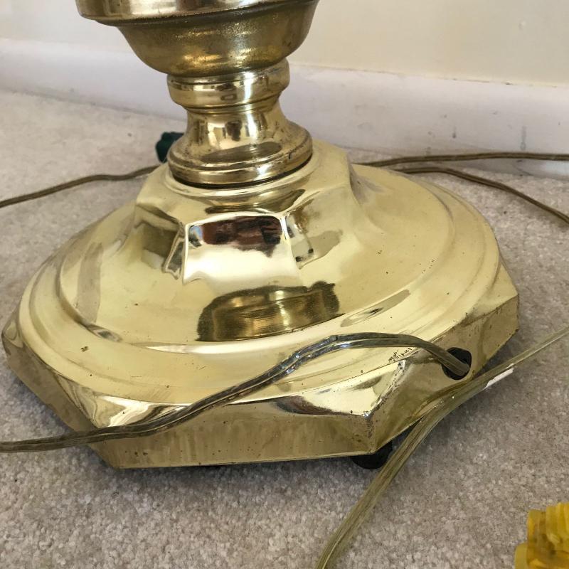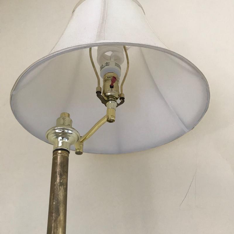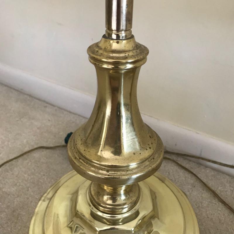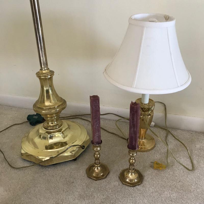 Two brass lamps and pair of candle holders. Candle holders are pretty worn. Standing lamp has swivel arm and measures without shade 11” d x 58”h. Lot also includes a table top lamp. No shipping.