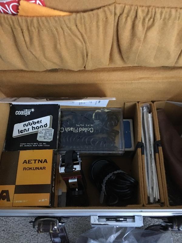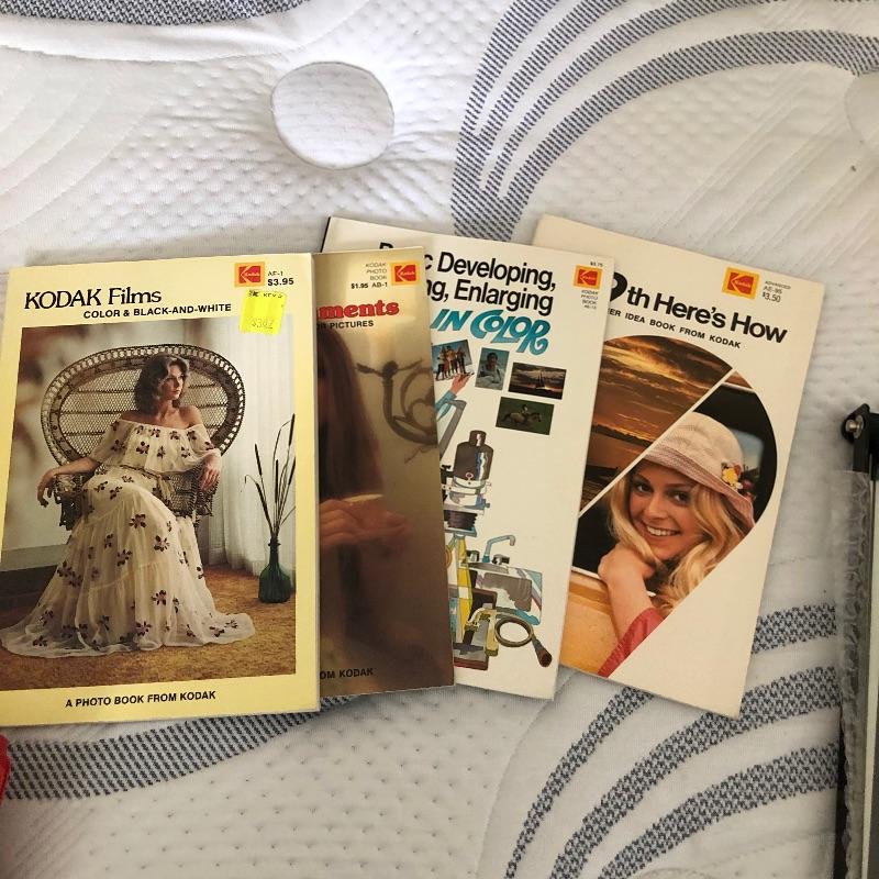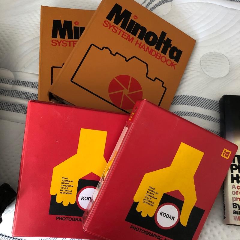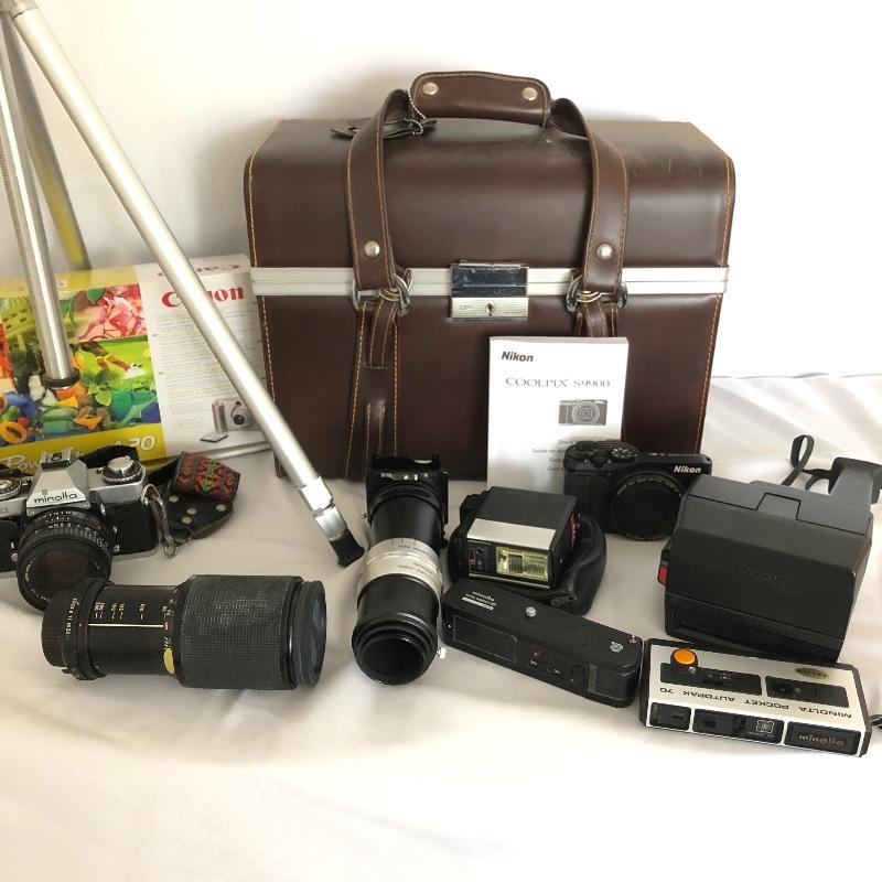 Large assortment of cameras, accessories, manuals and books. Included is a Canon Powershot A20 with box, a Minolta film camera with auto winder, a Coolpix S9900 and more cameras Take a closer look at images for more details on the cameras and lenses etc. Also included is a Vivitar tripod, light filters, a Vivitar 43 light meter, vintage retro camera case that appears to be leather, darkroom proof sheet tray, books, magazines, system handbooks and more.