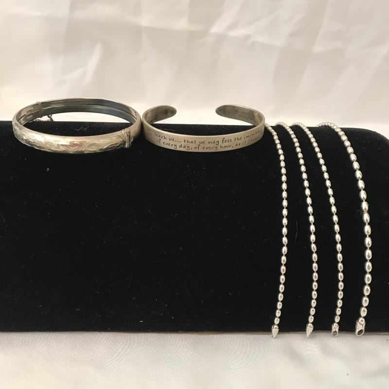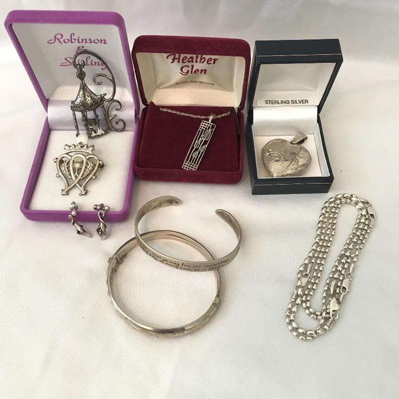 Contemporary and classic styles here found in both fairly unique and popular pieces. Lot holds a nice 925 rectangular pendant on a standard 925 chain with almost an Arts & Crafts style design. Lot includes Stewart NYE 925 earrings( the dangles need to be more securely attached or place them behind your favorite stud) , Two 925 pins and a 1.5” x 1.5” heart locket pendant will steal the show! Four small clasped bracelets perfect to layer or add one for simple bling. Lastly, a pewter like cuff with a Jane Austen quote and an English cuff with delicate etchings marked dvb925. Shipping available. Bidding starts at or near melt value.