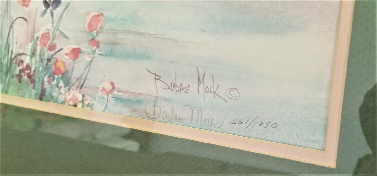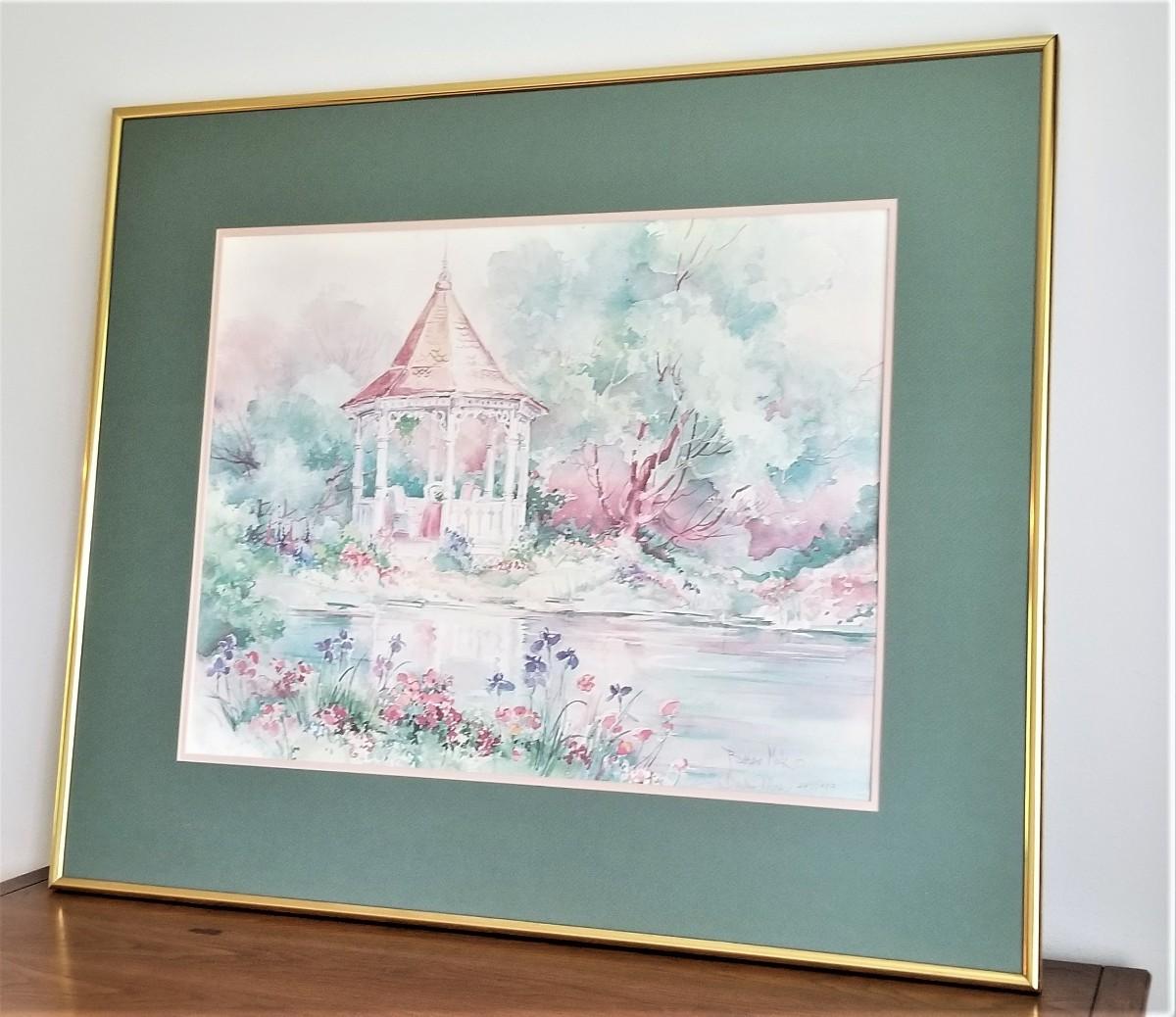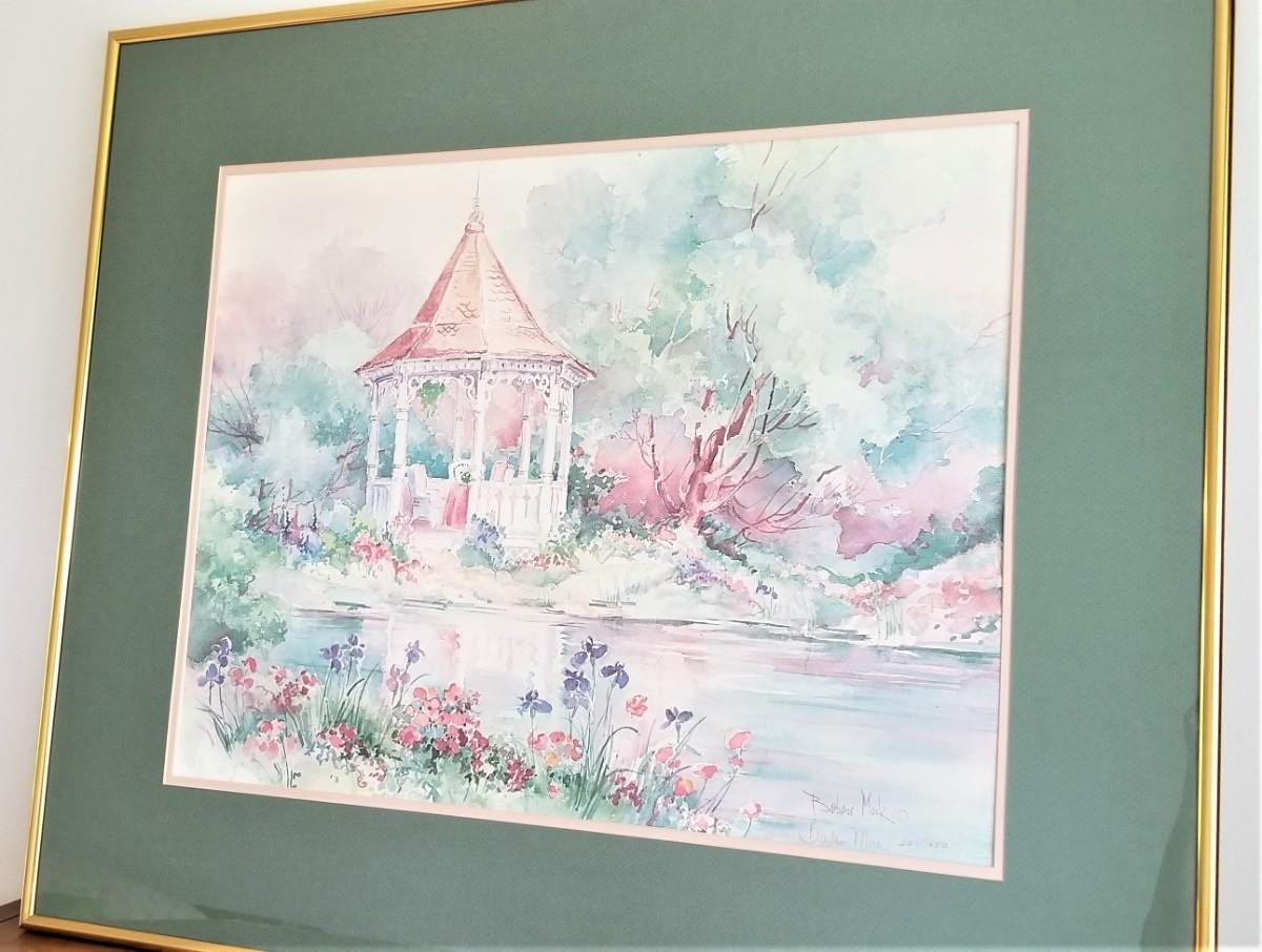 Signed/numbered ltd edition print (261/1950, pencil signed by artist) by Listed artist Barbara Mock. Gazebo, Spring garden scene - double matted, measures 36" across, 30" tall. Good condition.