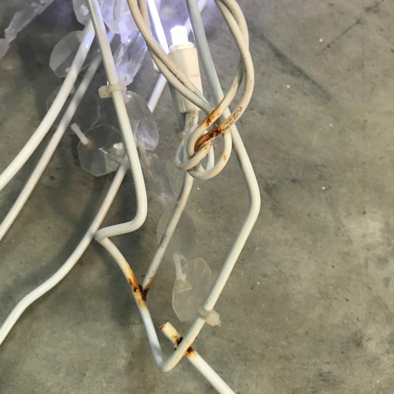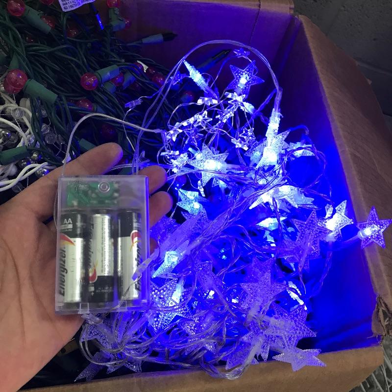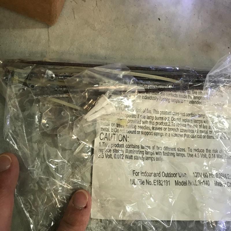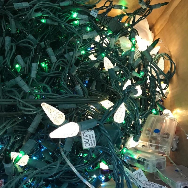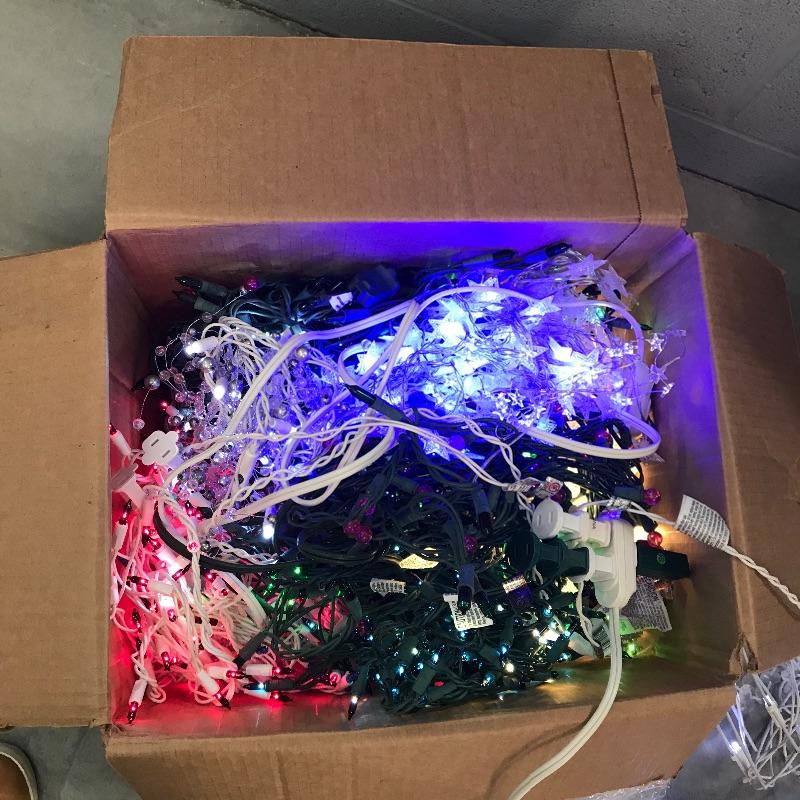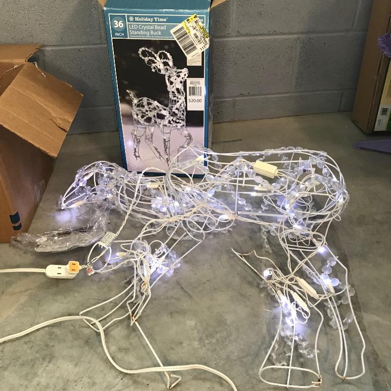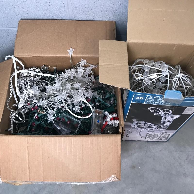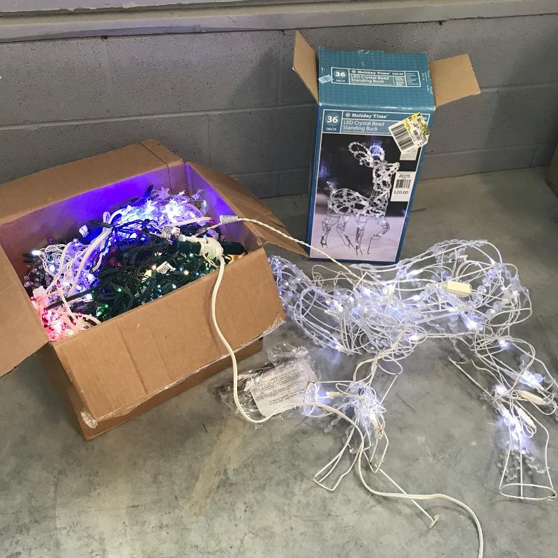 Light up this season with a big box of holiday string lights and a “crystal” yard reindeer. The box full of lights measures 16.5” x 13” x 12.5” and contains traditional colored lights, small pink bulbs, stars and more. Most can be plugged in while a few are battery operated. All the strands tested and worked but not all were tested. Lot also contains a 3’ LED “crystal” bead standing buck. The white metal shows some rust, all lights on buck appear to work. See photos. No shipping.